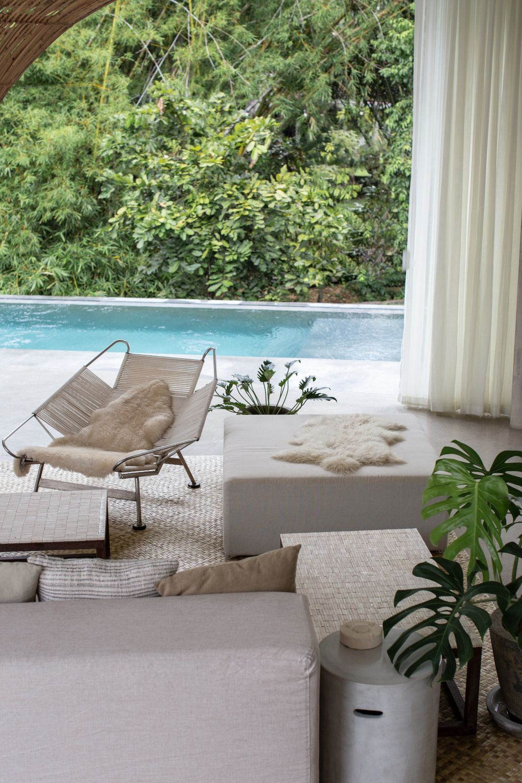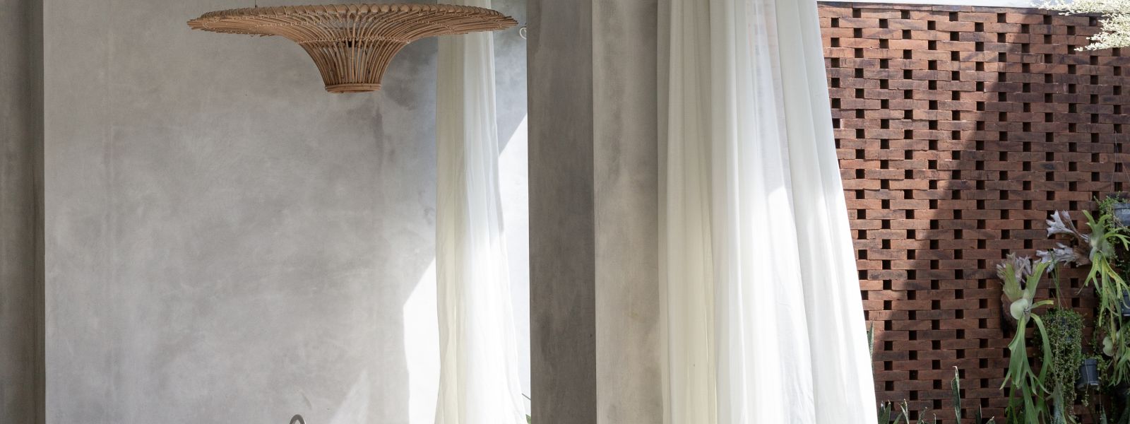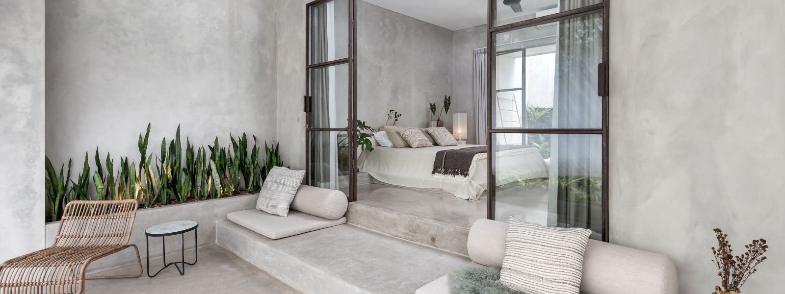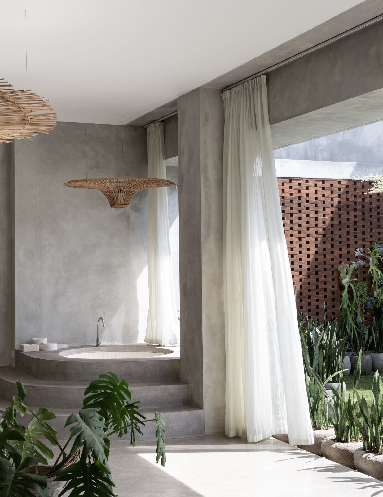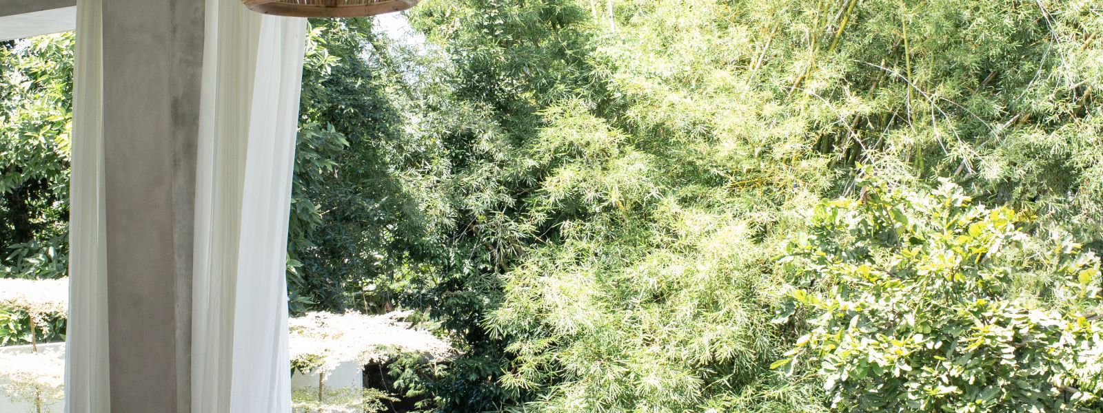 This villa showcases a refined blend of raw architectural elements and natural warmth, highlighted by its use of exposed concrete, wood accents, and lush greenery. The design feels grounded yet inviting, with handcrafted details such as the statement bamboo chandelier adding a unique artistic touch. Natural light fills the open-plan space, enhancing the textures and creating a calm, airy atmosphere throughout.