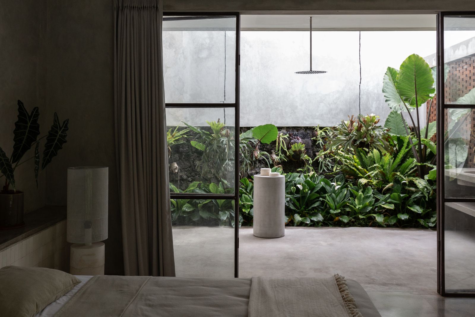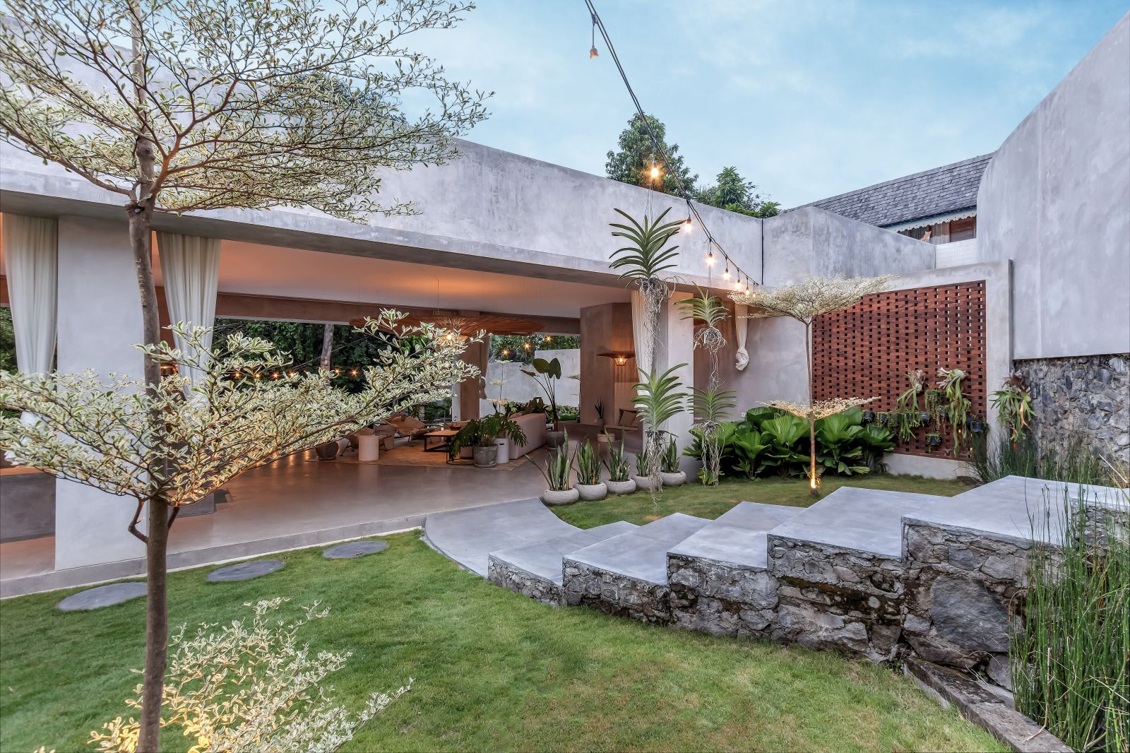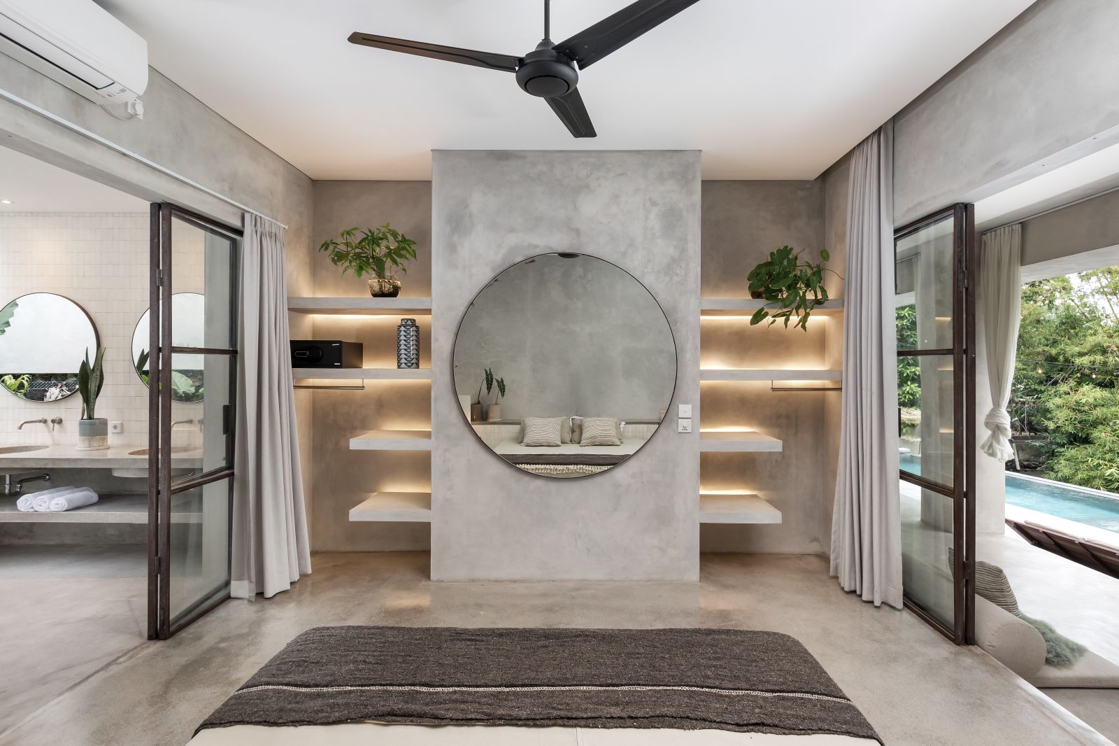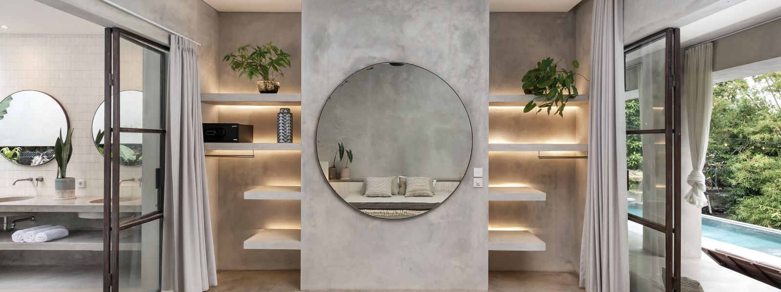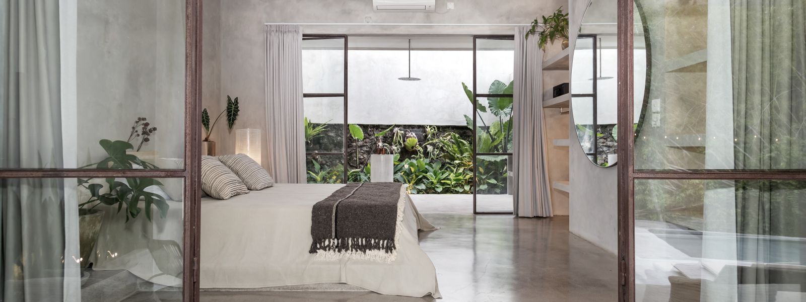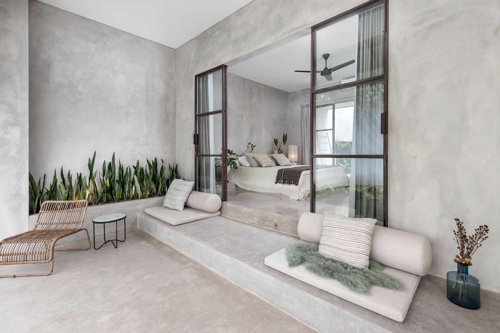 This villa showcases a refined blend of raw architectural elements and natural warmth, highlighted by its use of exposed concrete, wood accents, and lush greenery. The design feels grounded yet inviting, with handcrafted details such as the statement bamboo chandelier adding a unique artistic touch. Natural light fills the open-plan space, enhancing the textures and creating a calm, airy atmosphere throughout.