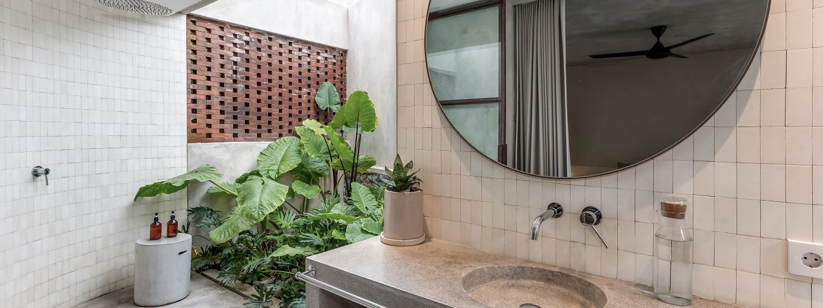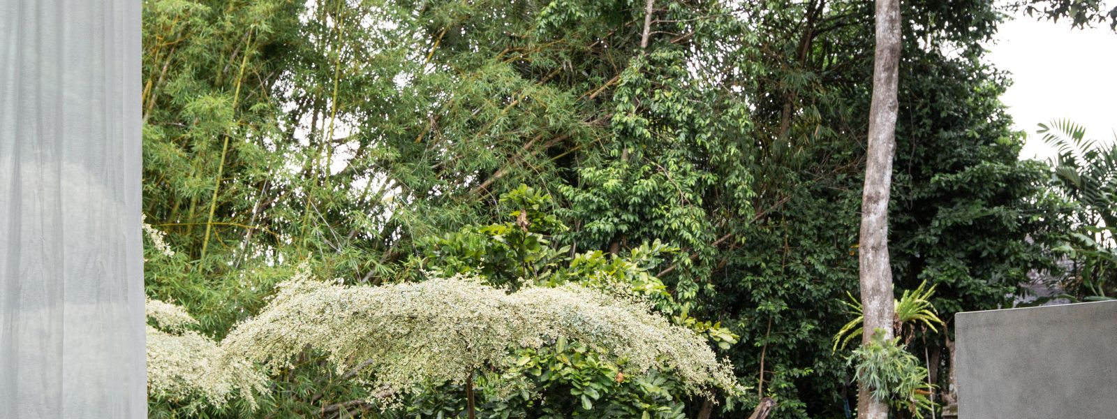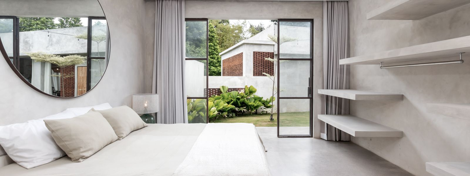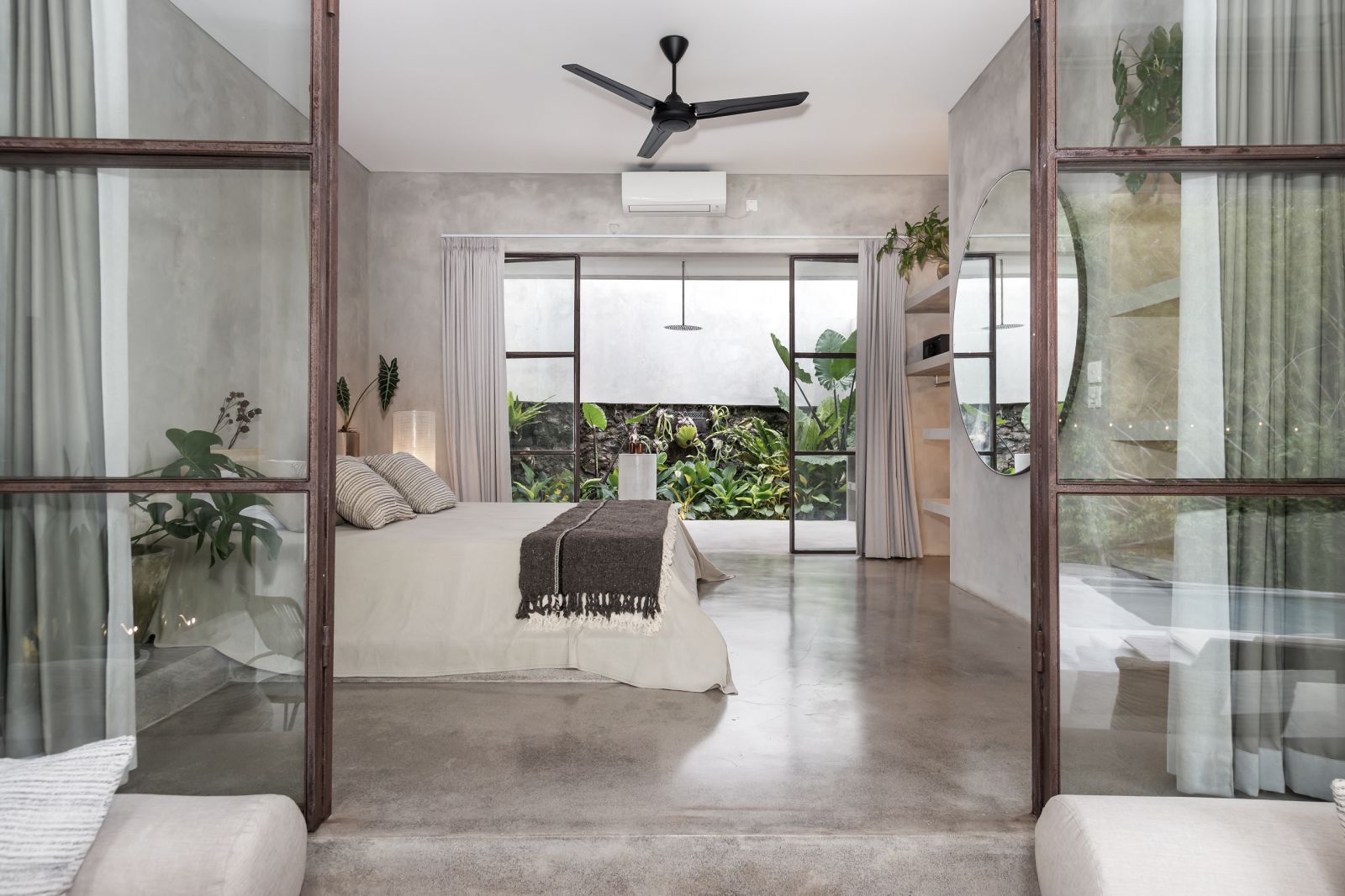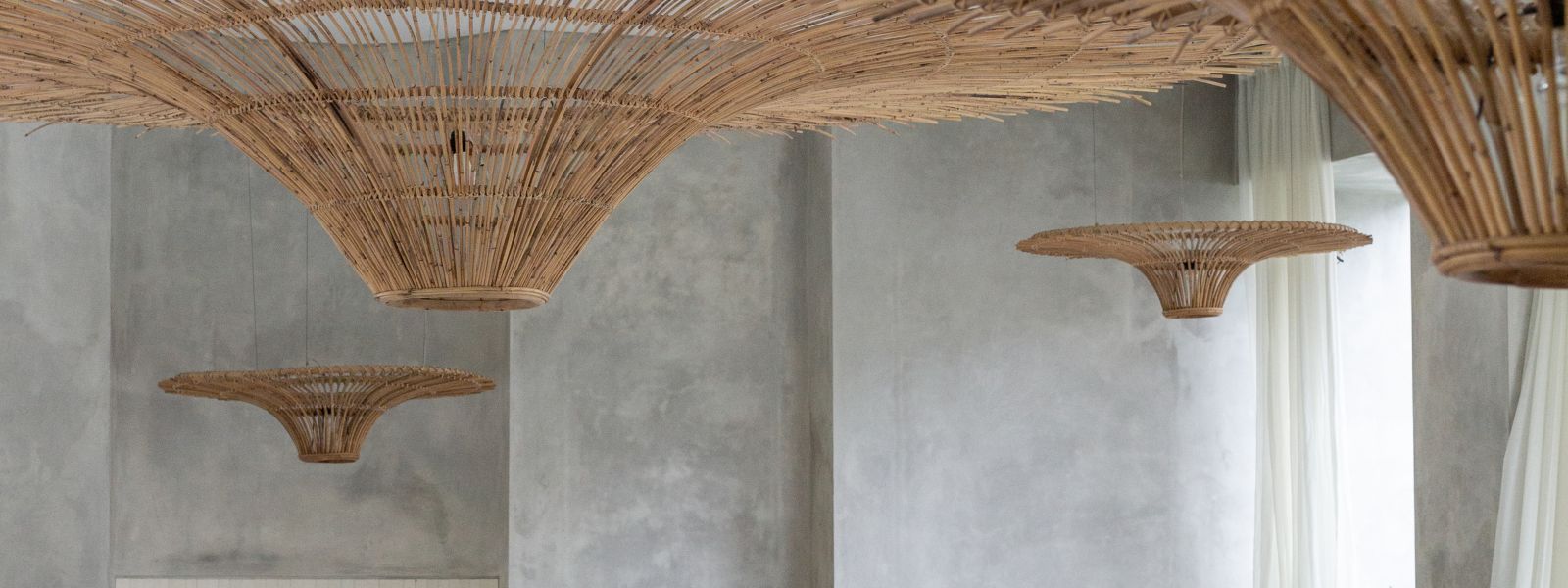 This villa showcases a refined blend of raw architectural elements and natural warmth, highlighted by its use of exposed concrete, wood accents, and lush greenery. The design feels grounded yet inviting, with handcrafted details such as the statement bamboo chandelier adding a unique artistic touch. Natural light fills the open-plan space, enhancing the textures and creating a calm, airy atmosphere throughout.