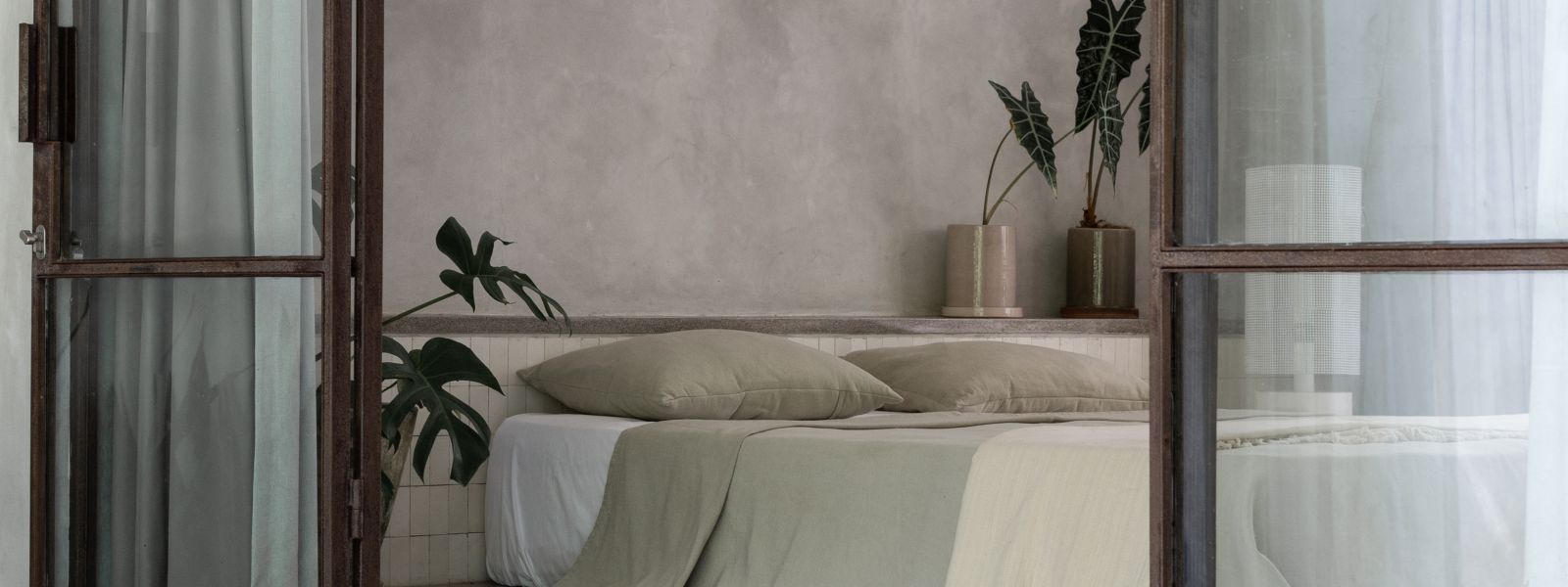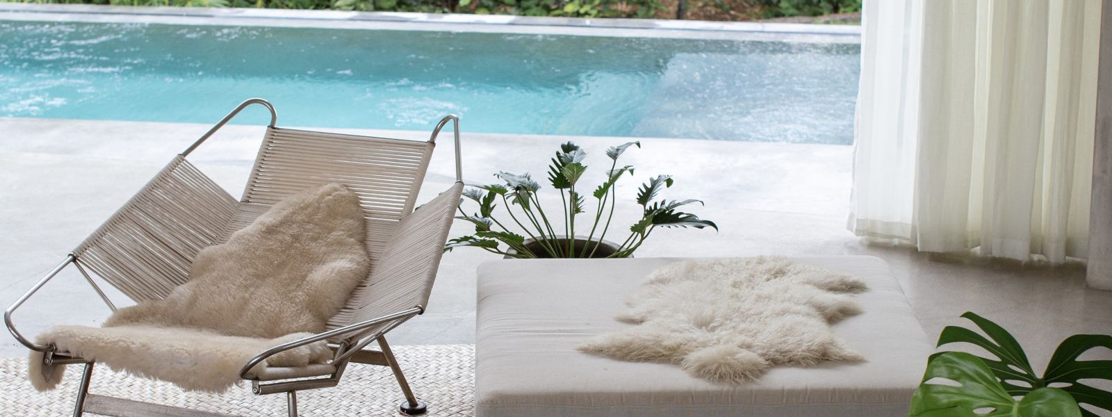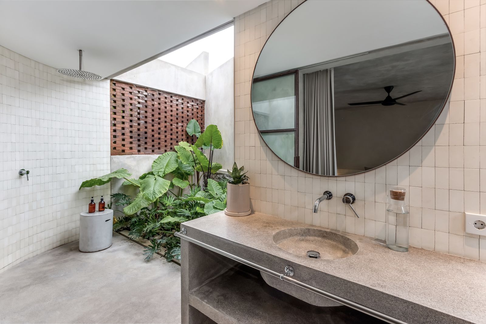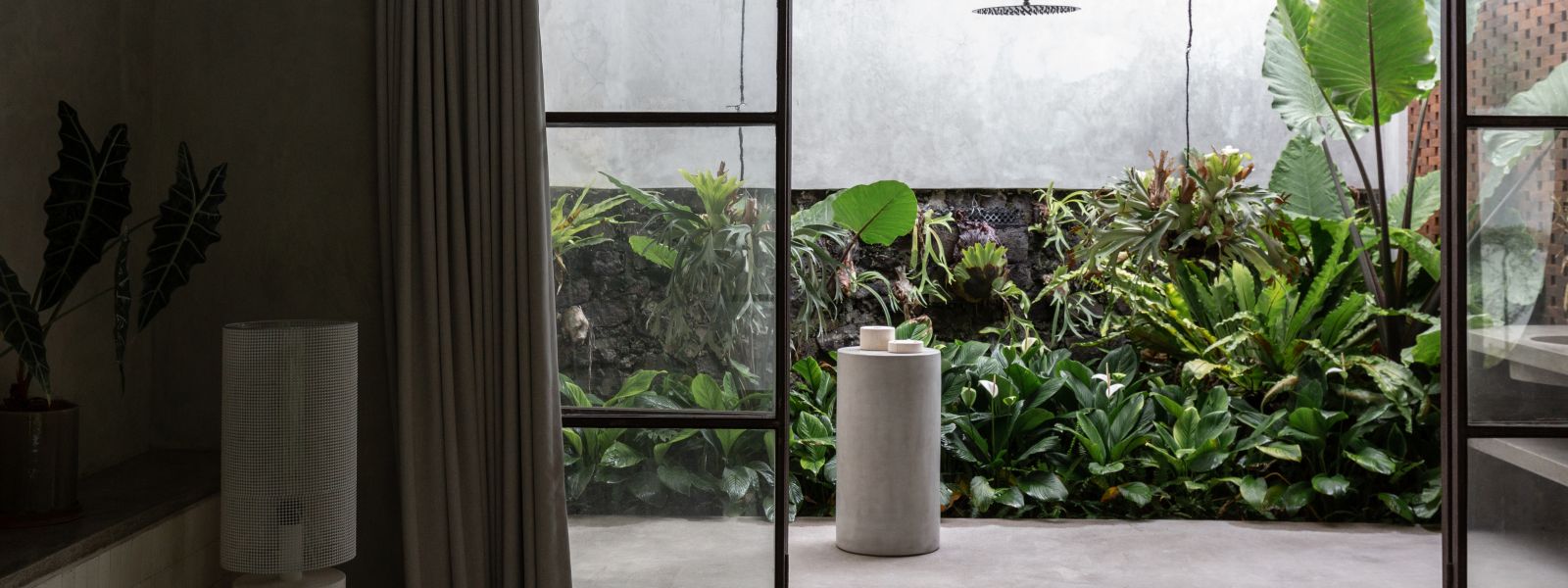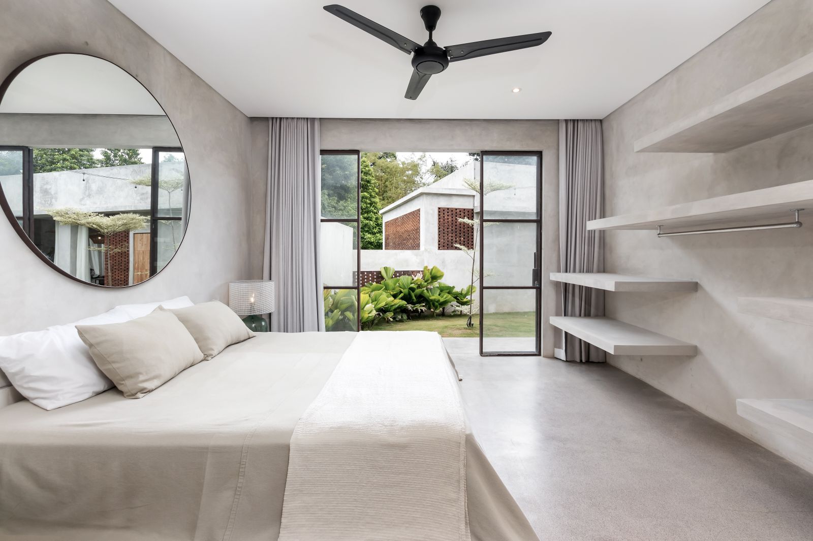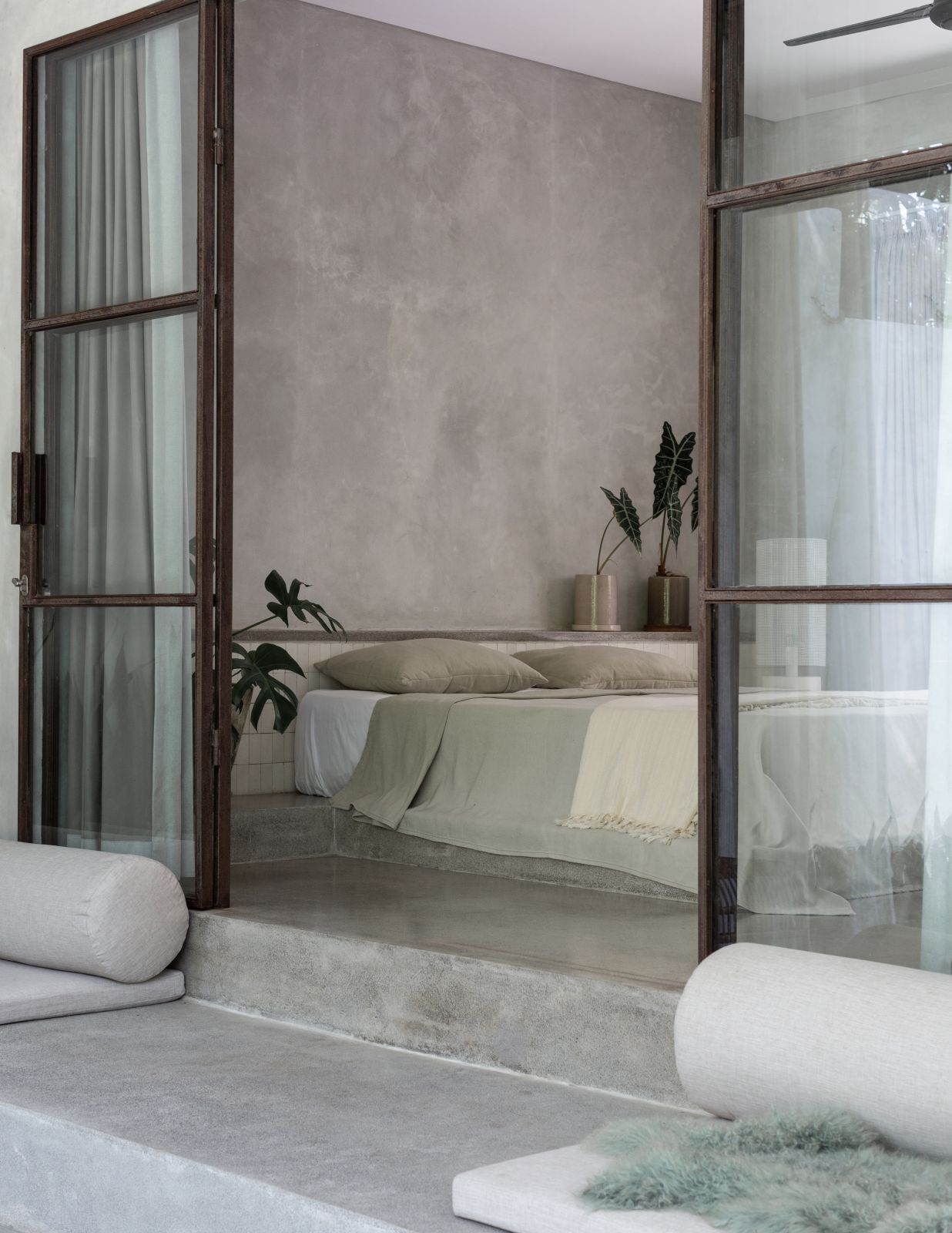 This villa showcases a refined blend of raw architectural elements and natural warmth, highlighted by its use of exposed concrete, wood accents, and lush greenery. The design feels grounded yet inviting, with handcrafted details such as the statement bamboo chandelier adding a unique artistic touch. Natural light fills the open-plan space, enhancing the textures and creating a calm, airy atmosphere throughout.