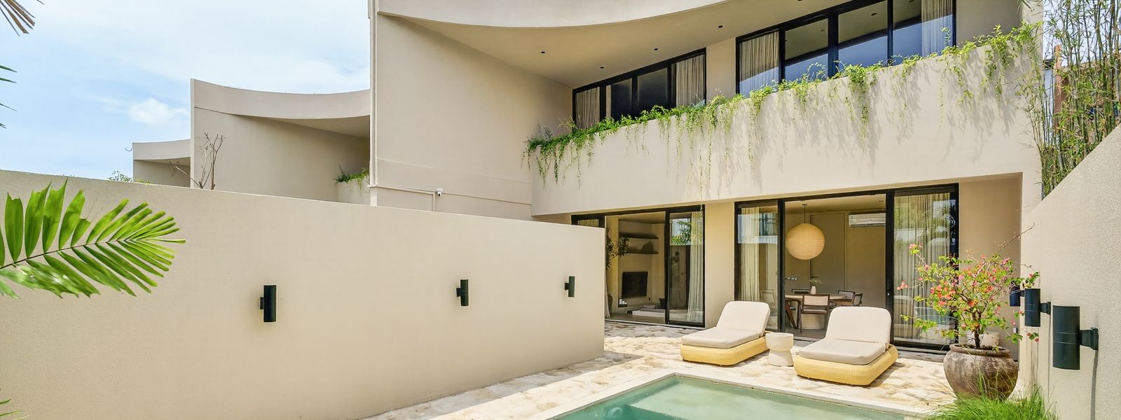 The house has two levels. On the ground floor is a living and dining area, a super modern kitchen with all amenities, one bedroom with an en suite, and a pool with an outdoor lounge area. The second floor offers two bedrooms with en-suites.