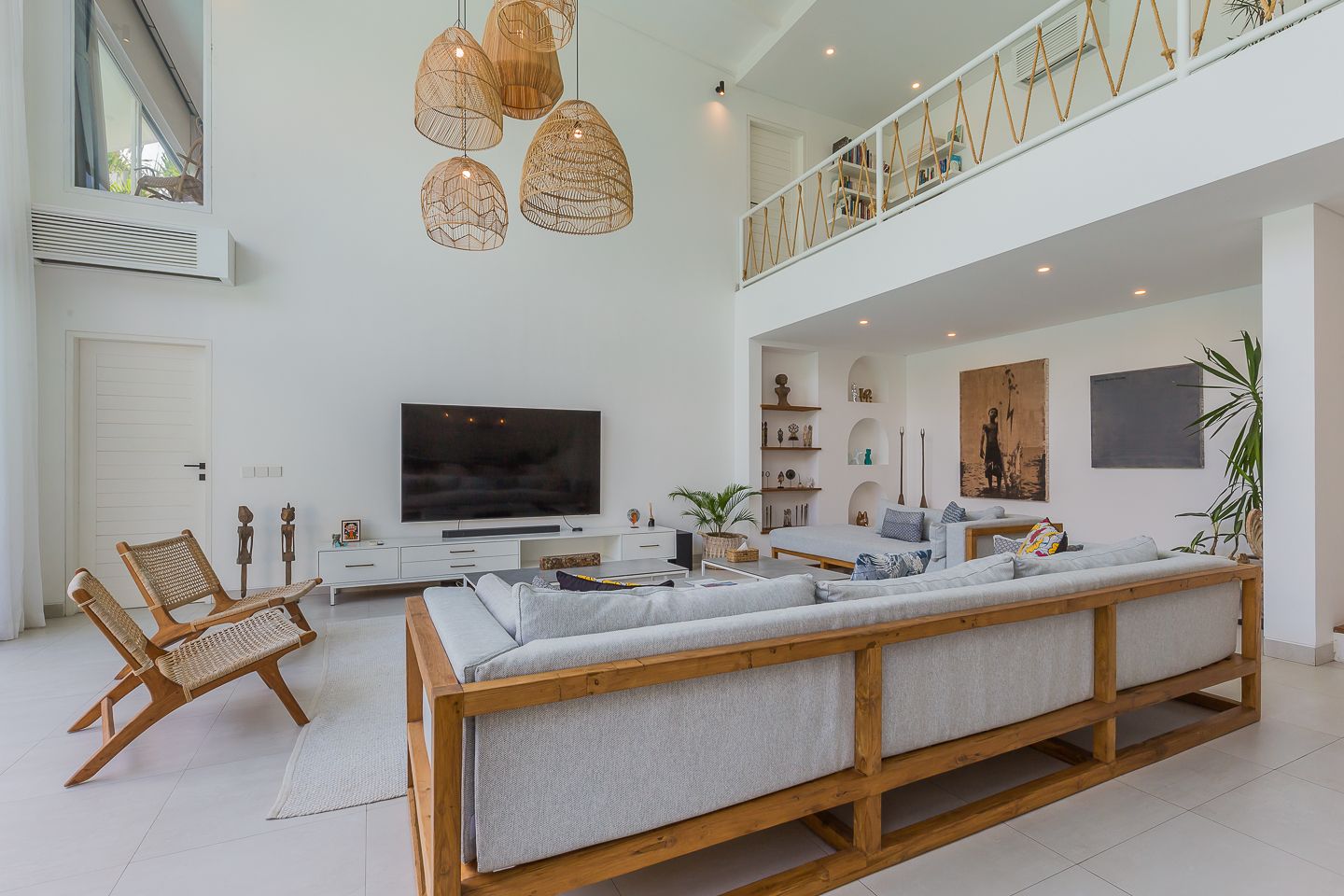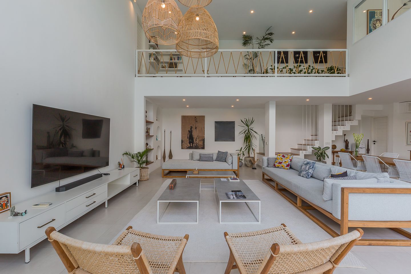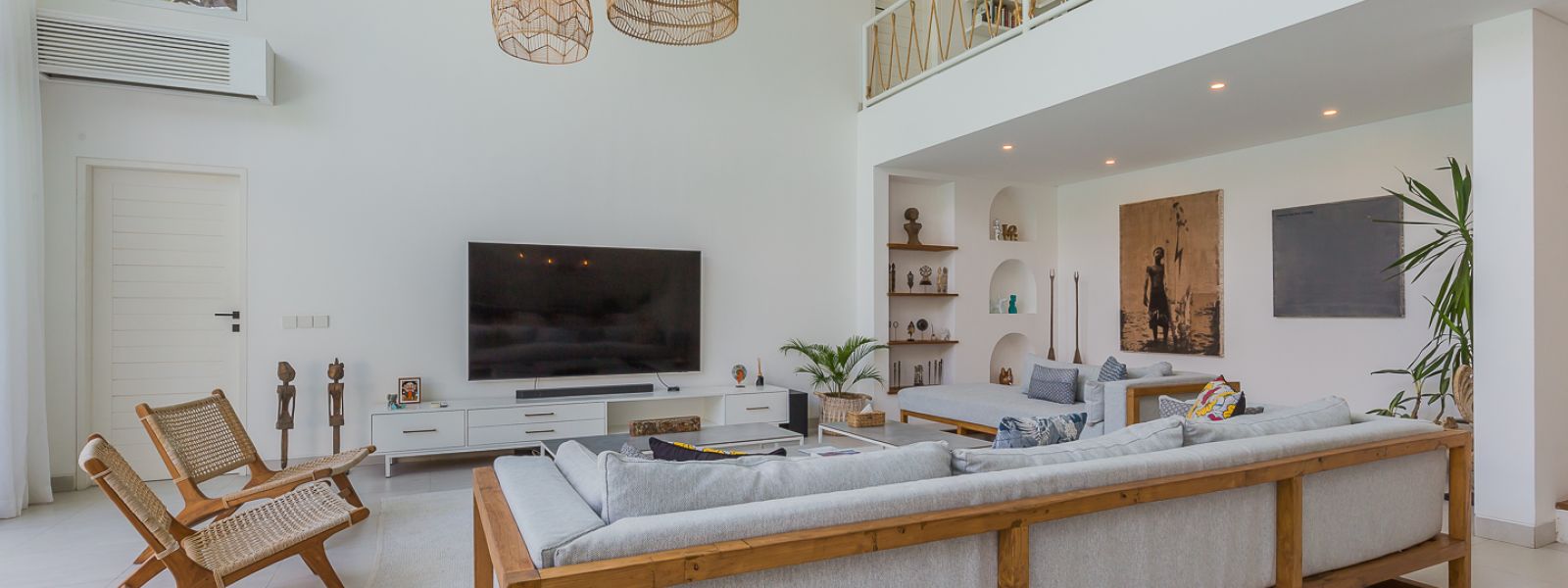 The villa's enclosed living room boasts a 7-meter high ceiling, 3 powerful Daikin air conditioners, a 6-meter high palm tree, and a 75-inch smart TV with Netflix and satellite international channels.