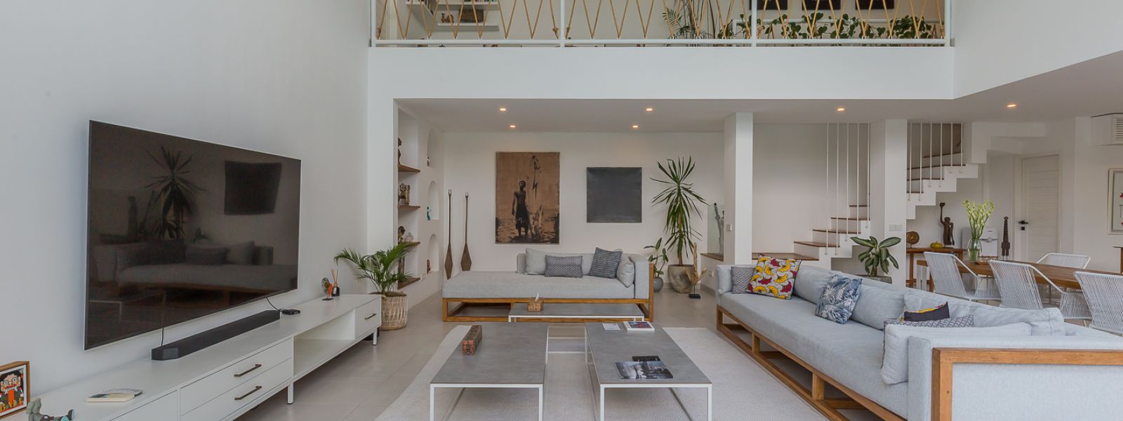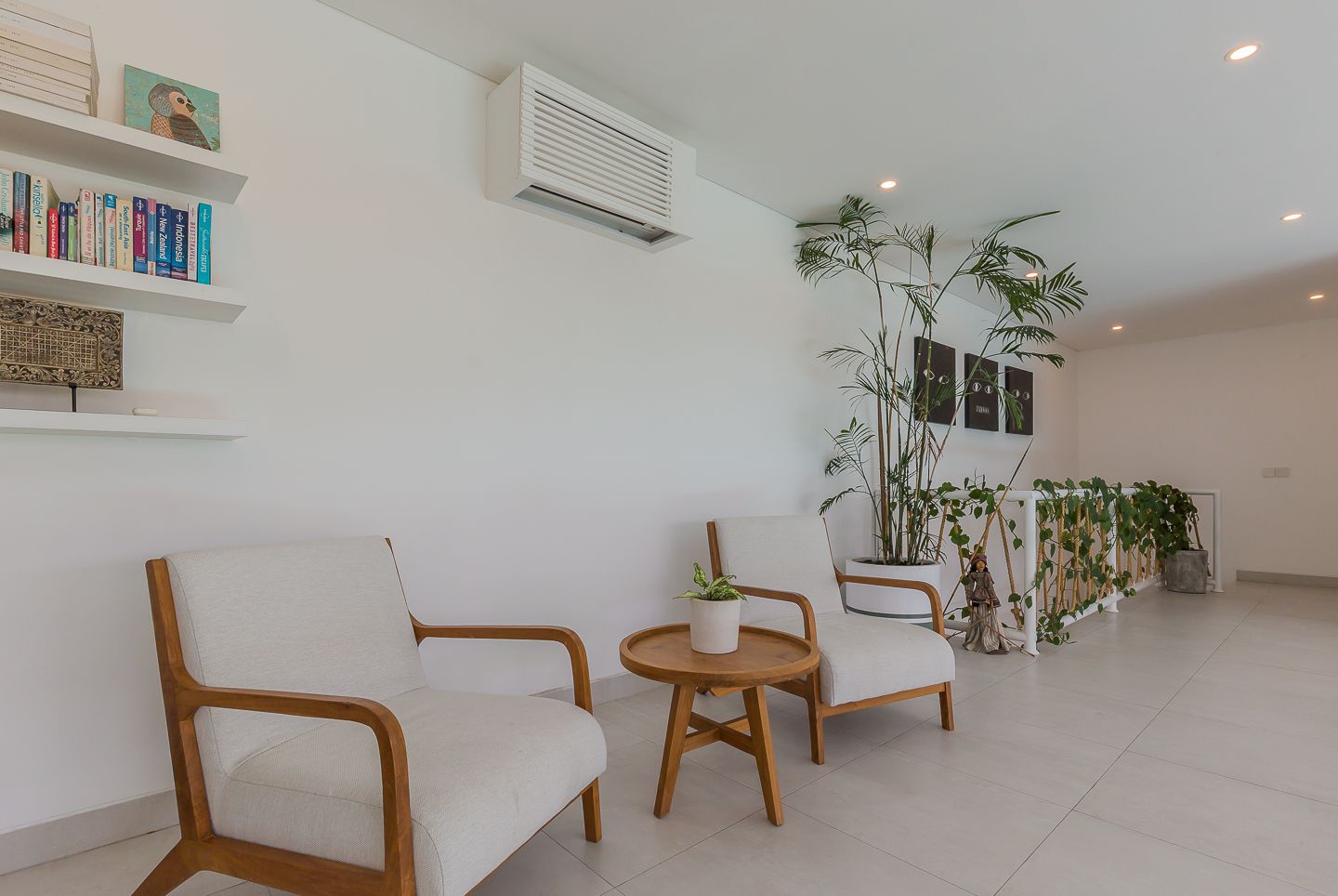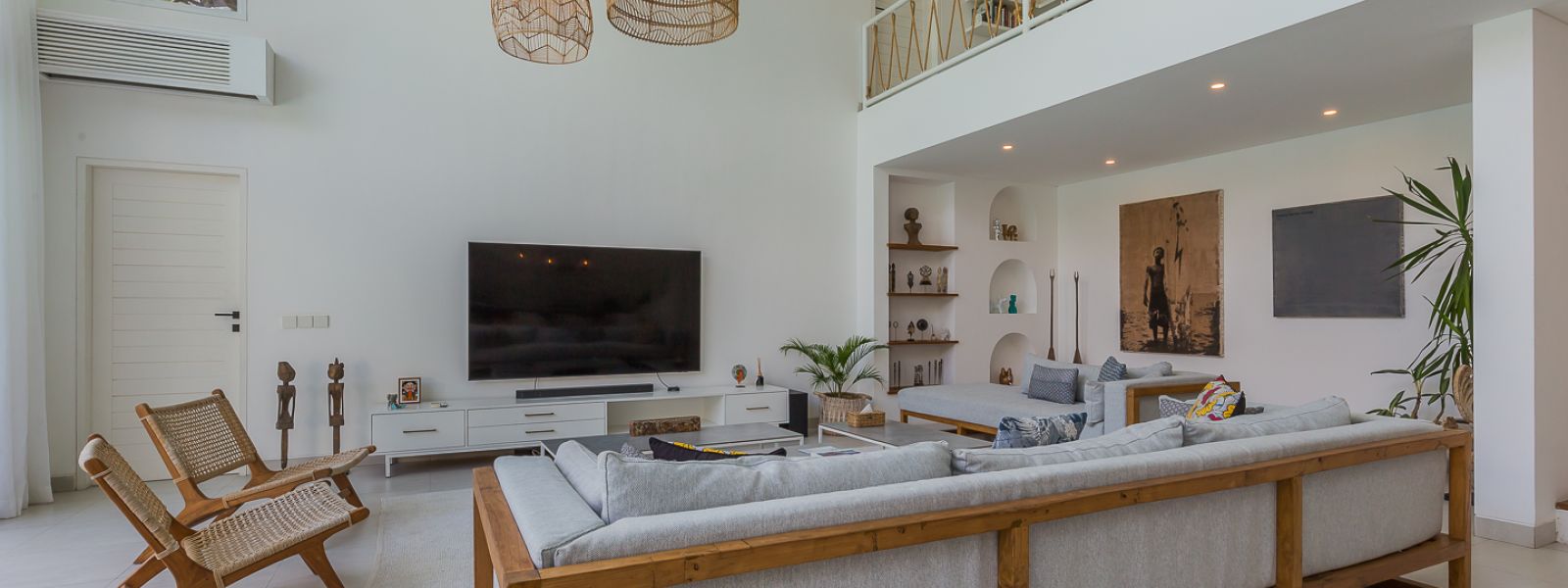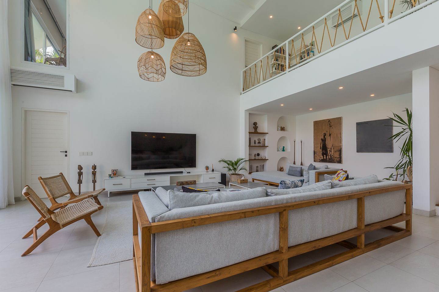 The villa's enclosed living room boasts a 7-meter high ceiling, 3 powerful Daikin air conditioners, a 6-meter high palm tree, and a 75-inch smart TV with Netflix and satellite international channels.