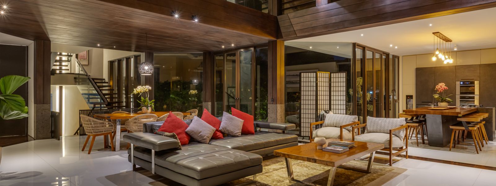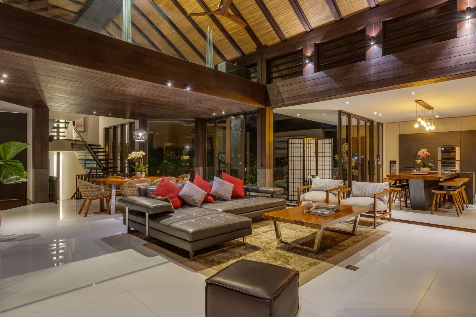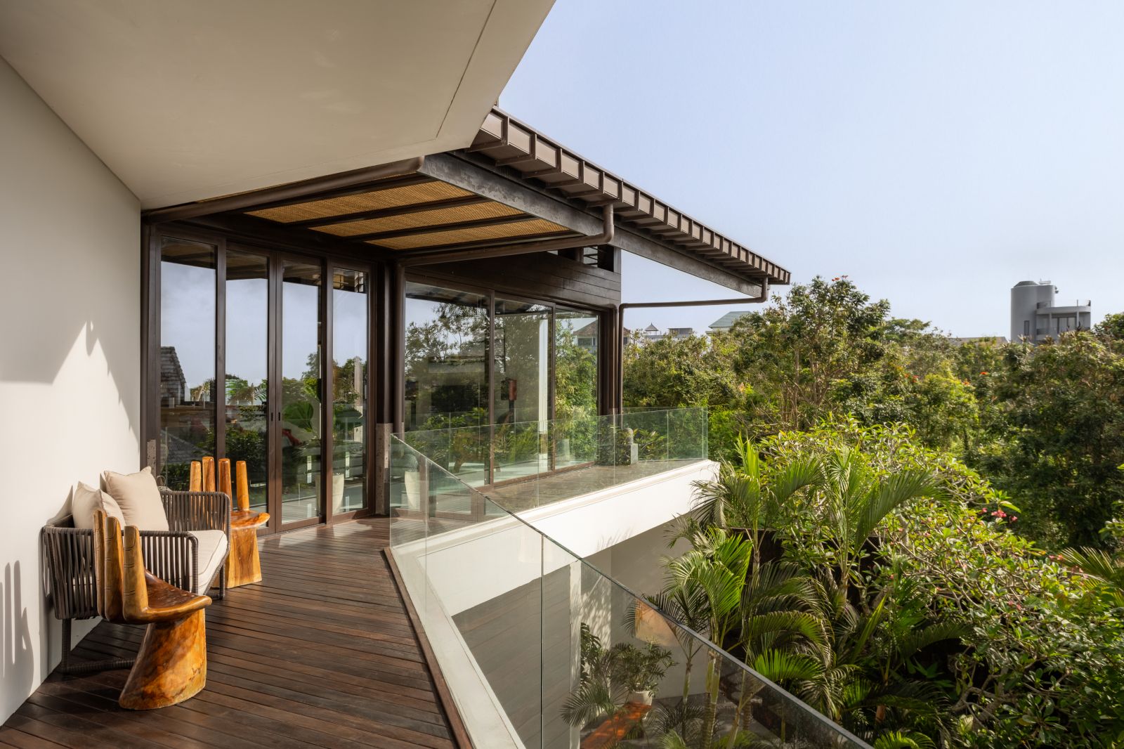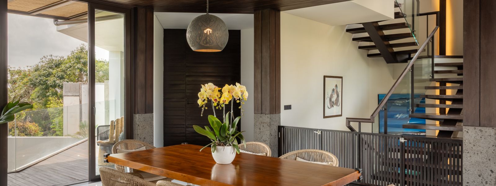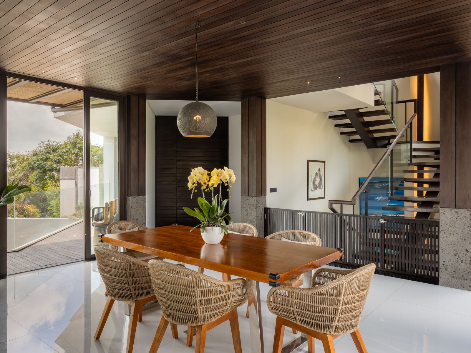 Premium materials such as wooden parquet, carved Balinese doors, and stone finishes bring warmth throughout. A modern staircase of steel, wood, and glass leads to the upper floor, where the open living and dining areas offer panoramic views. Surrounded by glass doors and wood columns, this space captures the essence of tropical living, complete with a teppanyaki-style dining table for entertaining.