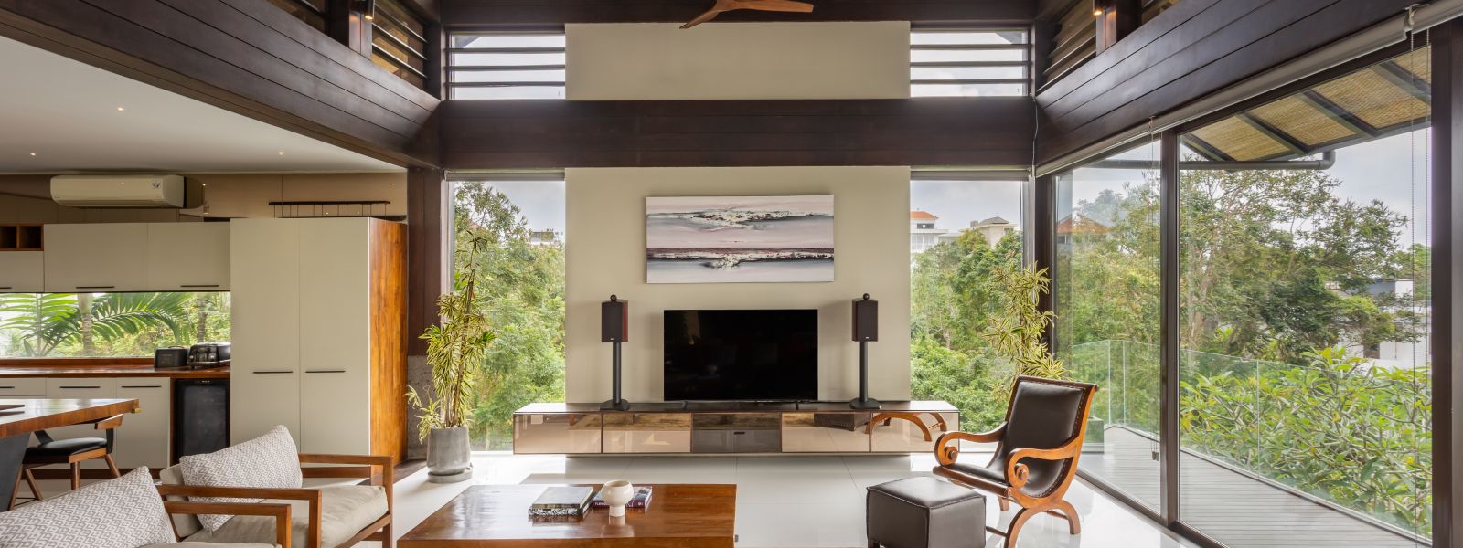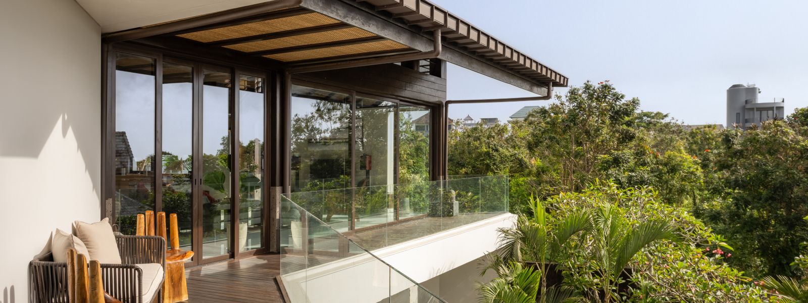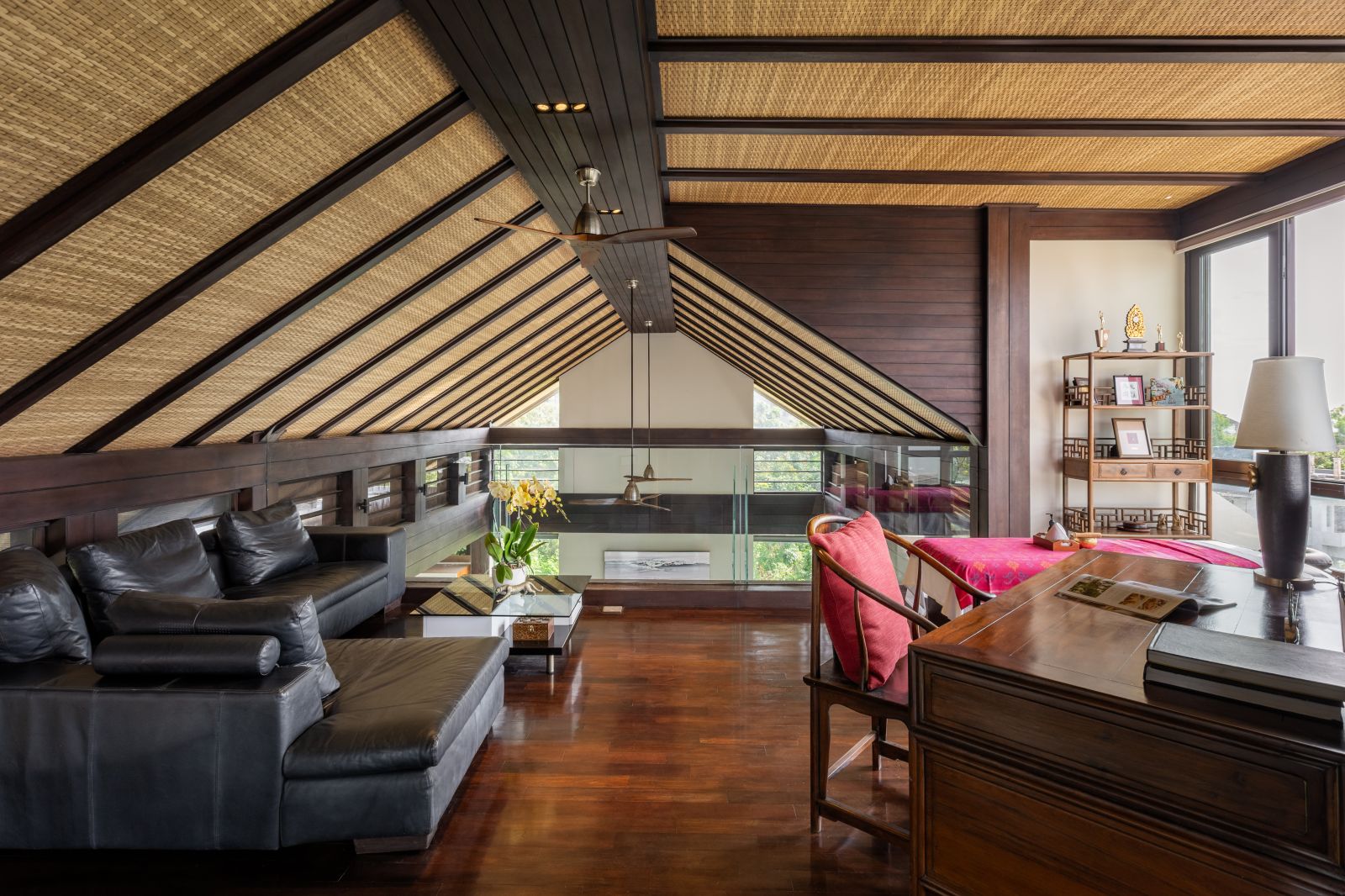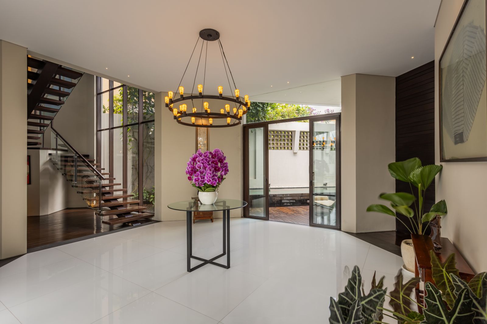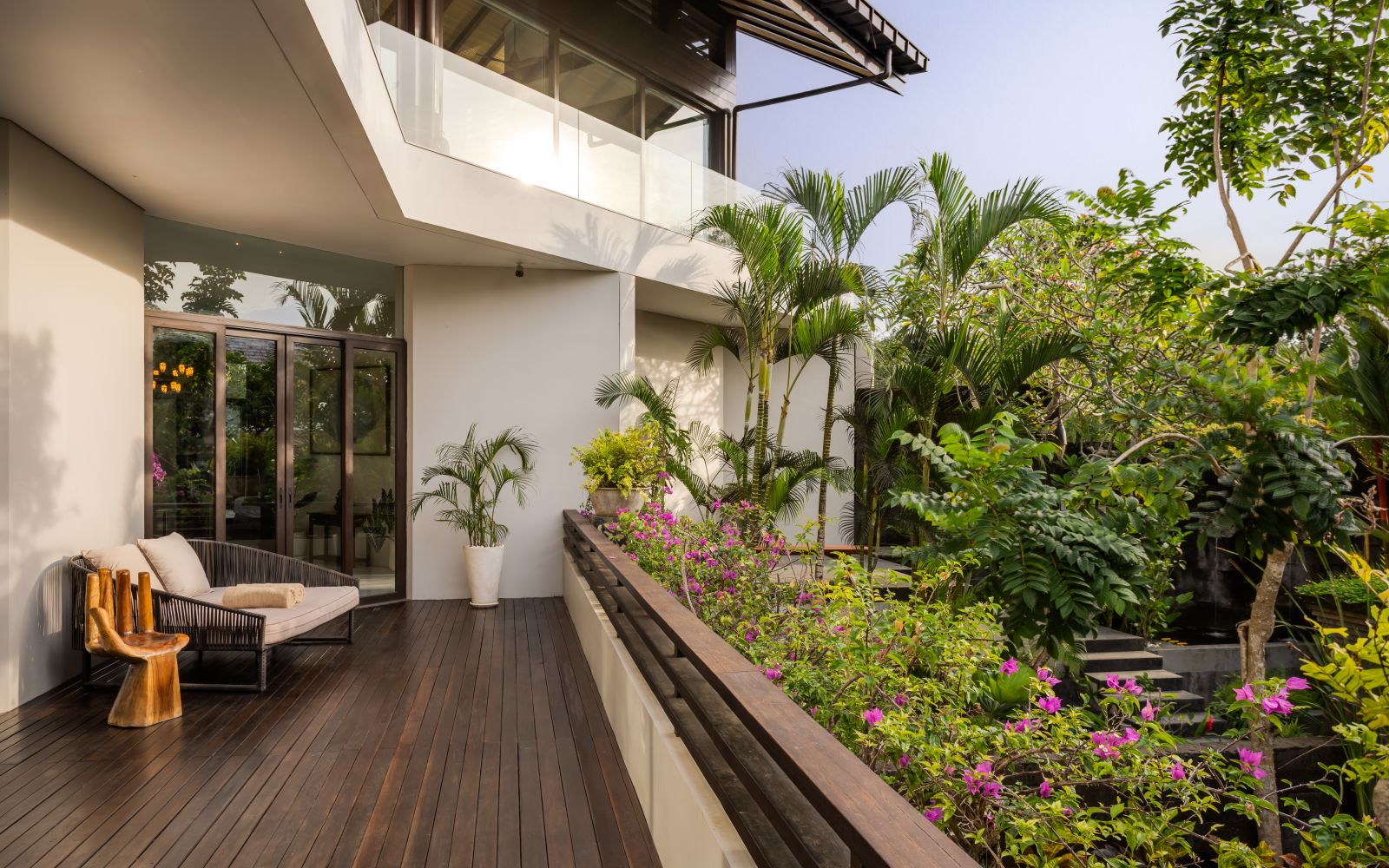 Premium materials such as wooden parquet, carved Balinese doors, and stone finishes bring warmth throughout. A modern staircase of steel, wood, and glass leads to the upper floor, where the open living and dining areas offer panoramic views. Surrounded by glass doors and wood columns, this space captures the essence of tropical living, complete with a teppanyaki-style dining table for entertaining.