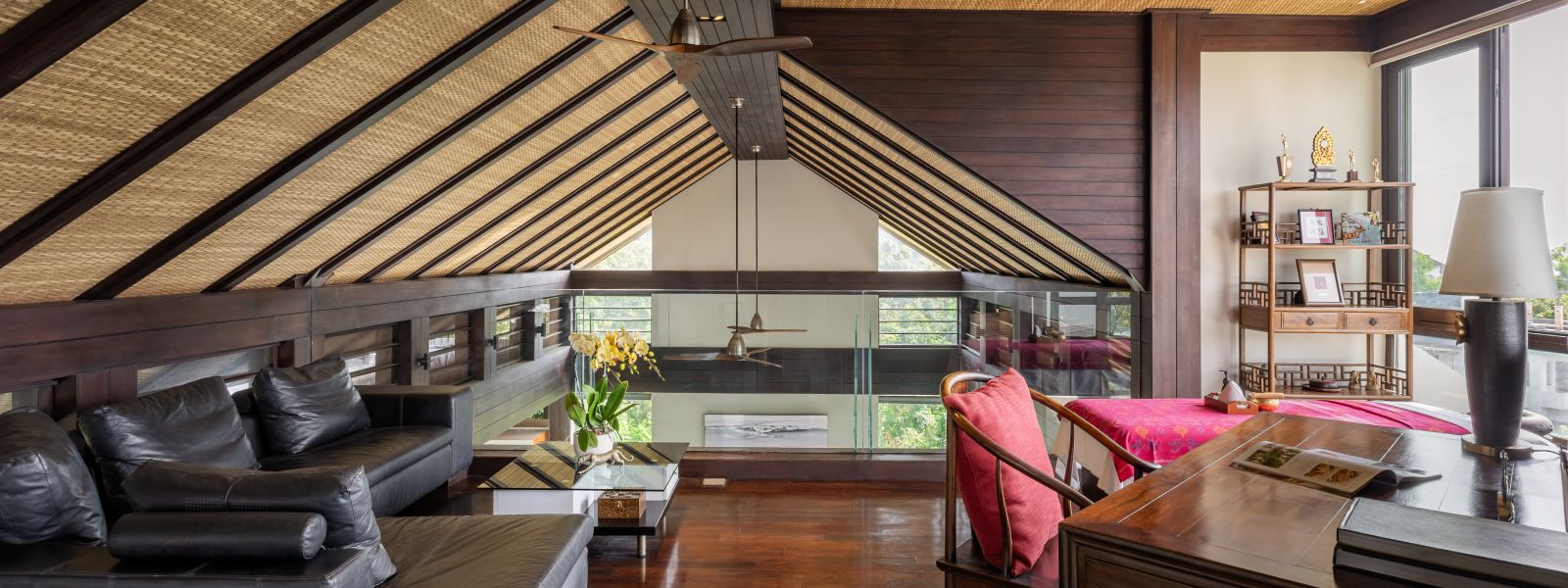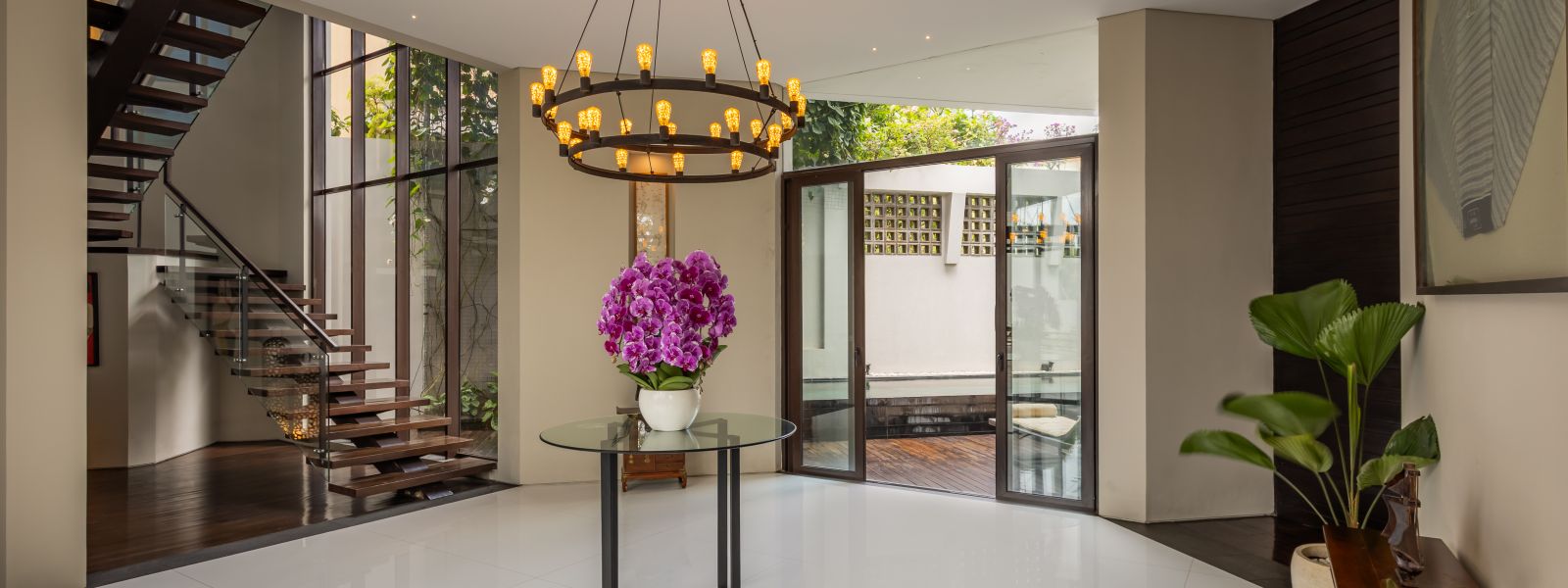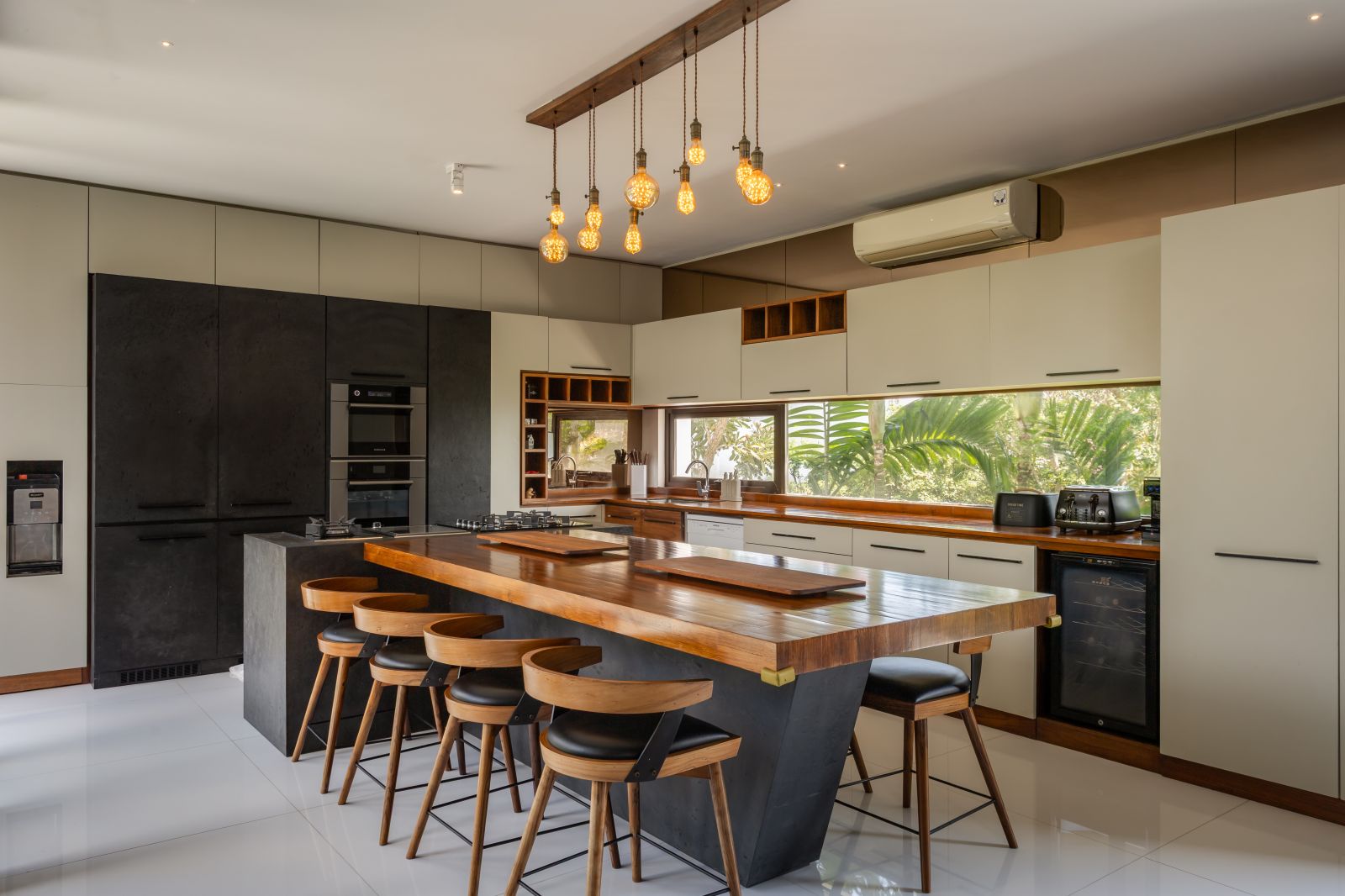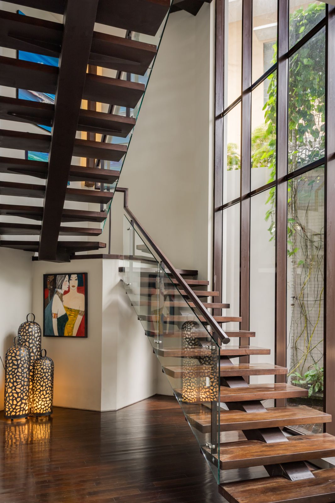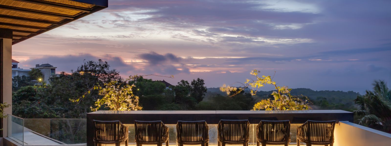 Premium materials such as wooden parquet, carved Balinese doors, and stone finishes bring warmth throughout. A modern staircase of steel, wood, and glass leads to the upper floor, where the open living and dining areas offer panoramic views. Surrounded by glass doors and wood columns, this space captures the essence of tropical living, complete with a teppanyaki-style dining table for entertaining.