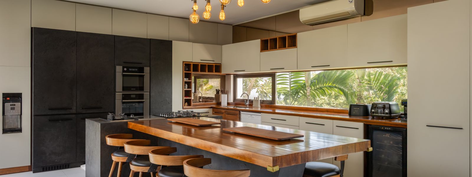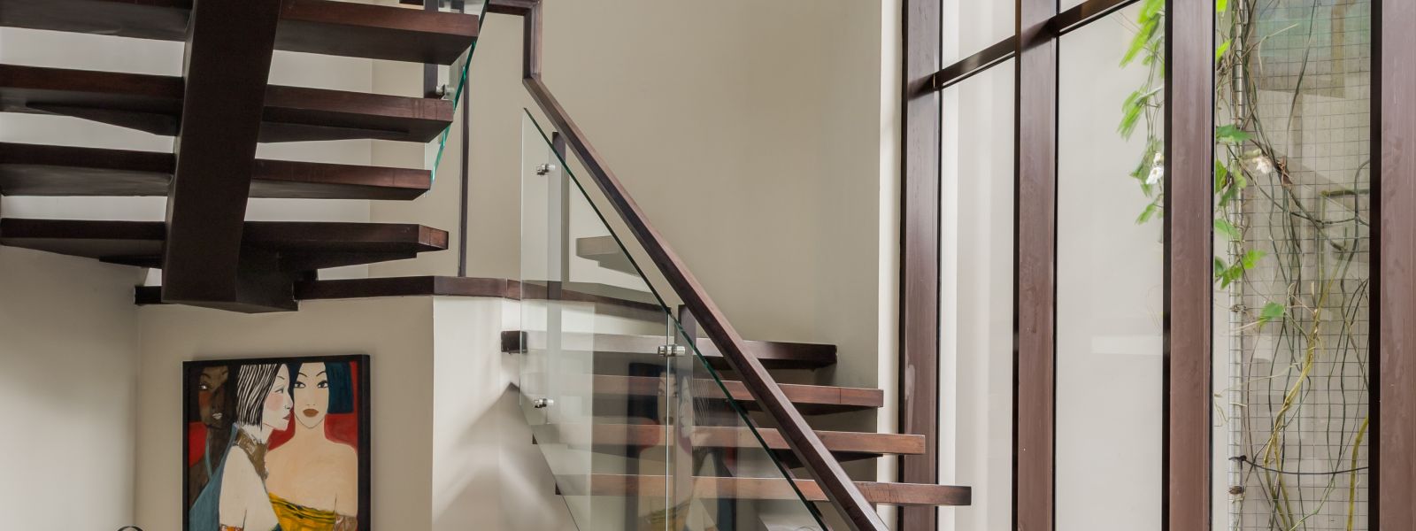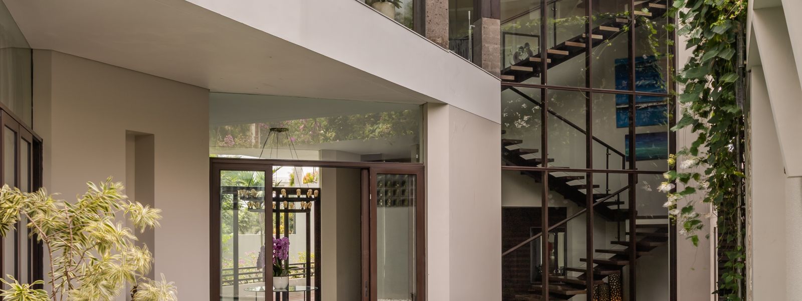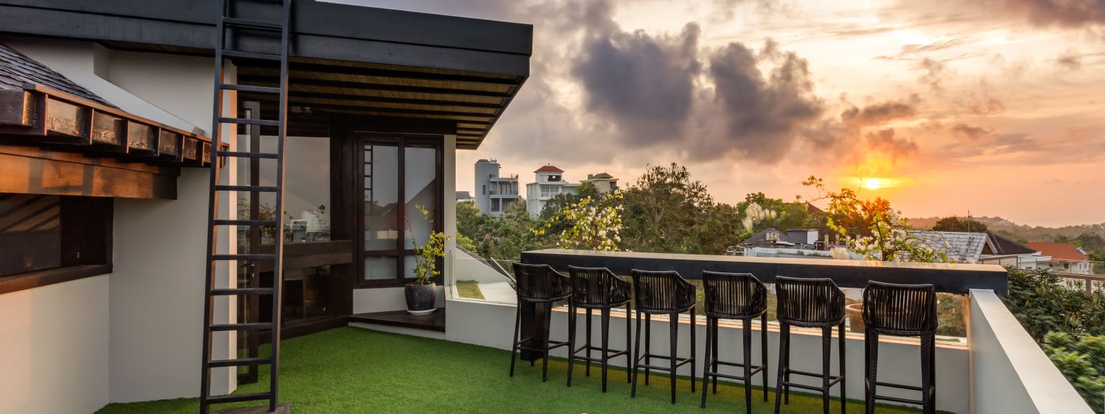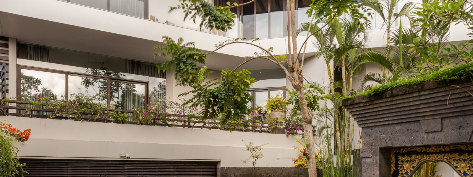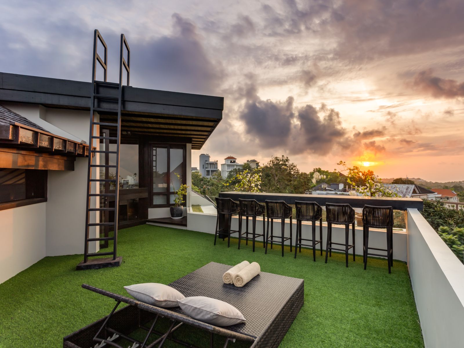 Premium materials such as wooden parquet, carved Balinese doors, and stone finishes bring warmth throughout. A modern staircase of steel, wood, and glass leads to the upper floor, where the open living and dining areas offer panoramic views. Surrounded by glass doors and wood columns, this space captures the essence of tropical living, complete with a teppanyaki-style dining table for entertaining.