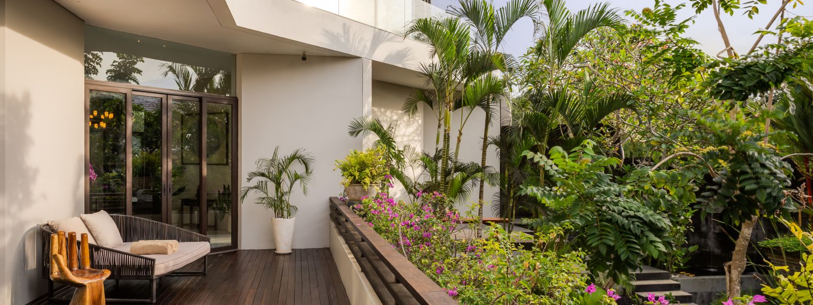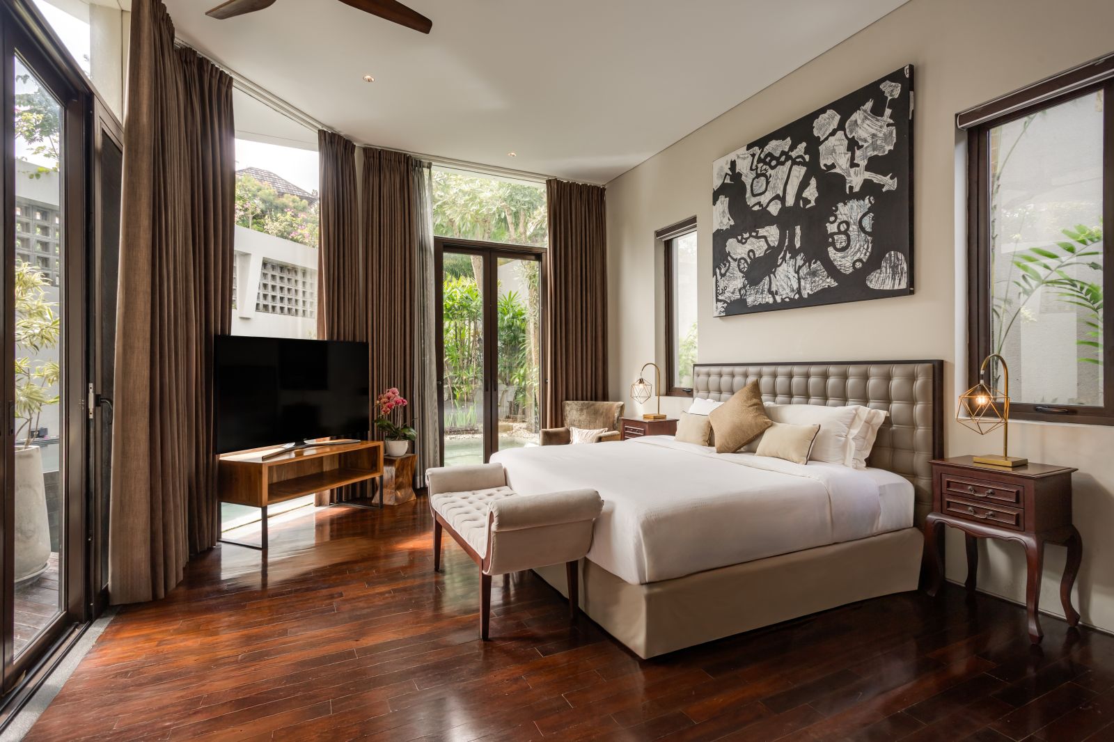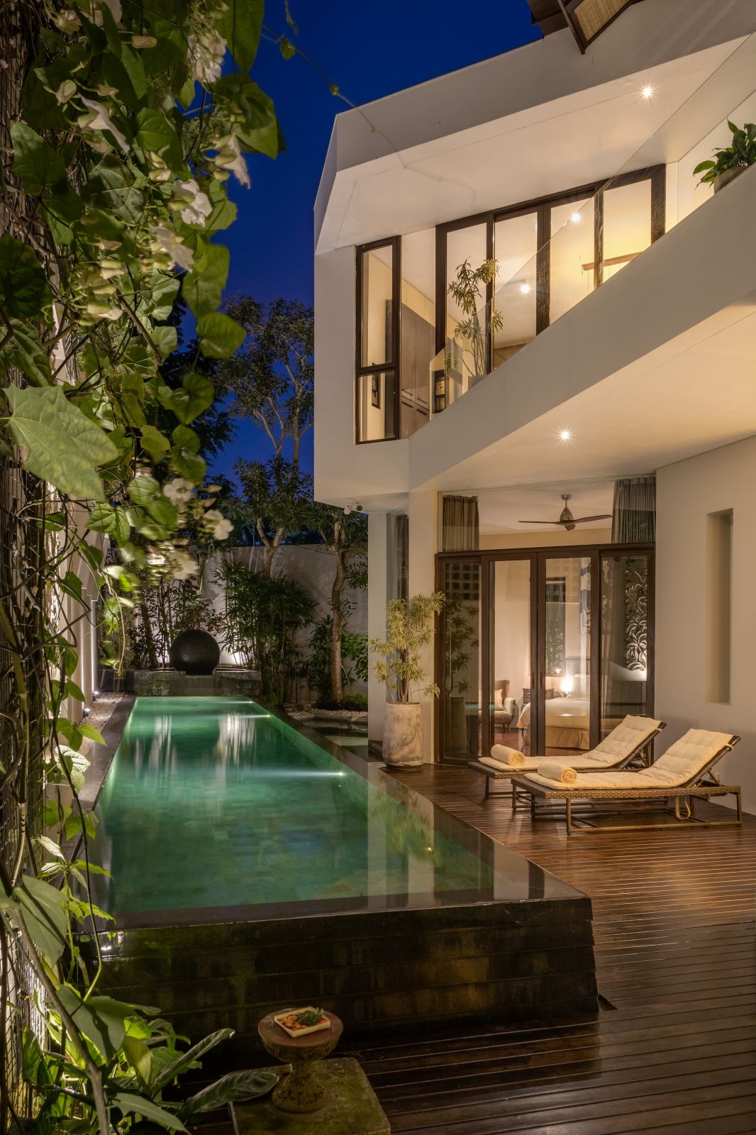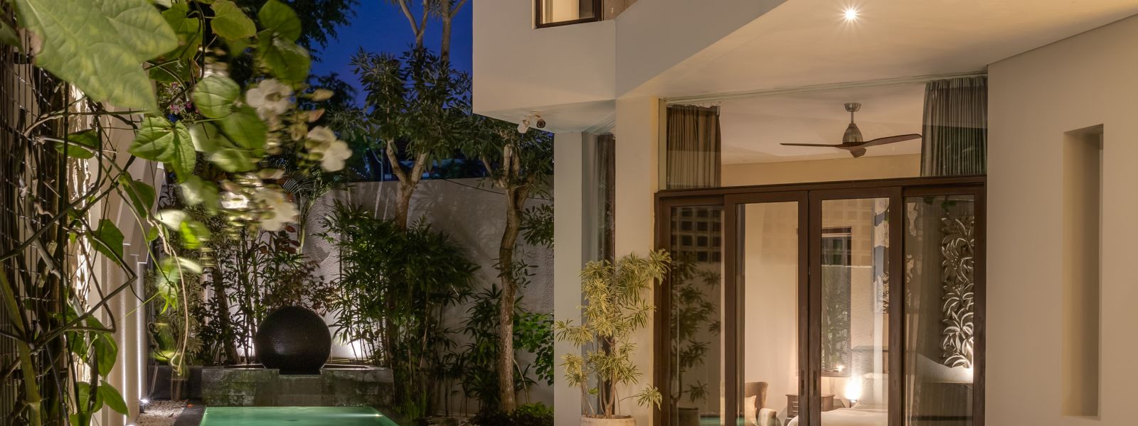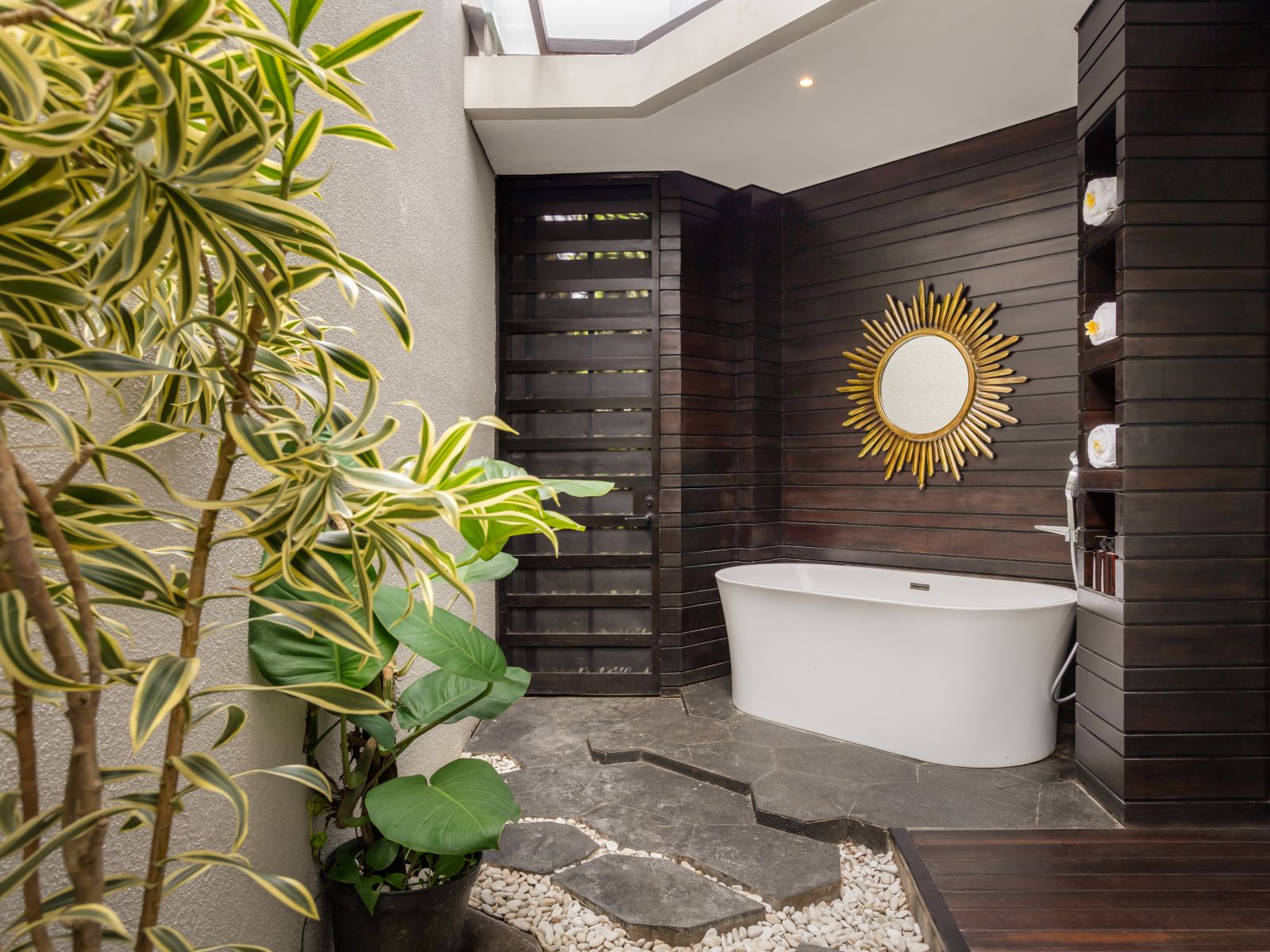 The ground floor features two spacious bedrooms with solid wood doors and direct pool access. The master suite includes a private patio, walk-in closet, and a semi-outdoor bathroom with a freestanding bathtub and stonescape garden. A sunken whirlpool adds a touch of resort luxury, while the guest bedroom opens onto a sunset terrace.