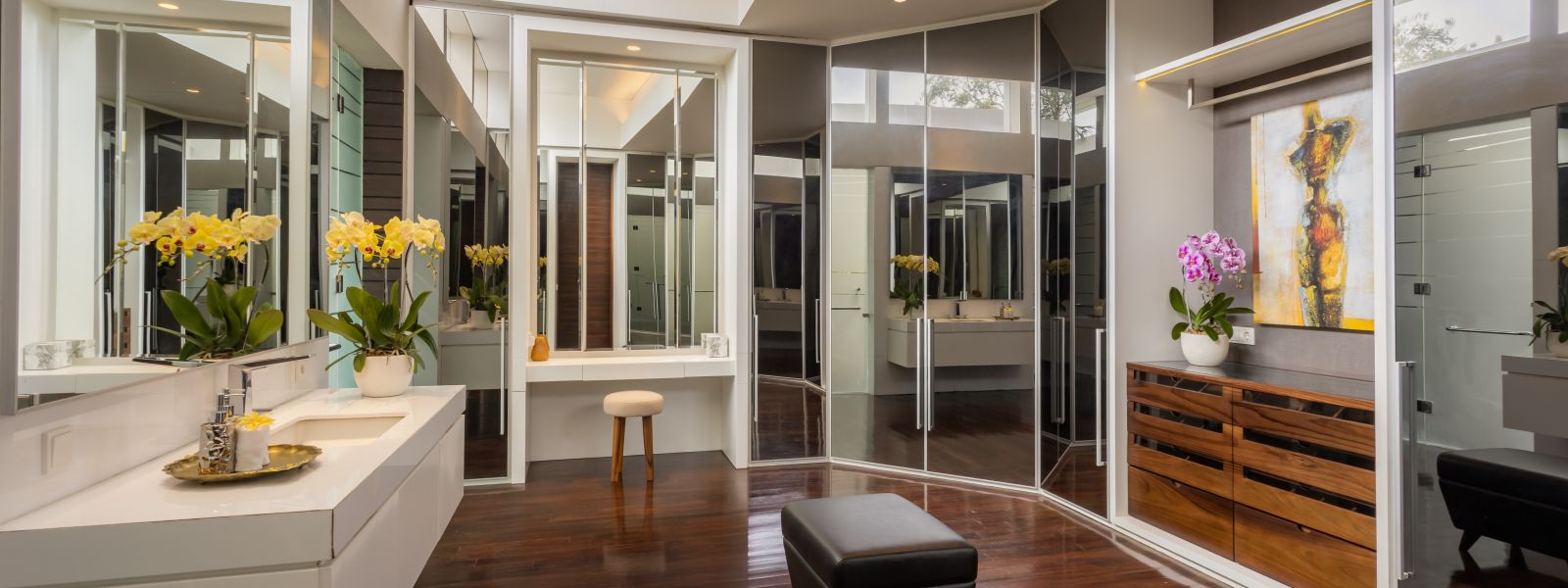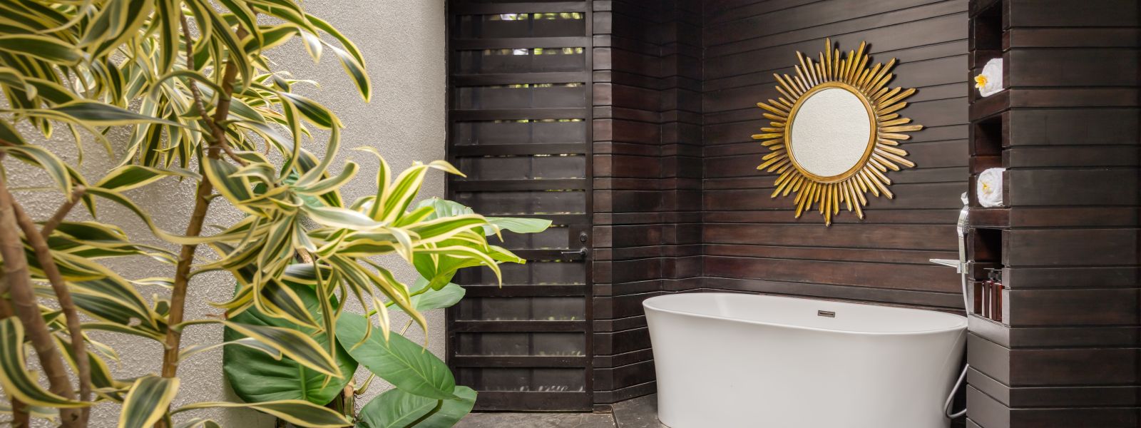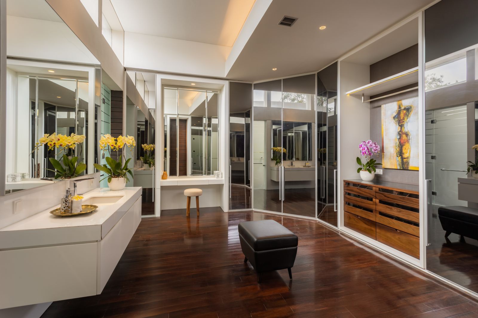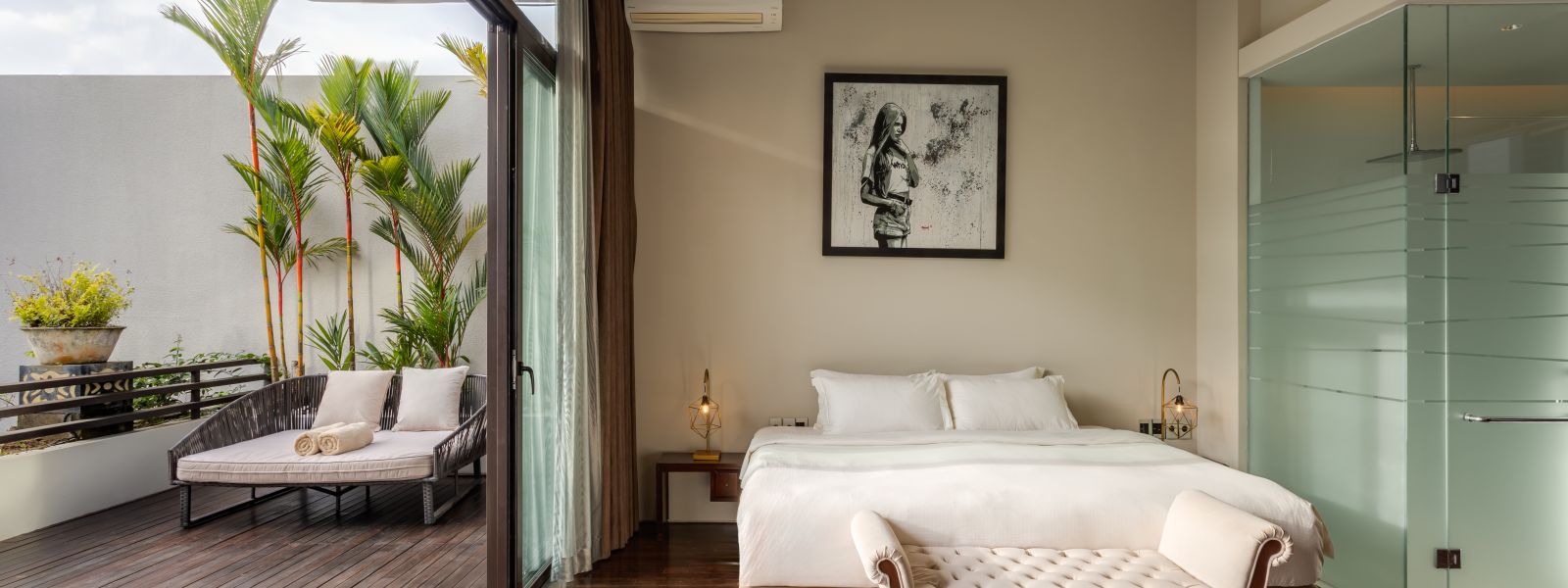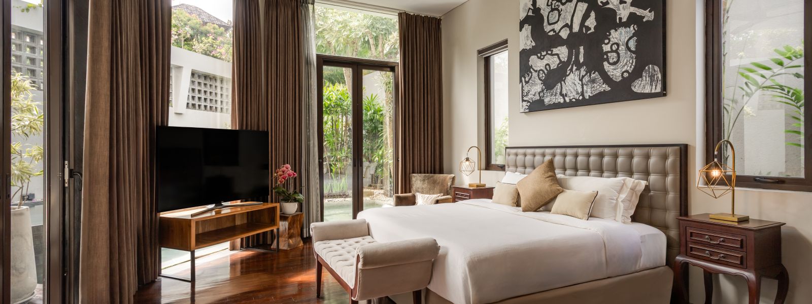 The ground floor features two spacious bedrooms with solid wood doors and direct pool access. The master suite includes a private patio, walk-in closet, and a semi-outdoor bathroom with a freestanding bathtub and stonescape garden. A sunken whirlpool adds a touch of resort luxury, while the guest bedroom opens onto a sunset terrace.