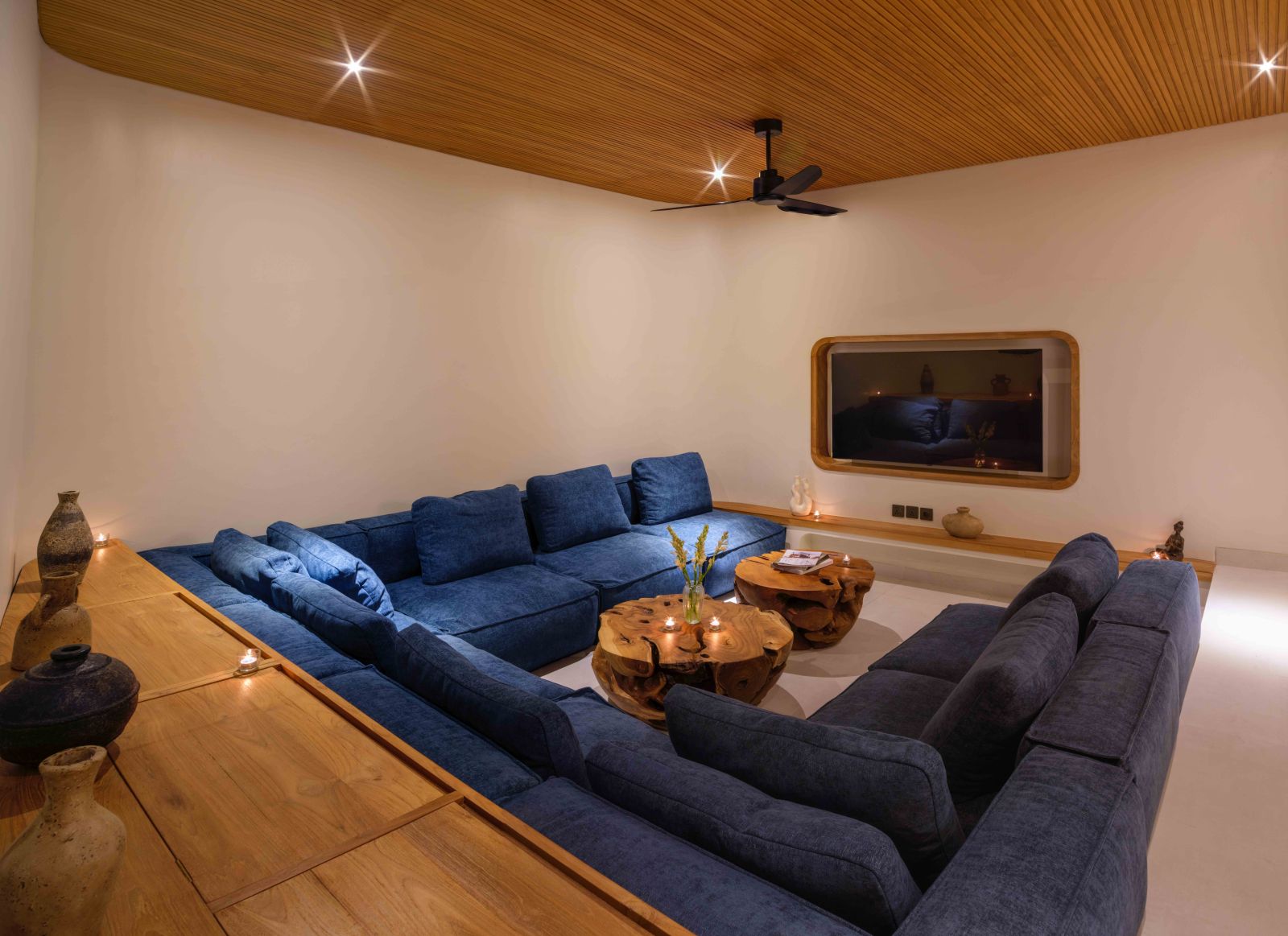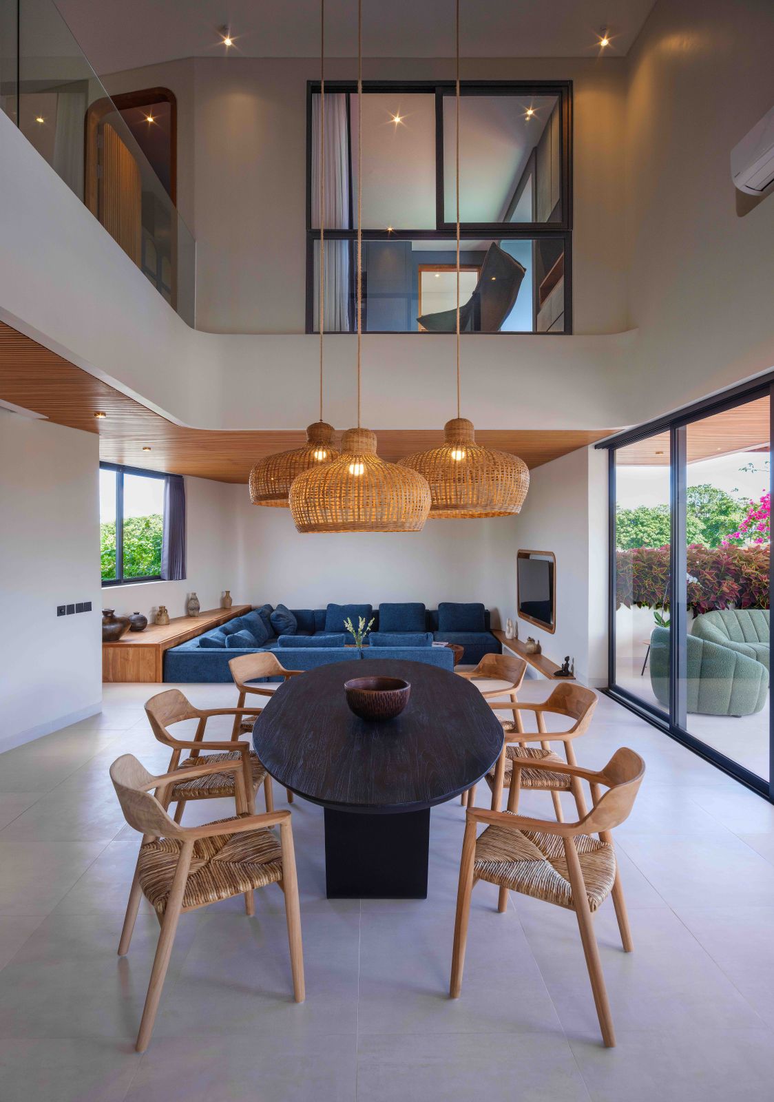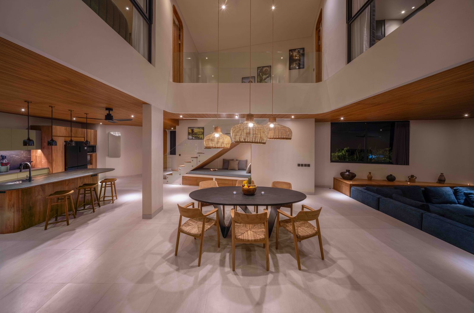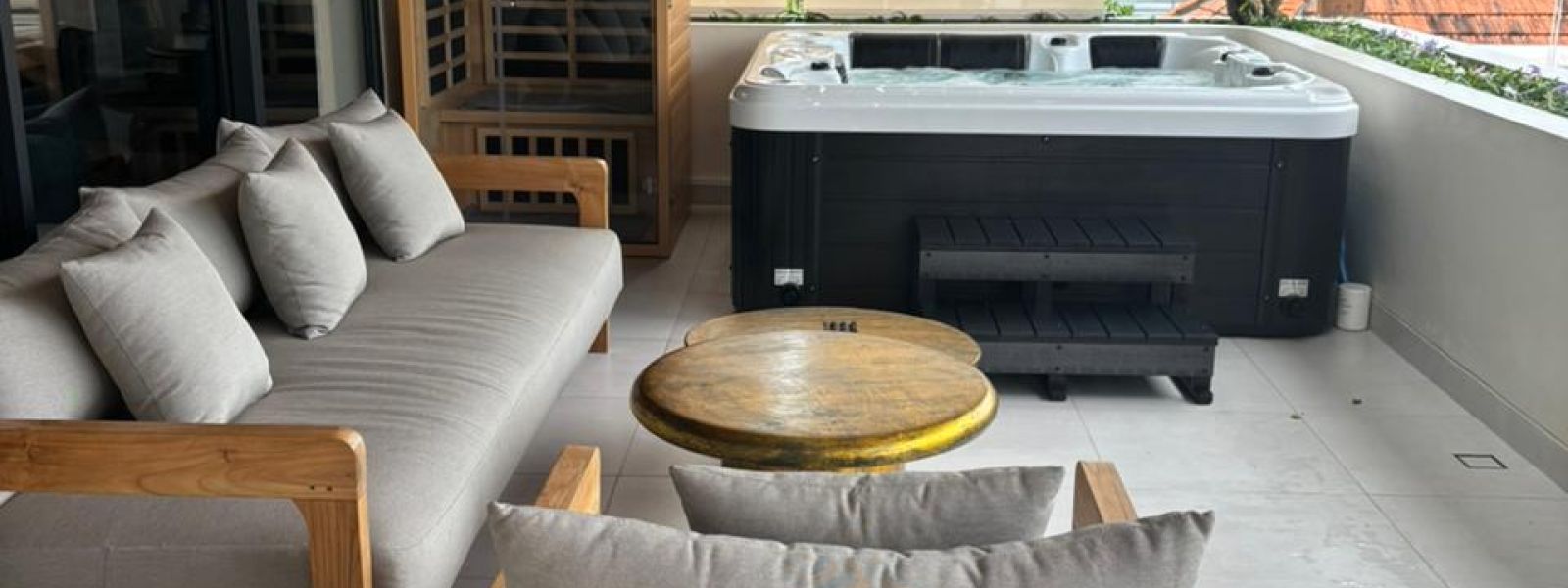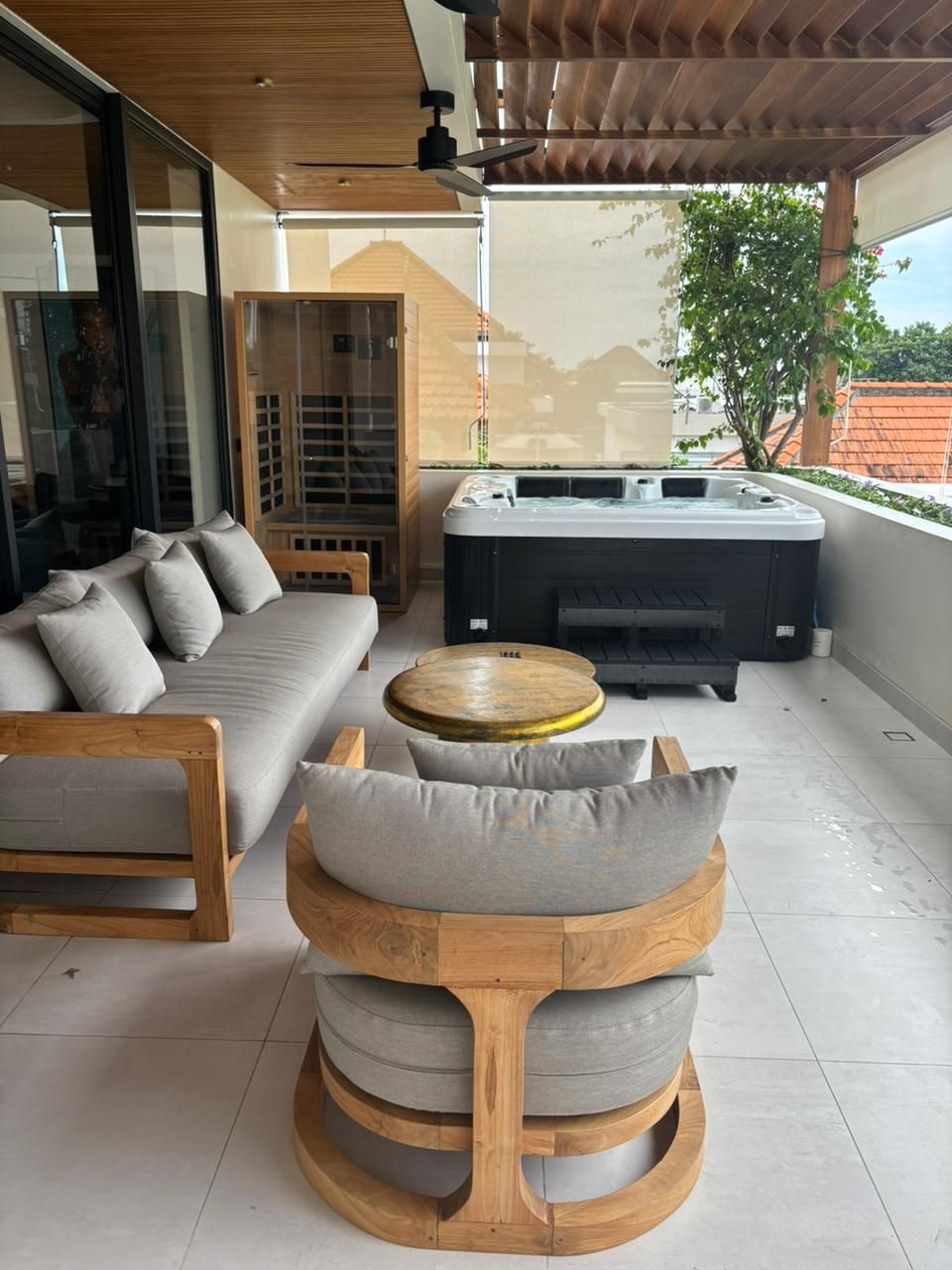With a generous 250 sqm building size, the apartment is well suited for individuals, couples, or small families seeking a comfortable living space in Bali. It features two bedrooms with ensuite bathrooms, a modern kitchen, a double-height dining area, and a cozy TV room. The outdoor space includes a spacious covered balcony with dining and seating areas, as well as a sauna and Jacuzzi for relaxation.