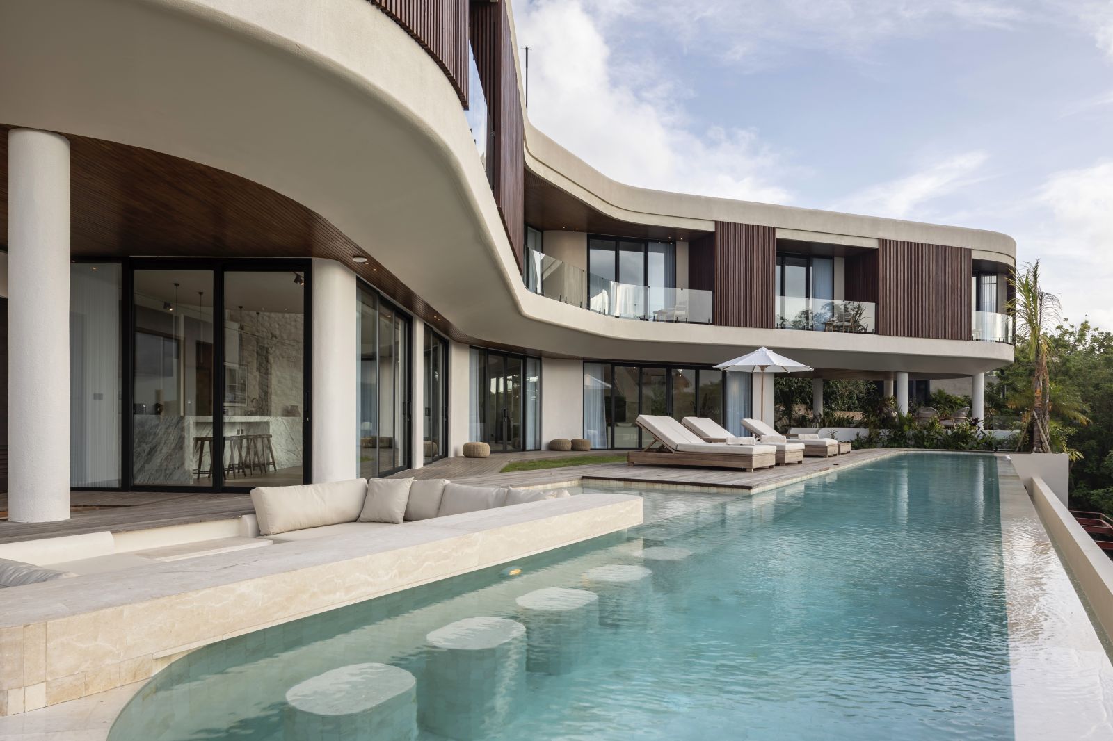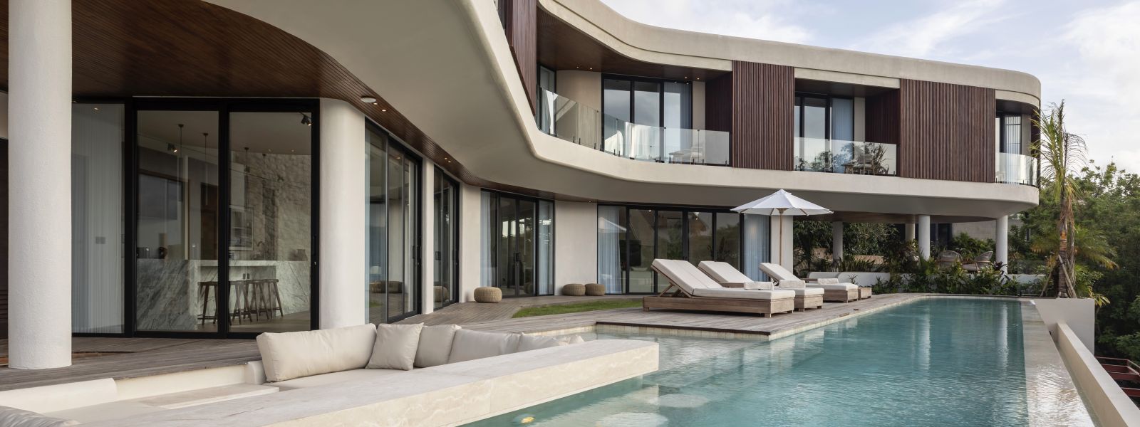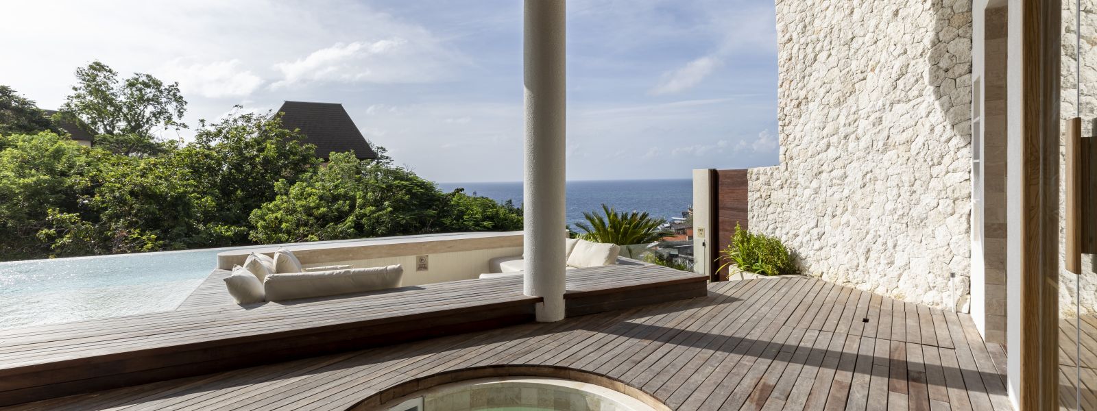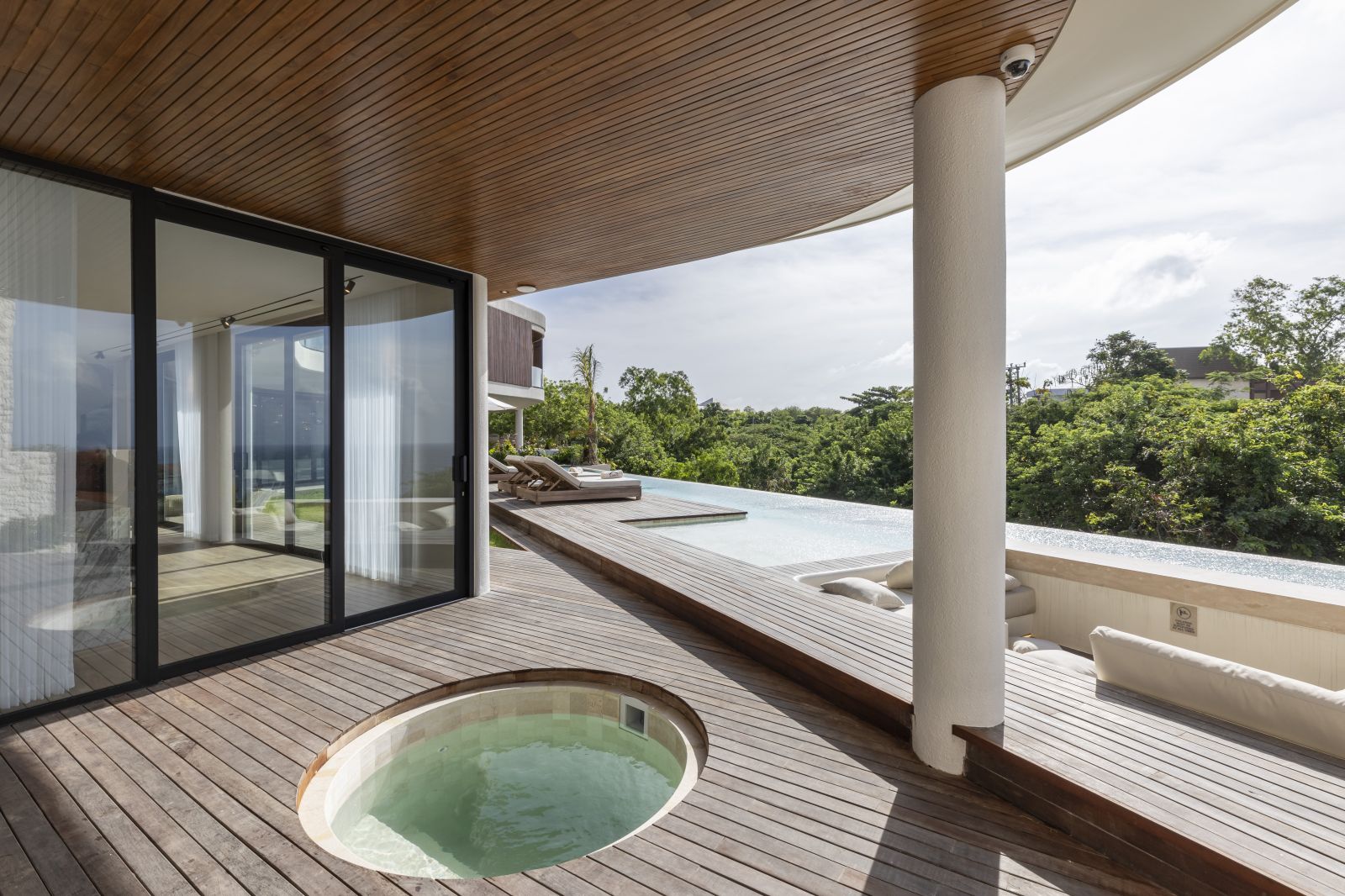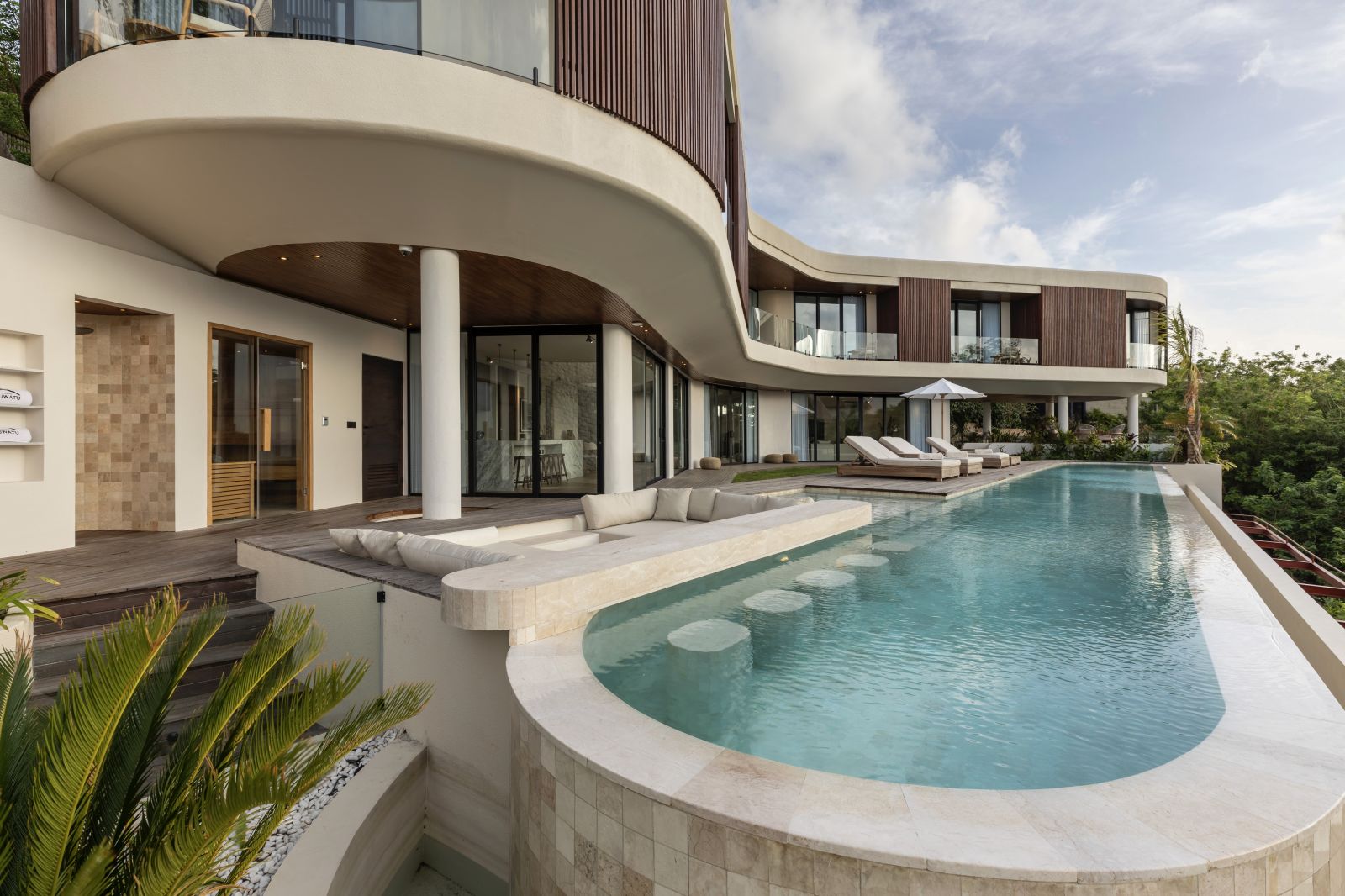 The house features a 25m infinity lap pool with an outdoor sunken lounge and bar, offering in-pool seating and stunning sea views. There’s direct beach access via a private staircase and a covered outdoor seating area not visible in the pictures but shown on the floor plans, located to the right of the pool under the house's overhang.