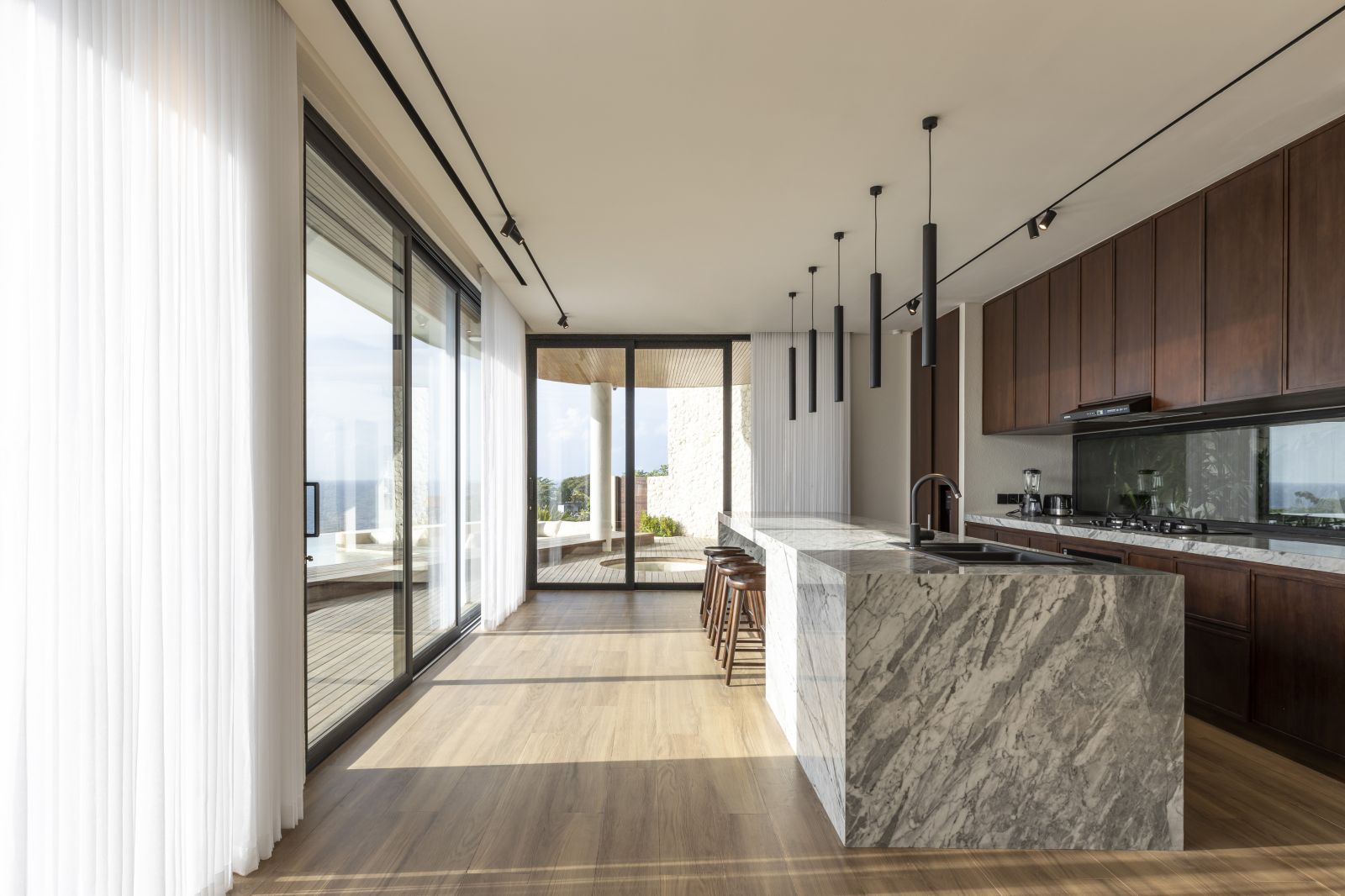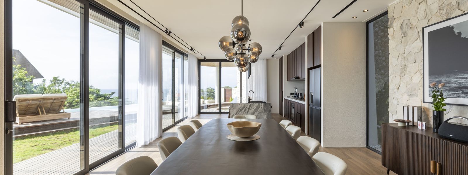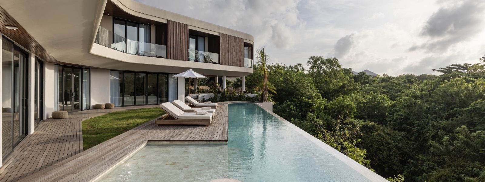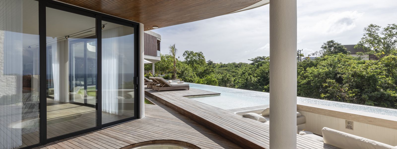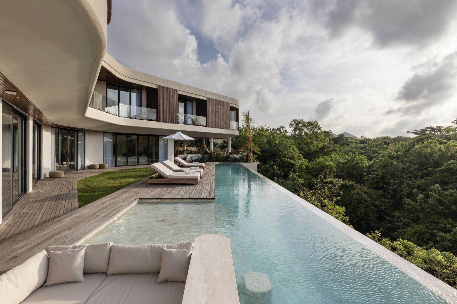 The house features a 25m infinity lap pool with an outdoor sunken lounge and bar, offering in-pool seating and stunning sea views. There’s direct beach access via a private staircase and a covered outdoor seating area not visible in the pictures but shown on the floor plans, located to the right of the pool under the house's overhang.