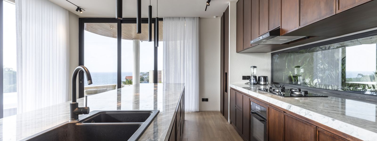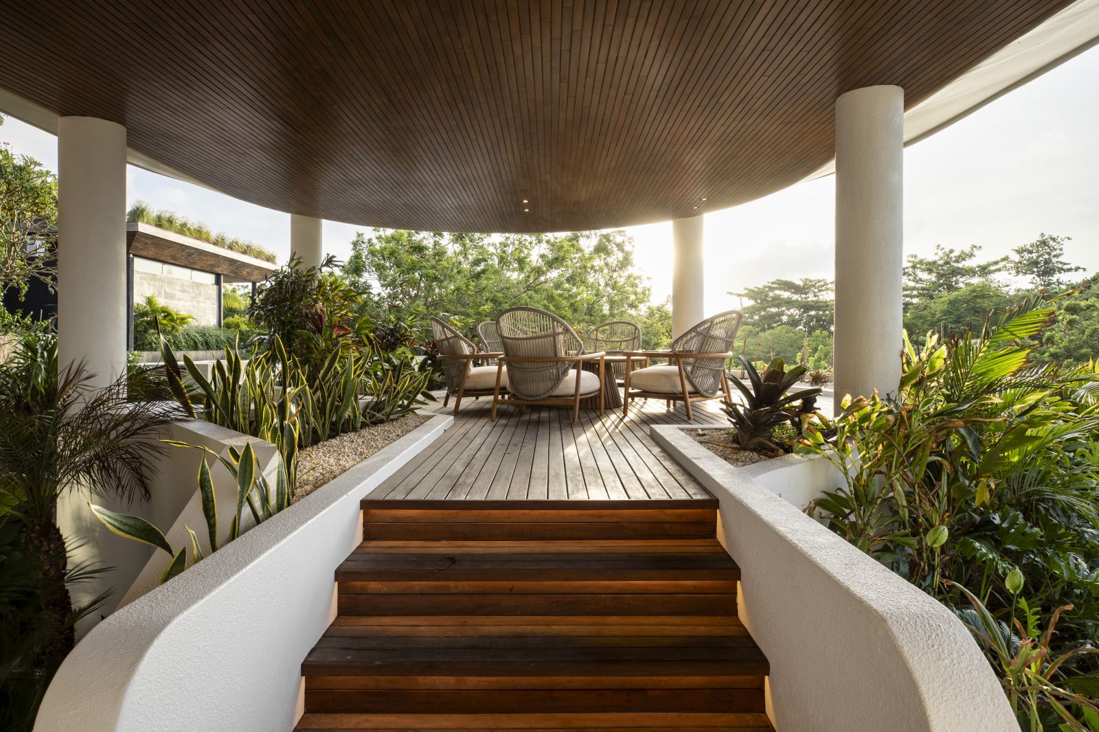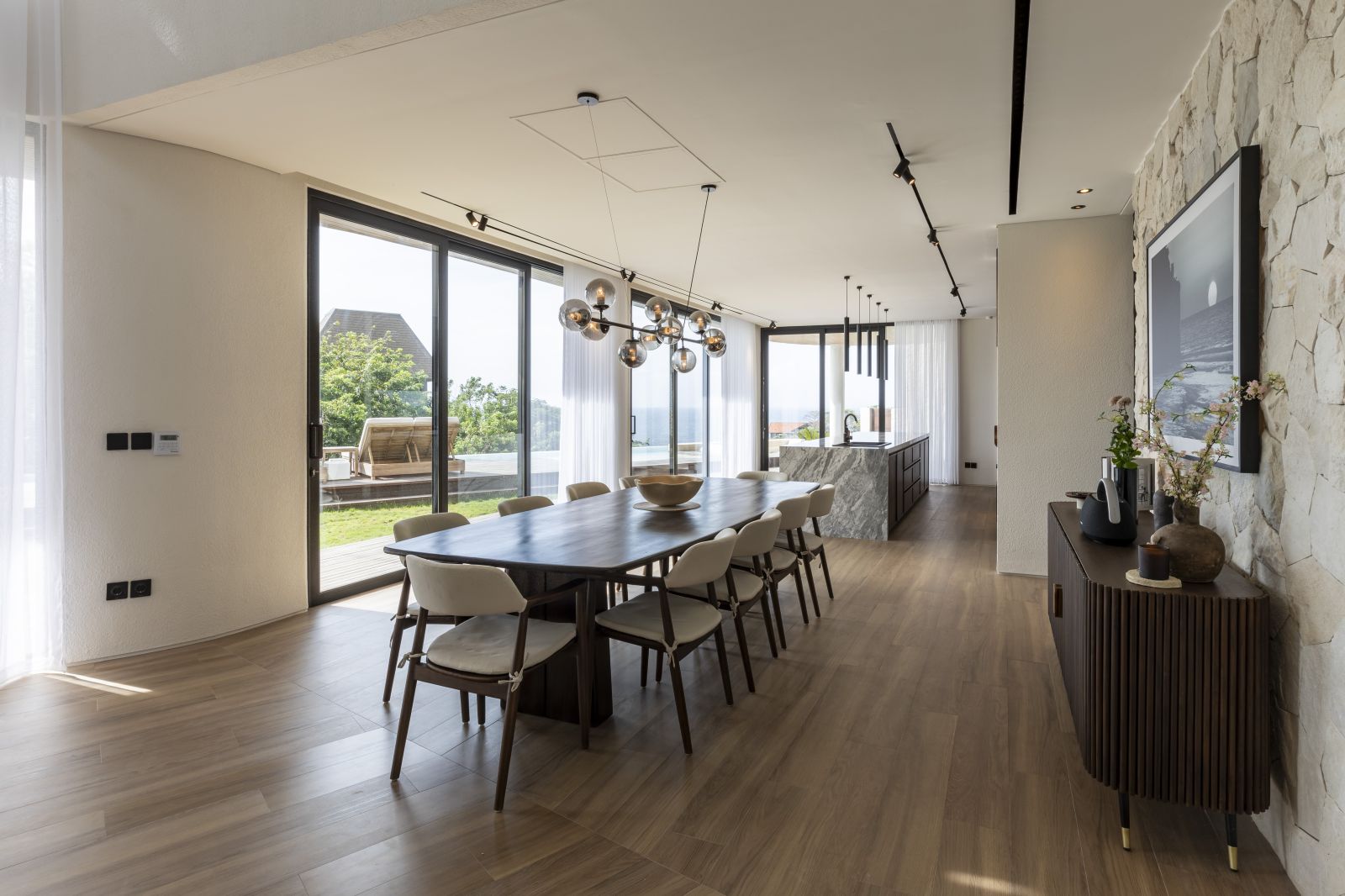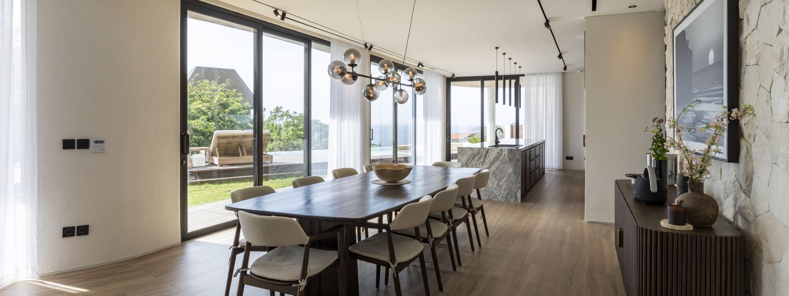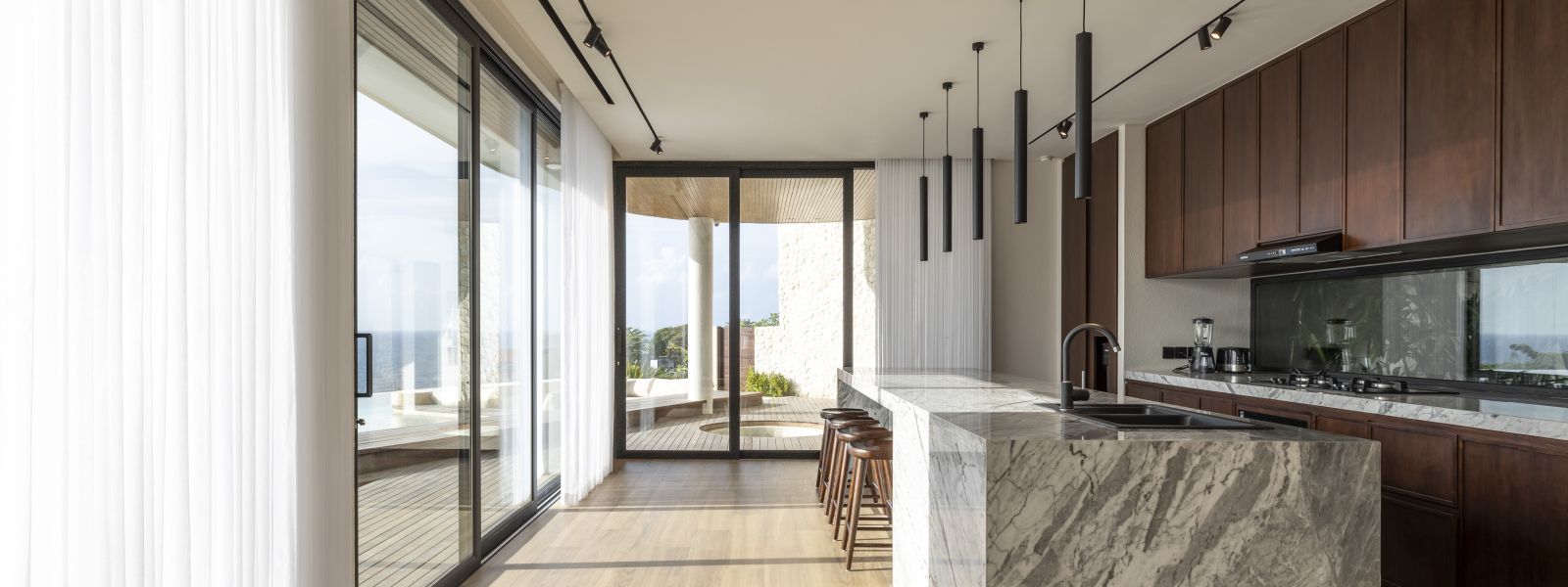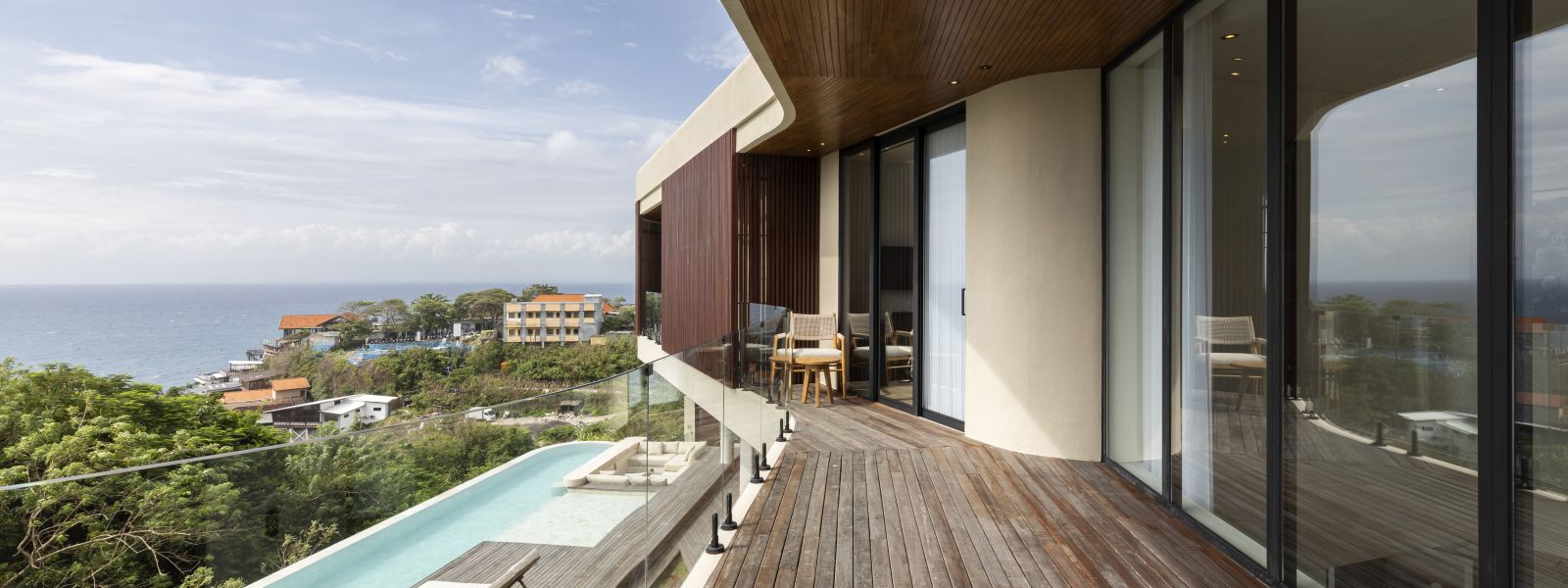 The house features a 25m infinity lap pool with an outdoor sunken lounge and bar, offering in-pool seating and stunning sea views. There’s direct beach access via a private staircase and a covered outdoor seating area not visible in the pictures but shown on the floor plans, located to the right of the pool under the house's overhang.