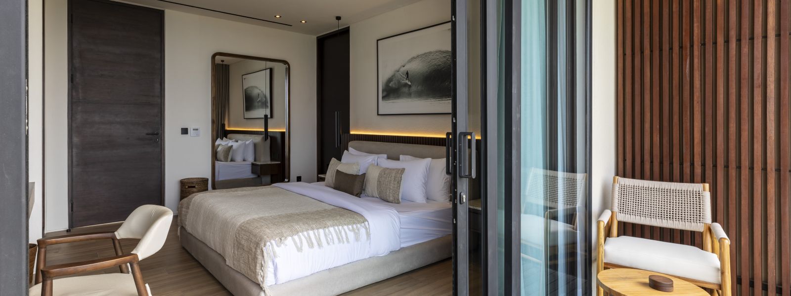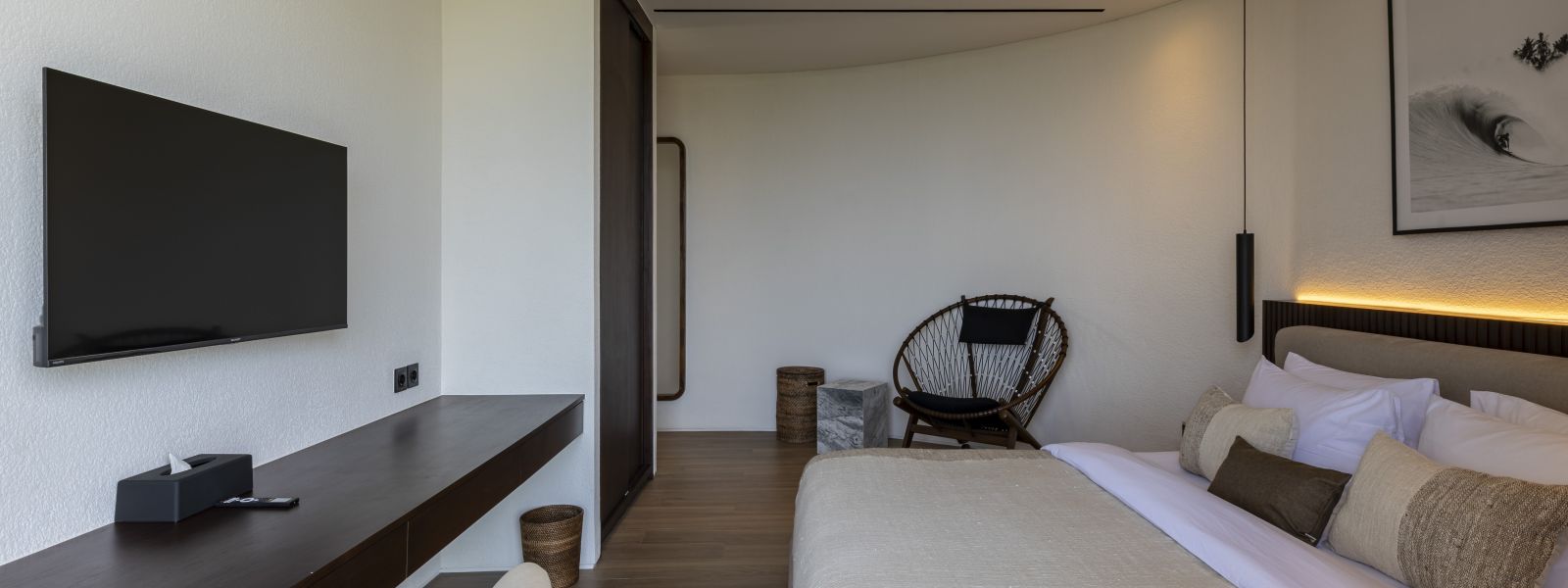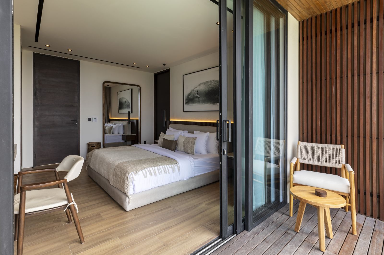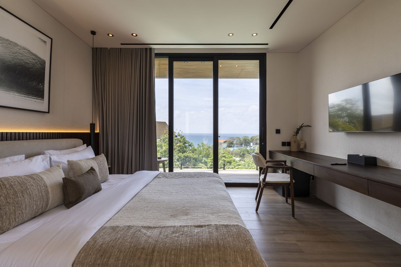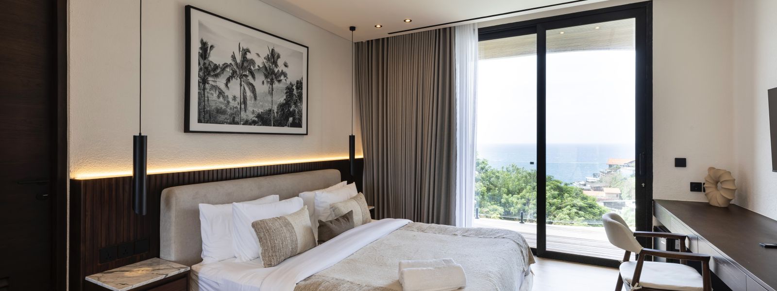The house features a 25m infinity lap pool with an outdoor sunken lounge and bar, offering in-pool seating and stunning sea views. There’s direct beach access via a private staircase and a covered outdoor seating area not visible in the pictures but shown on the floor plans, located to the right of the pool under the house's overhang.