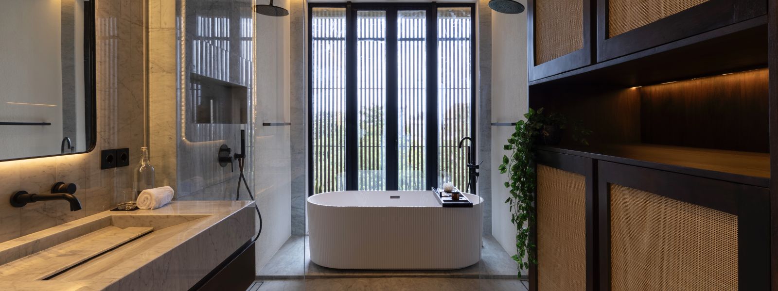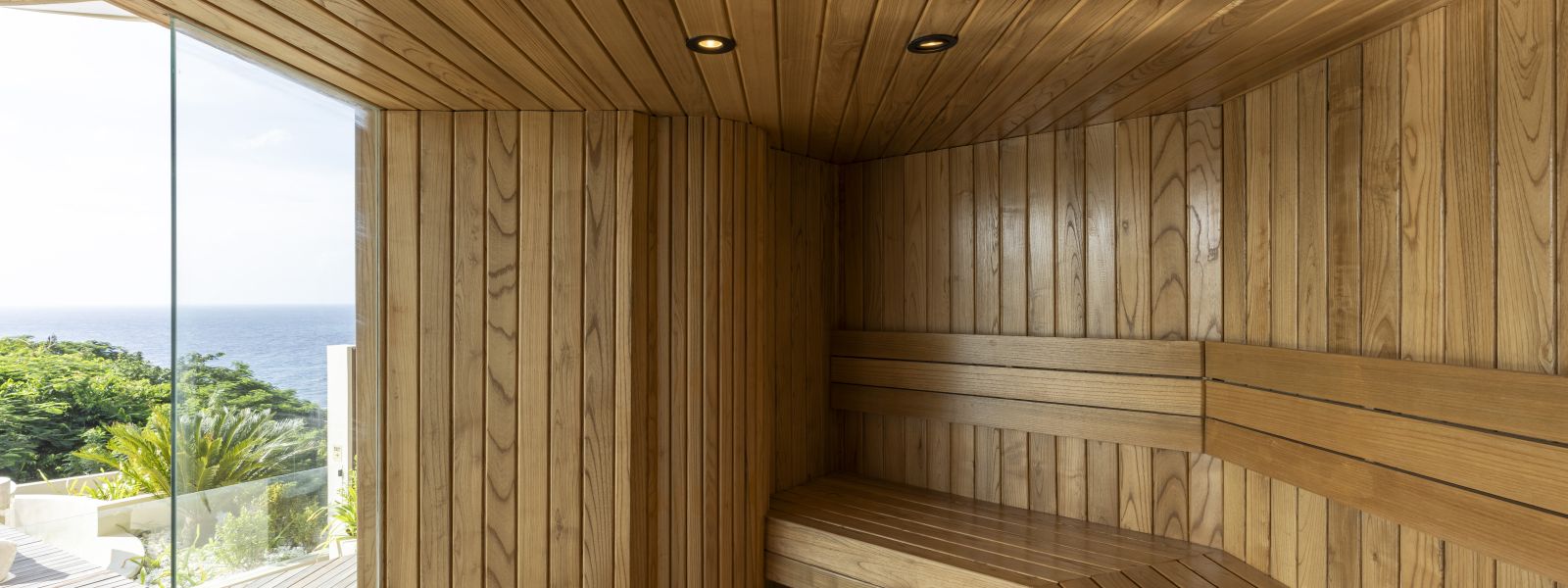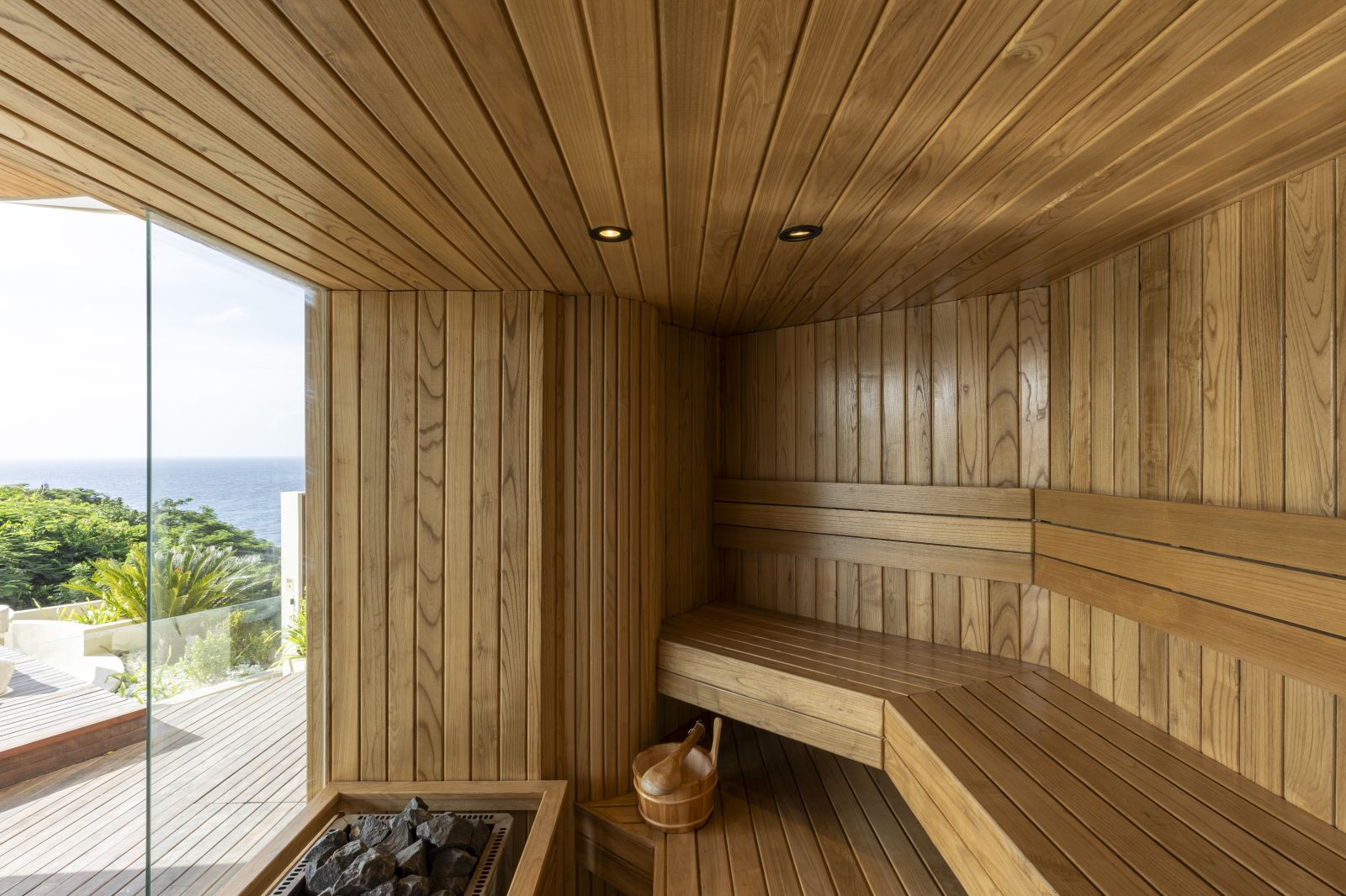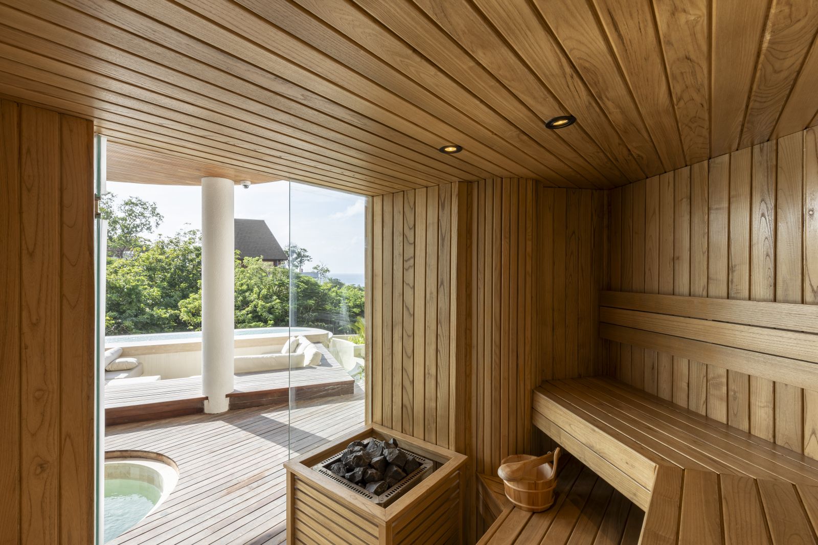 The spa area includes an ice bath and outdoor shower, along with a hidden toilet next to the sauna, which is not visible in the images but included in the floor plans.