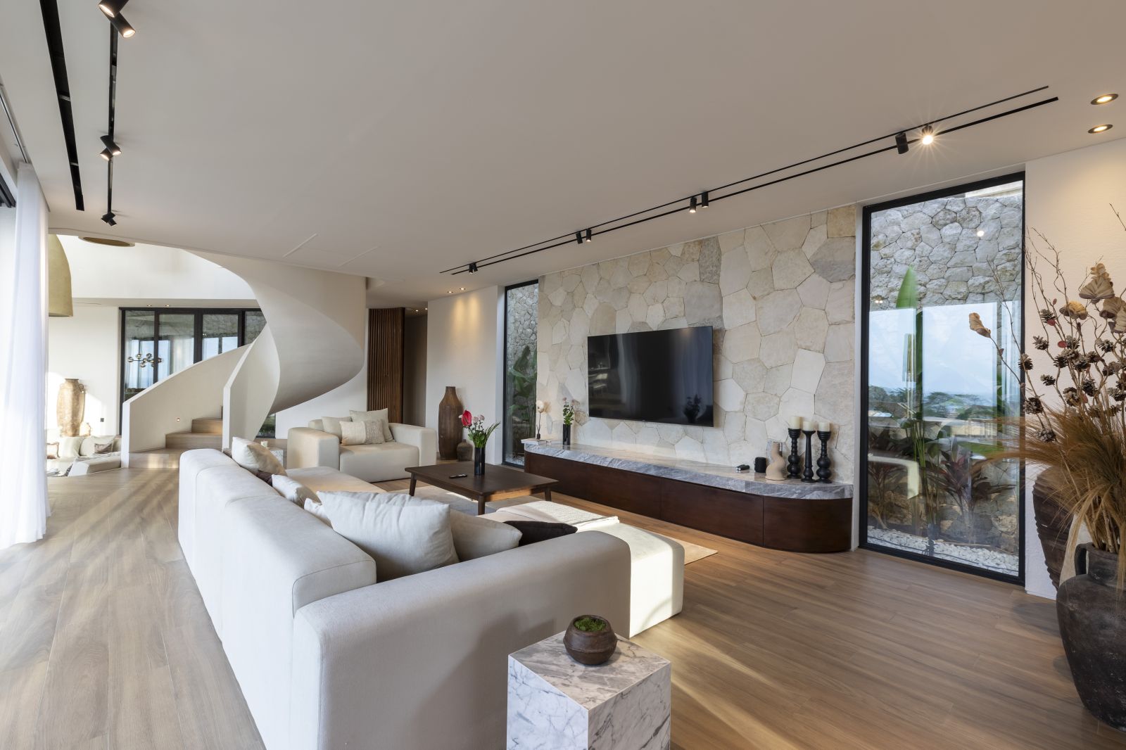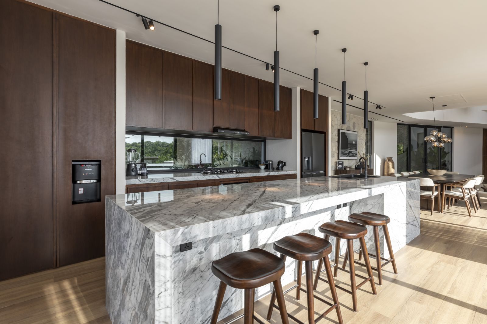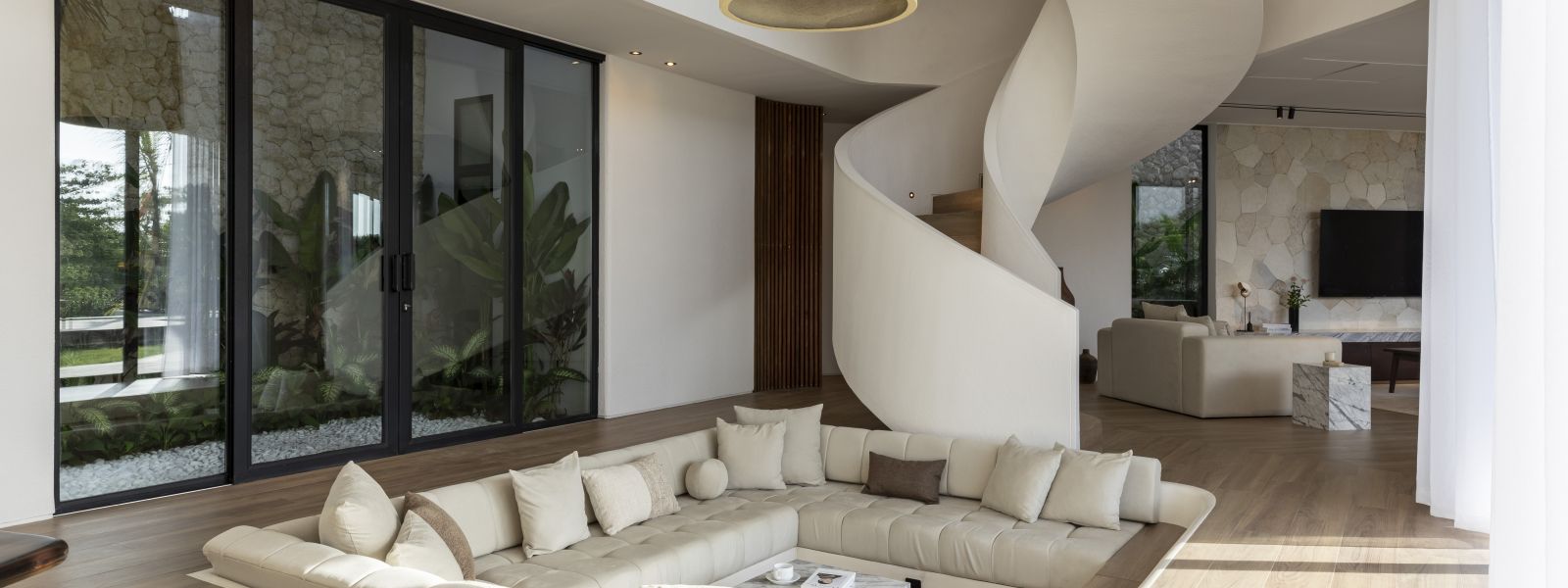 This house offers over 500 sqm of living space and 65 sqm for parking, storage, and staff areas, all on a 628 sqm lot in a private, gated community with 24-hour security. It ensures complete privacy with no visibility from the outside. The property includes 5 bedrooms, 5.5 bathrooms, and private balconies for each bedroom. Inside, you'll find a sunken lounge, a TV area, and an open kitchen and dining space, designed for luxurious living. High-quality materials are used throughout, featuring double-glazed Allure Industries windows for energy efficiency and noise reduction. The ducted air conditioning system keeps the interior clean without visible units, and all bathrooms are finished with marble and equipped with TOTO appliances.
