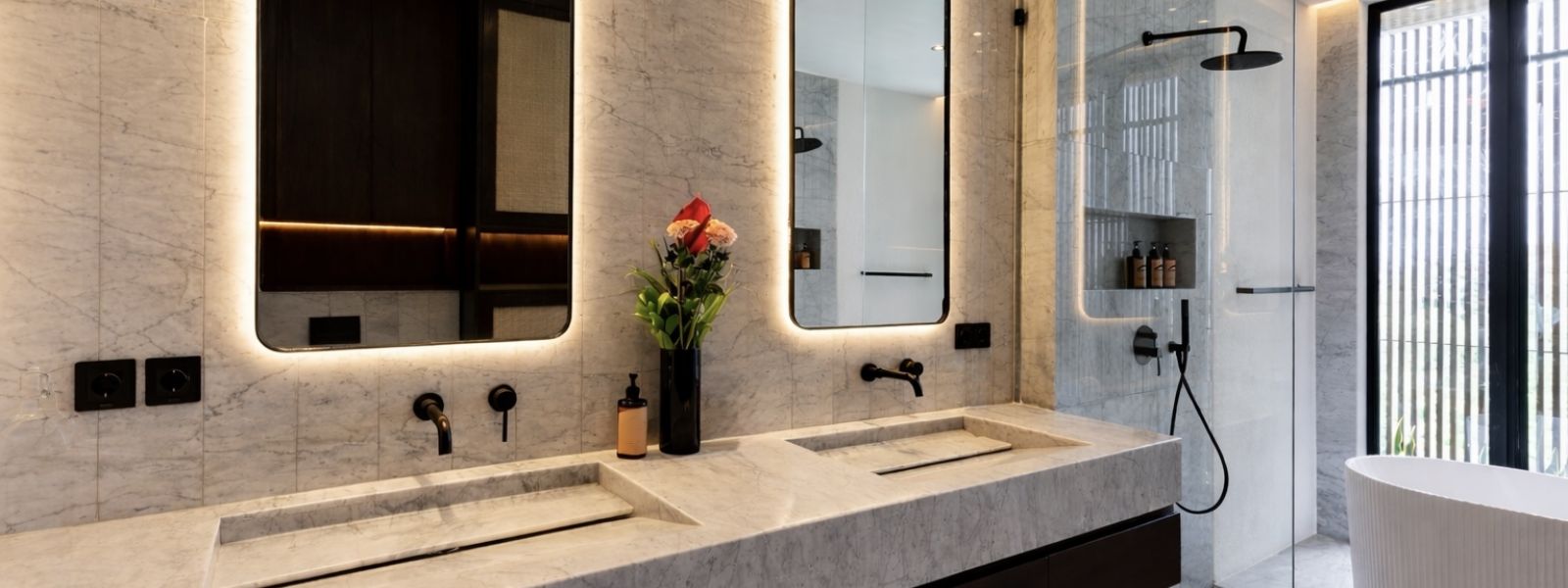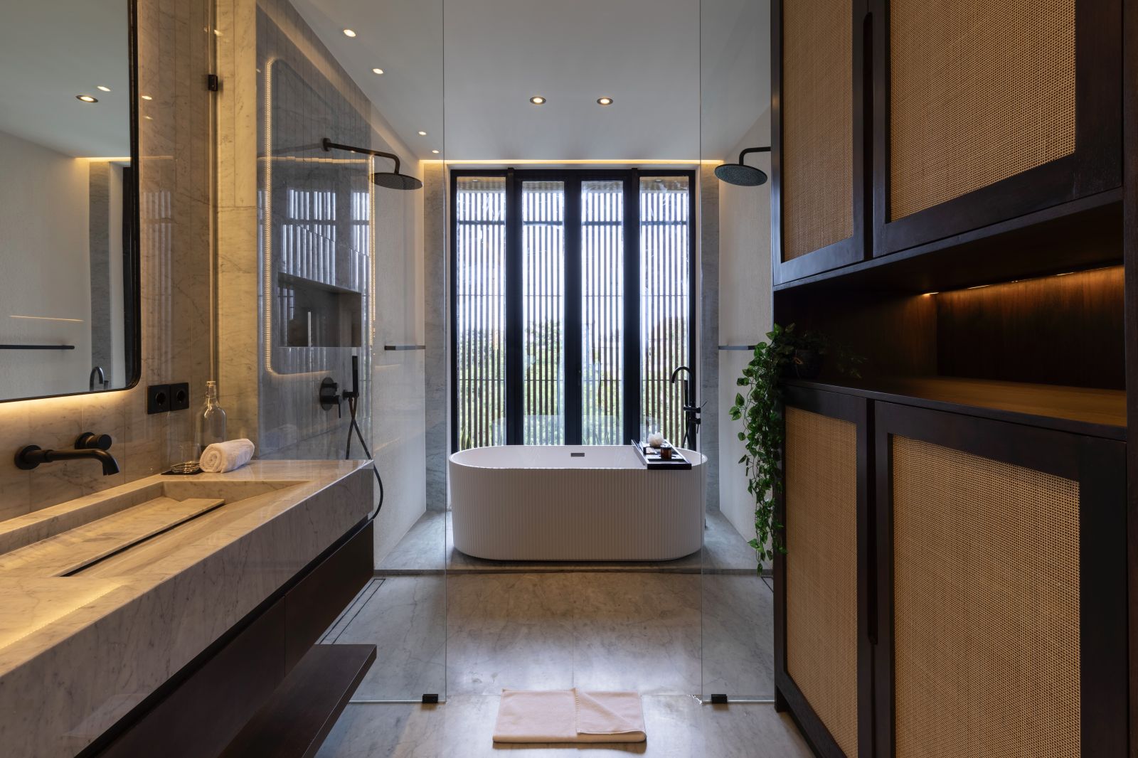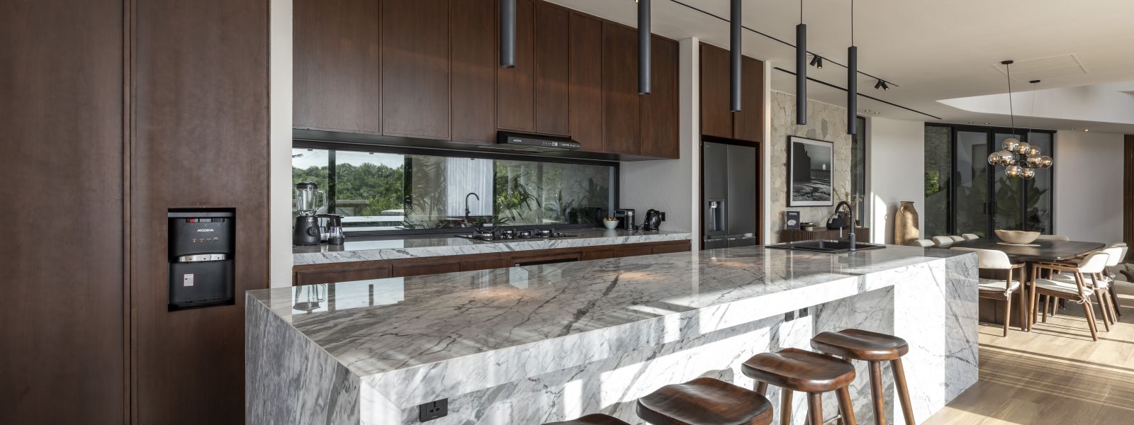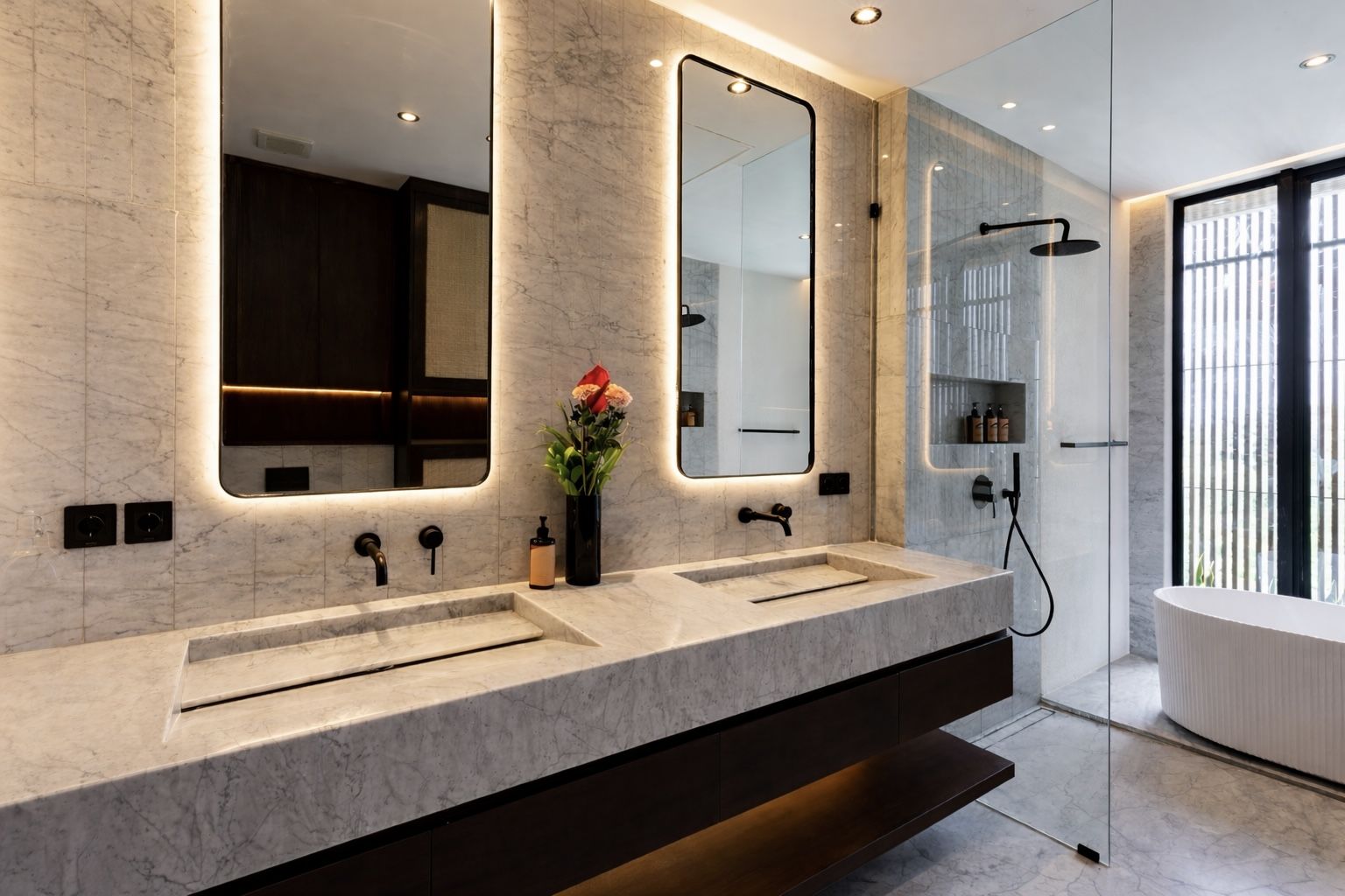 This house offers over 500 sqm of living space and 65 sqm for parking, storage, and staff areas, all on a 628 sqm lot in a private, gated community with 24-hour security. It ensures complete privacy with no visibility from the outside. The property includes 5 bedrooms, 5.5 bathrooms, and private balconies for each bedroom. Inside, you'll find a sunken lounge, a TV area, and an open kitchen and dining space, designed for luxurious living. High-quality materials are used throughout, featuring double-glazed Allure Industries windows for energy efficiency and noise reduction. The ducted air conditioning system keeps the interior clean without visible units, and all bathrooms are finished with marble and equipped with TOTO appliances.