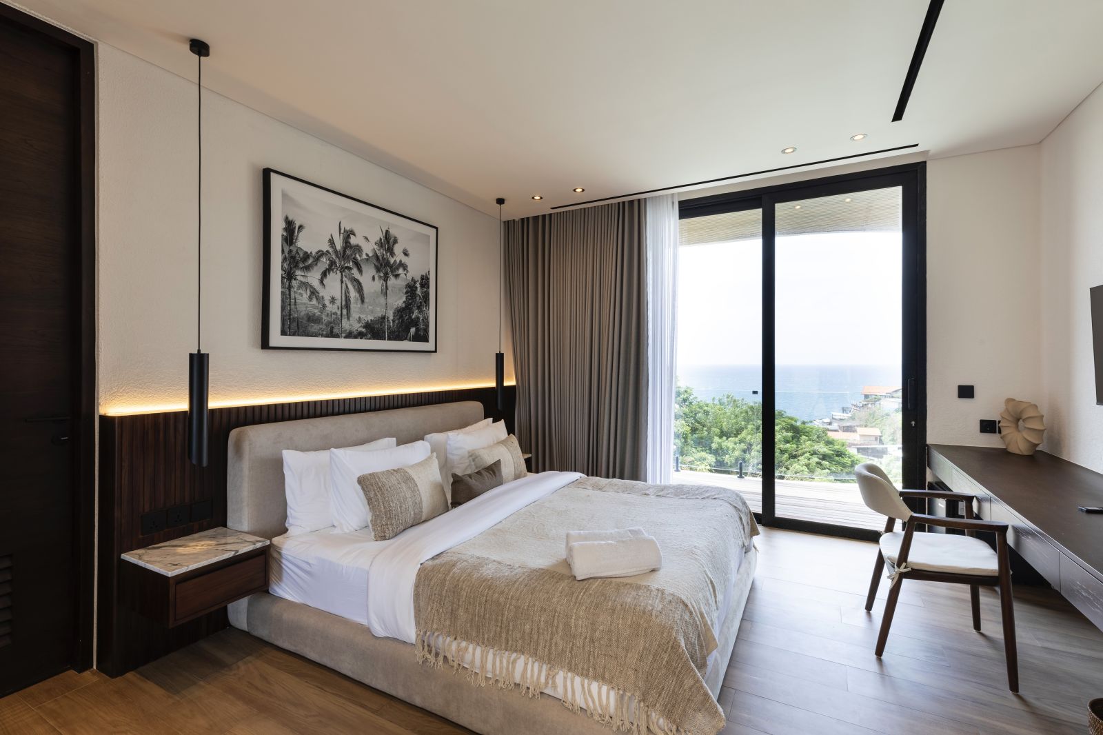 The property includes parking and a staff area with a hidden kitchen for meal preparation. It features a dedicated security hut and a private water bore for a reliable water supply. Several bedrooms, including the master, provide stunning sea views, and the design allows for potential future expansion.