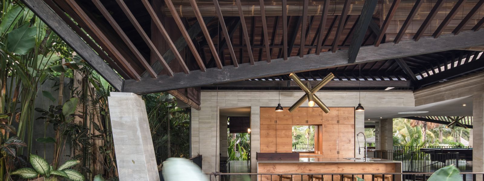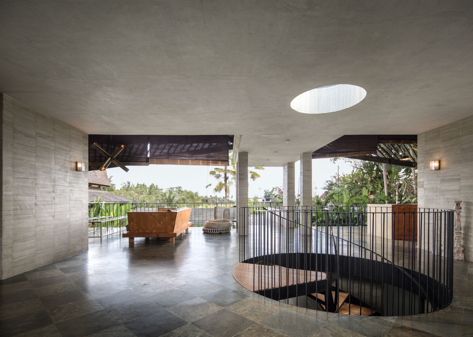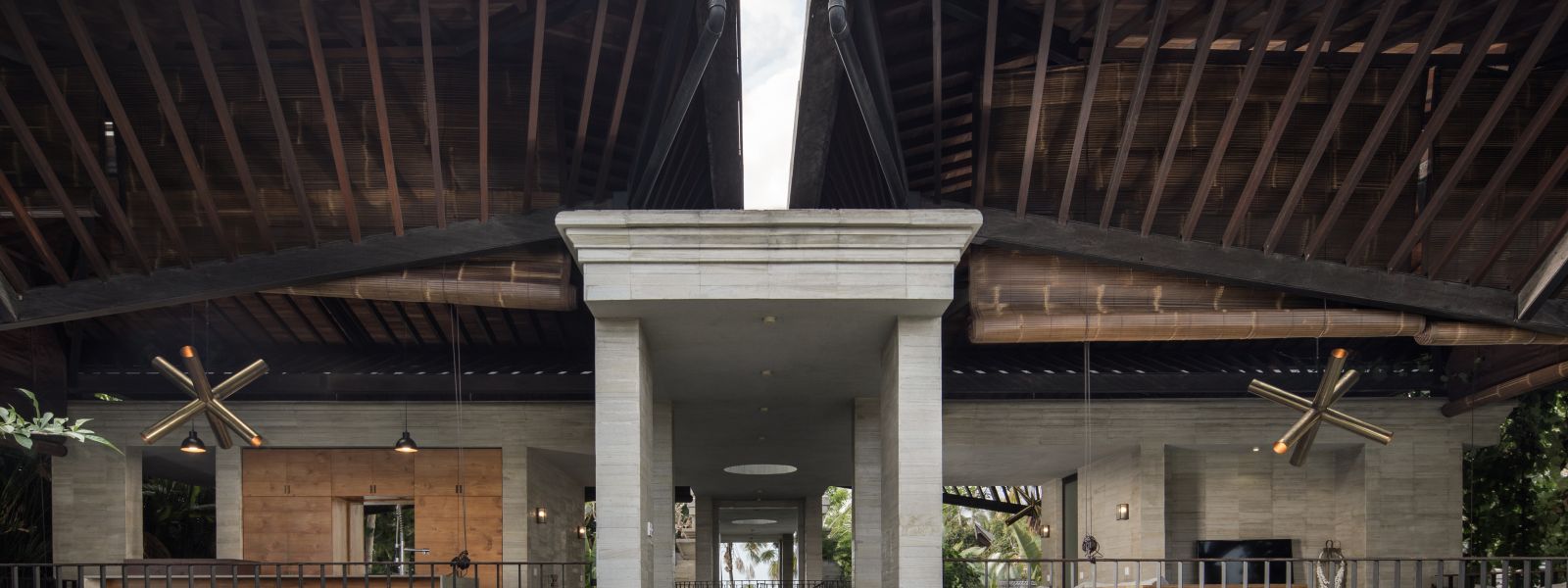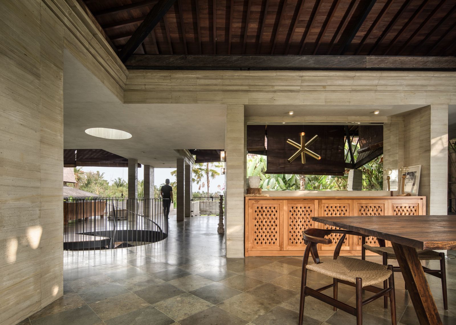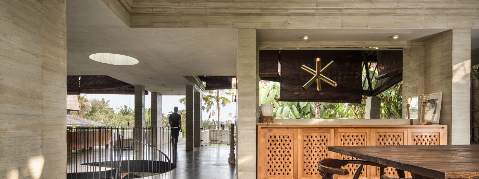 The villa unfolds with a unique arrival sequence: a park-like entry leads to a gate that conceals the lower floor, offering only a glimpse of the dramatic two-part wooden roof. A bridge then carries guests to the main communal level, an airy living space that merges architecture and landscape. The layout follows a puristic rectangular floor plan, divided into four equal zones and anchored by a central spiral staircase that links both floors. Each space, kitchen, lounge, dining, and playroom, is crowned with its own roof, inspired by the Ravenala plant (traveller’s palm), whose fan-like form naturally aligns east-west, shaping the villa’s iconic silhouette.