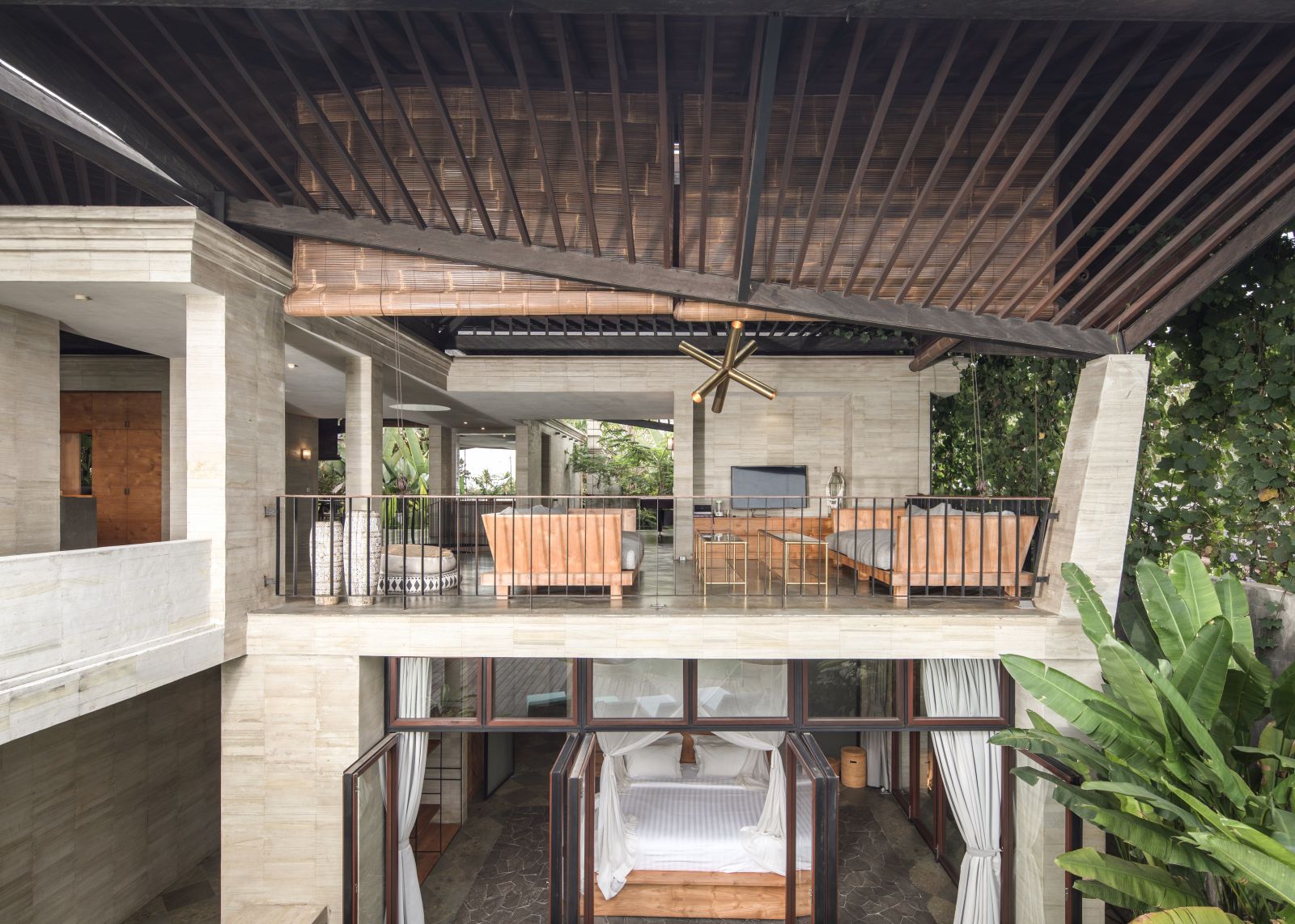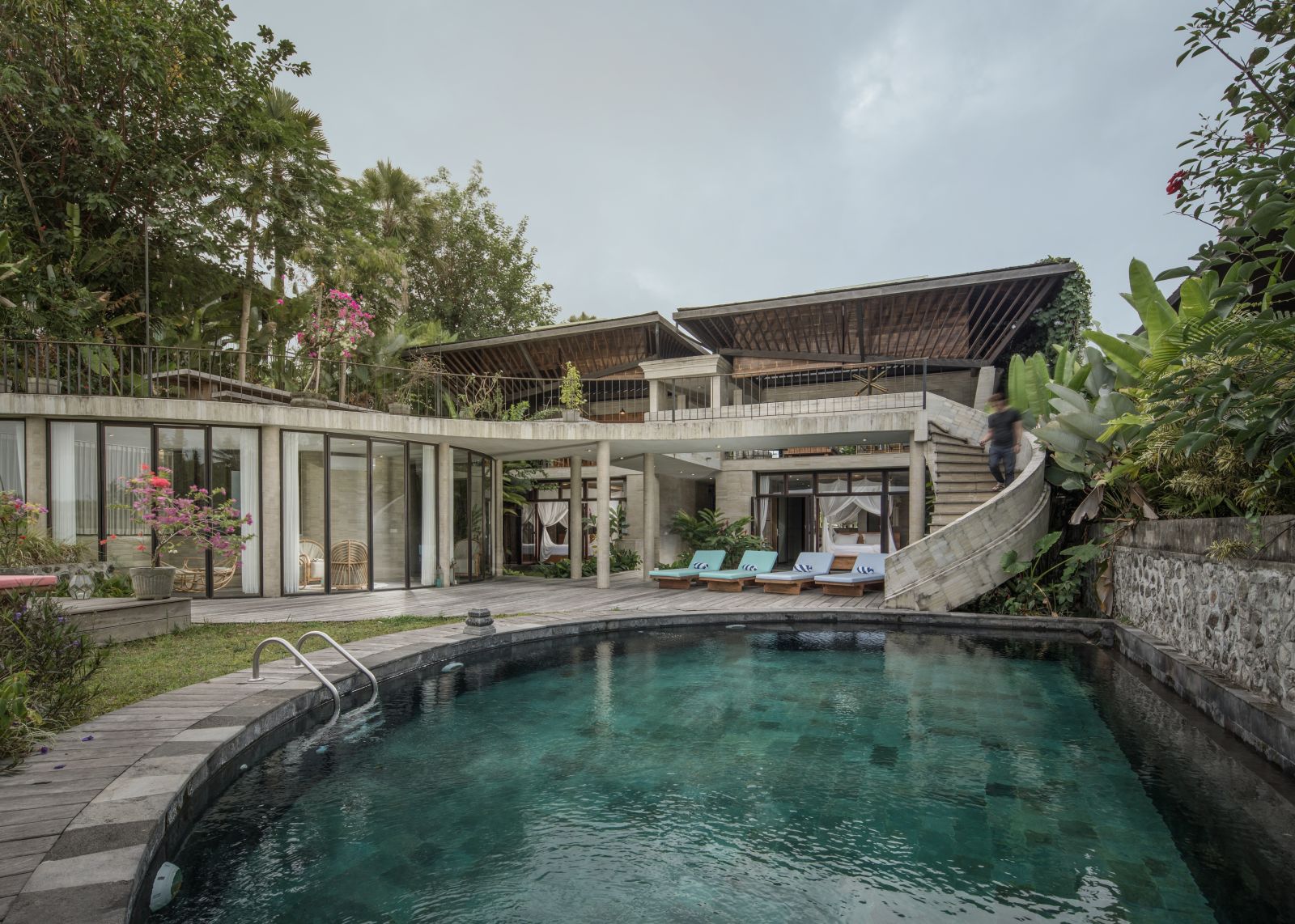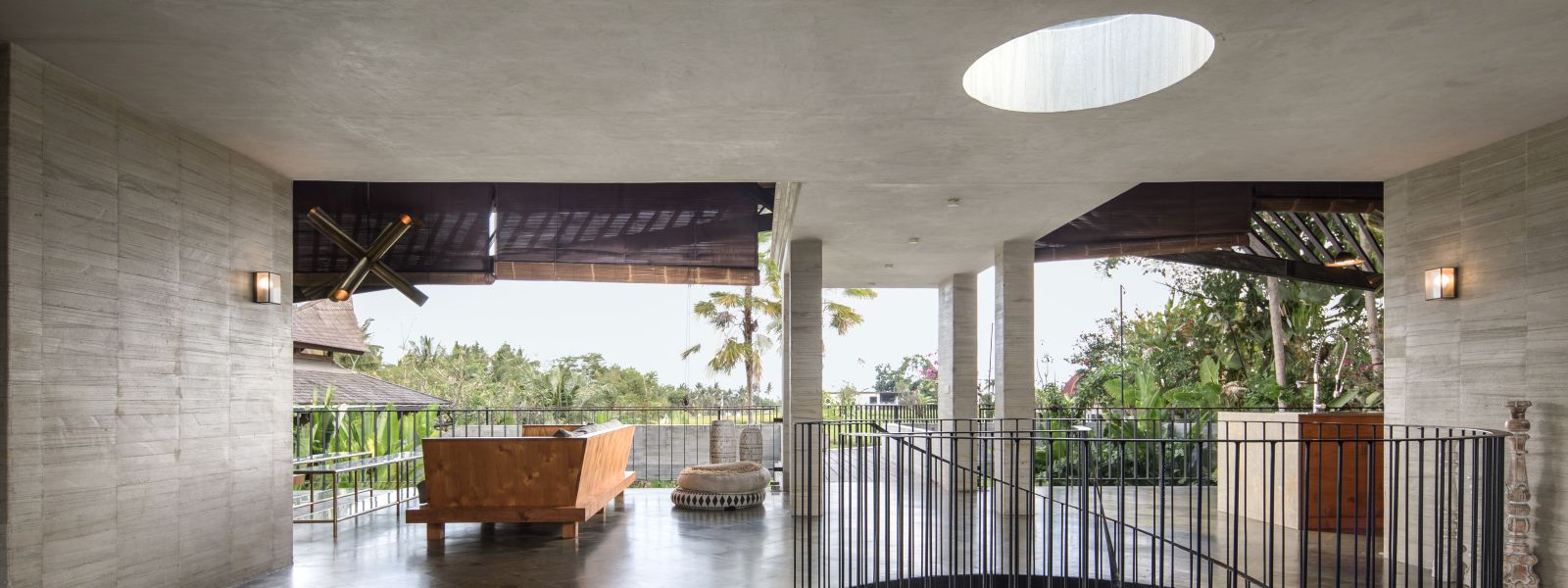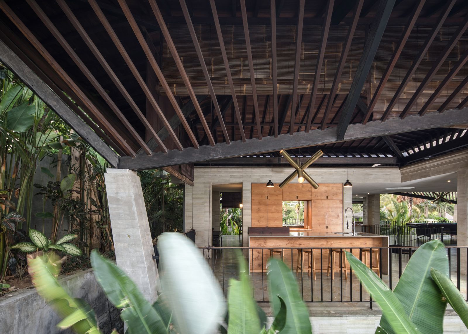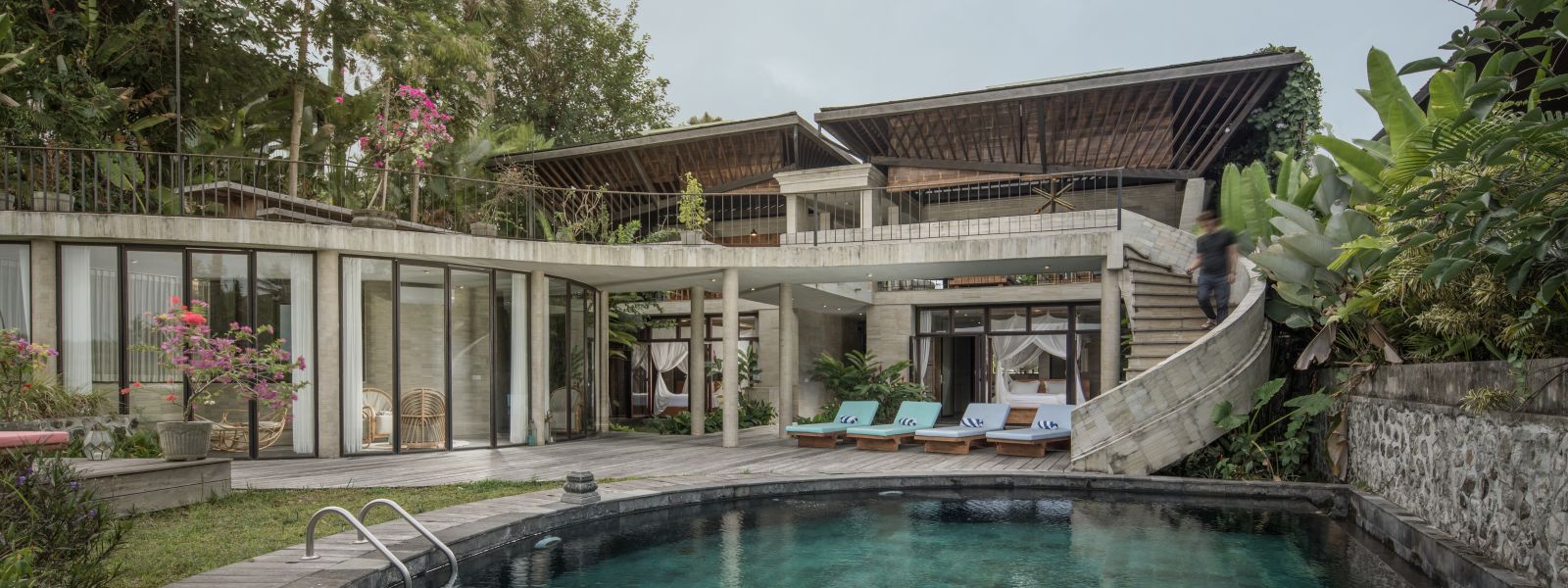 The villa unfolds with a unique arrival sequence: a park-like entry leads to a gate that conceals the lower floor, offering only a glimpse of the dramatic two-part wooden roof. A bridge then carries guests to the main communal level, an airy living space that merges architecture and landscape. The layout follows a puristic rectangular floor plan, divided into four equal zones and anchored by a central spiral staircase that links both floors. Each space, kitchen, lounge, dining, and playroom, is crowned with its own roof, inspired by the Ravenala plant (traveller’s palm), whose fan-like form naturally aligns east-west, shaping the villa’s iconic silhouette.