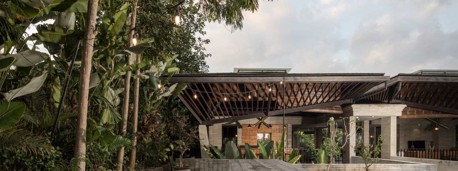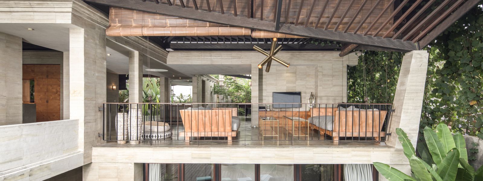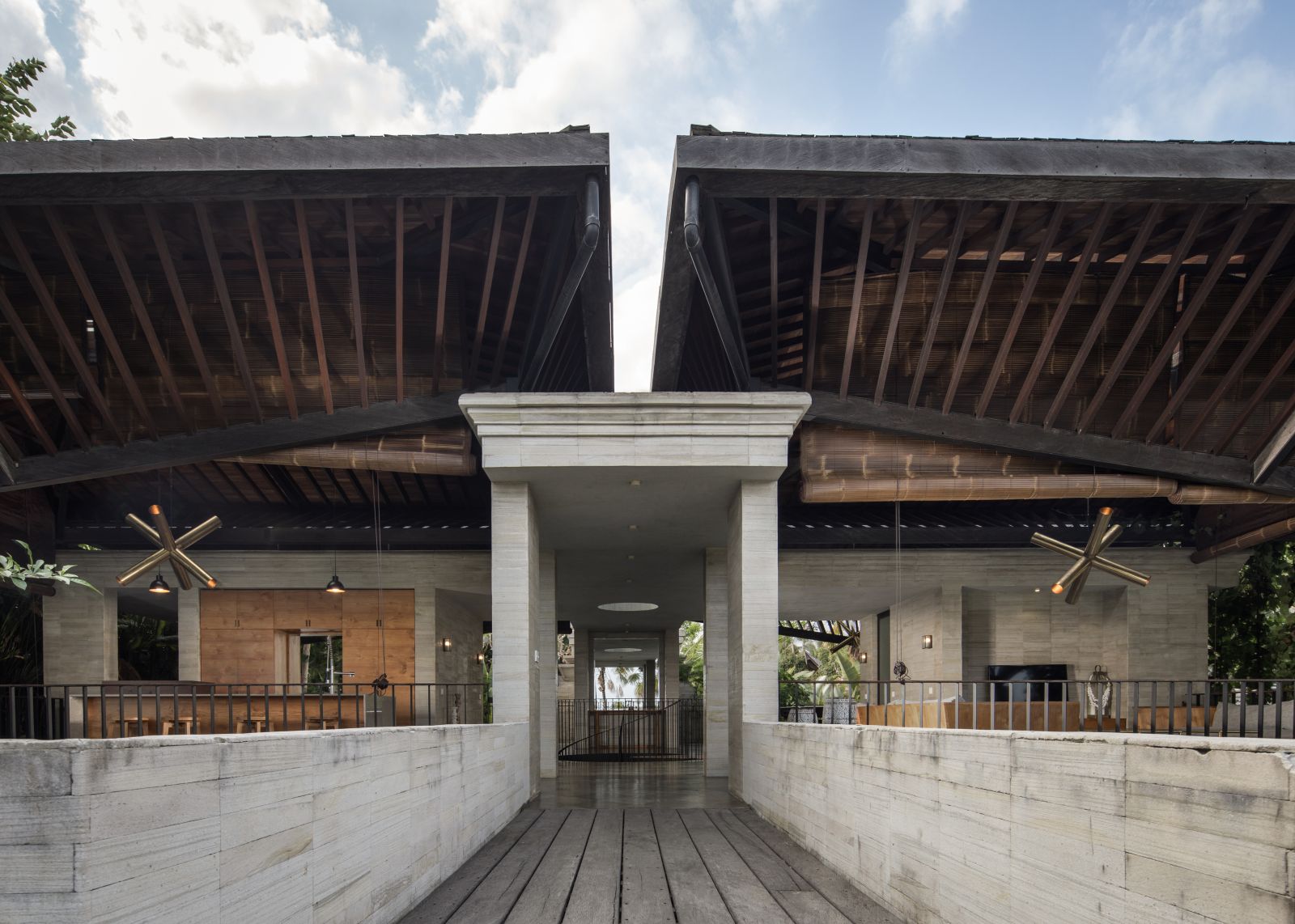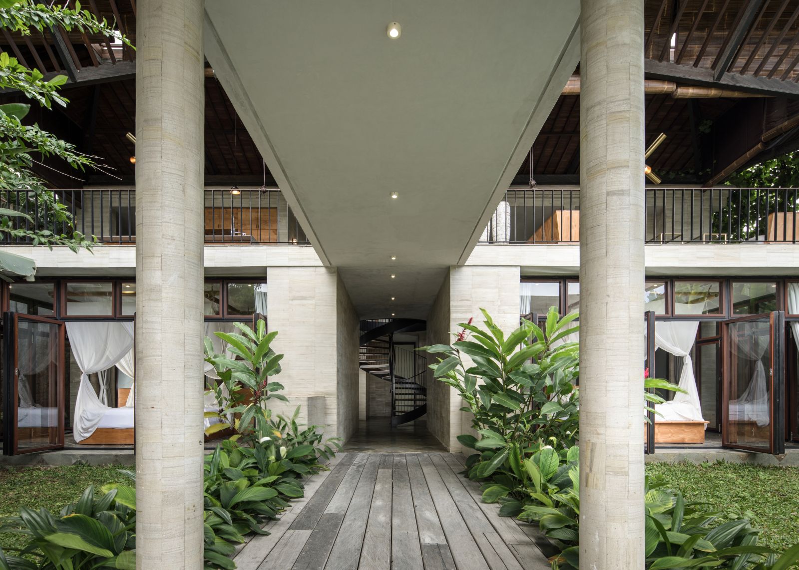 The villa unfolds with a unique arrival sequence: a park-like entry leads to a gate that conceals the lower floor, offering only a glimpse of the dramatic two-part wooden roof. A bridge then carries guests to the main communal level, an airy living space that merges architecture and landscape. The layout follows a puristic rectangular floor plan, divided into four equal zones and anchored by a central spiral staircase that links both floors. Each space, kitchen, lounge, dining, and playroom, is crowned with its own roof, inspired by the Ravenala plant (traveller’s palm), whose fan-like form naturally aligns east-west, shaping the villa’s iconic silhouette.