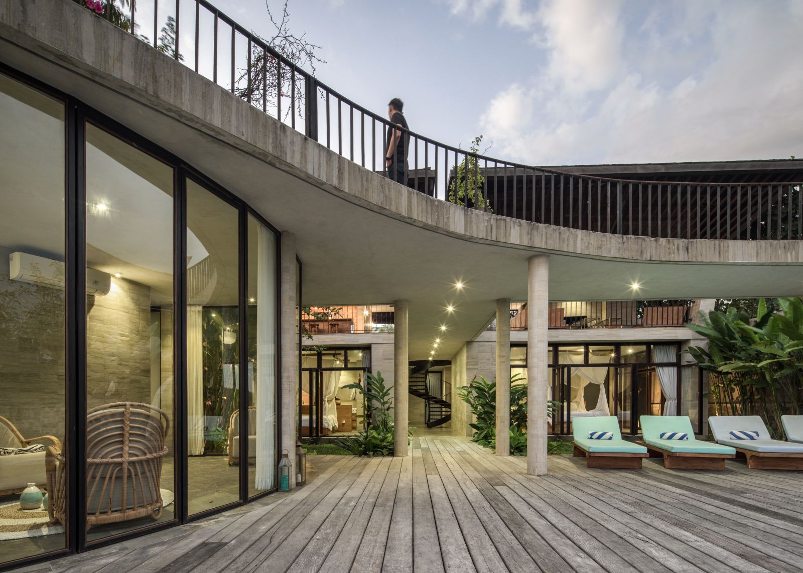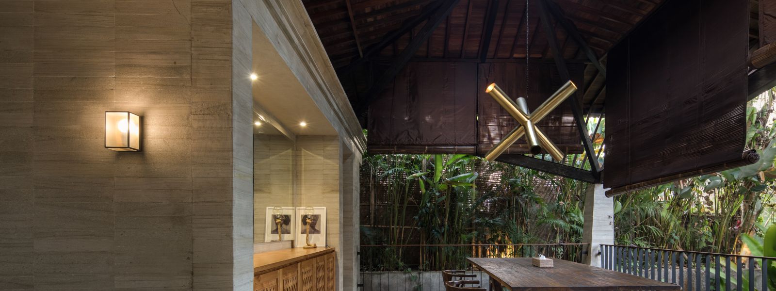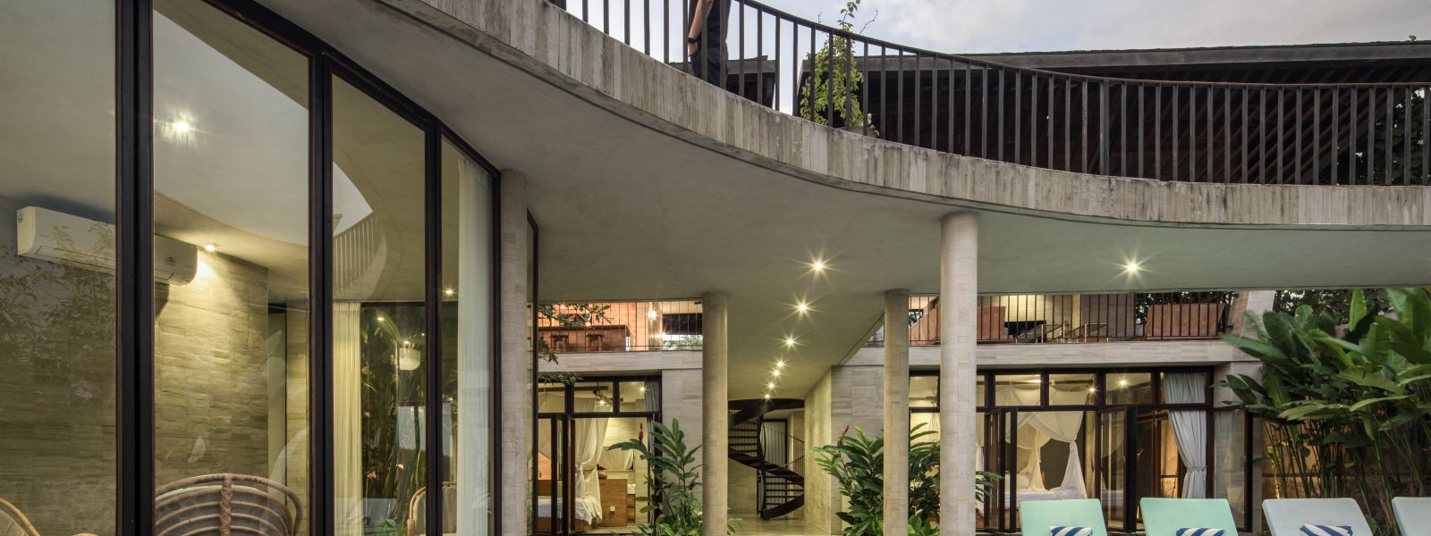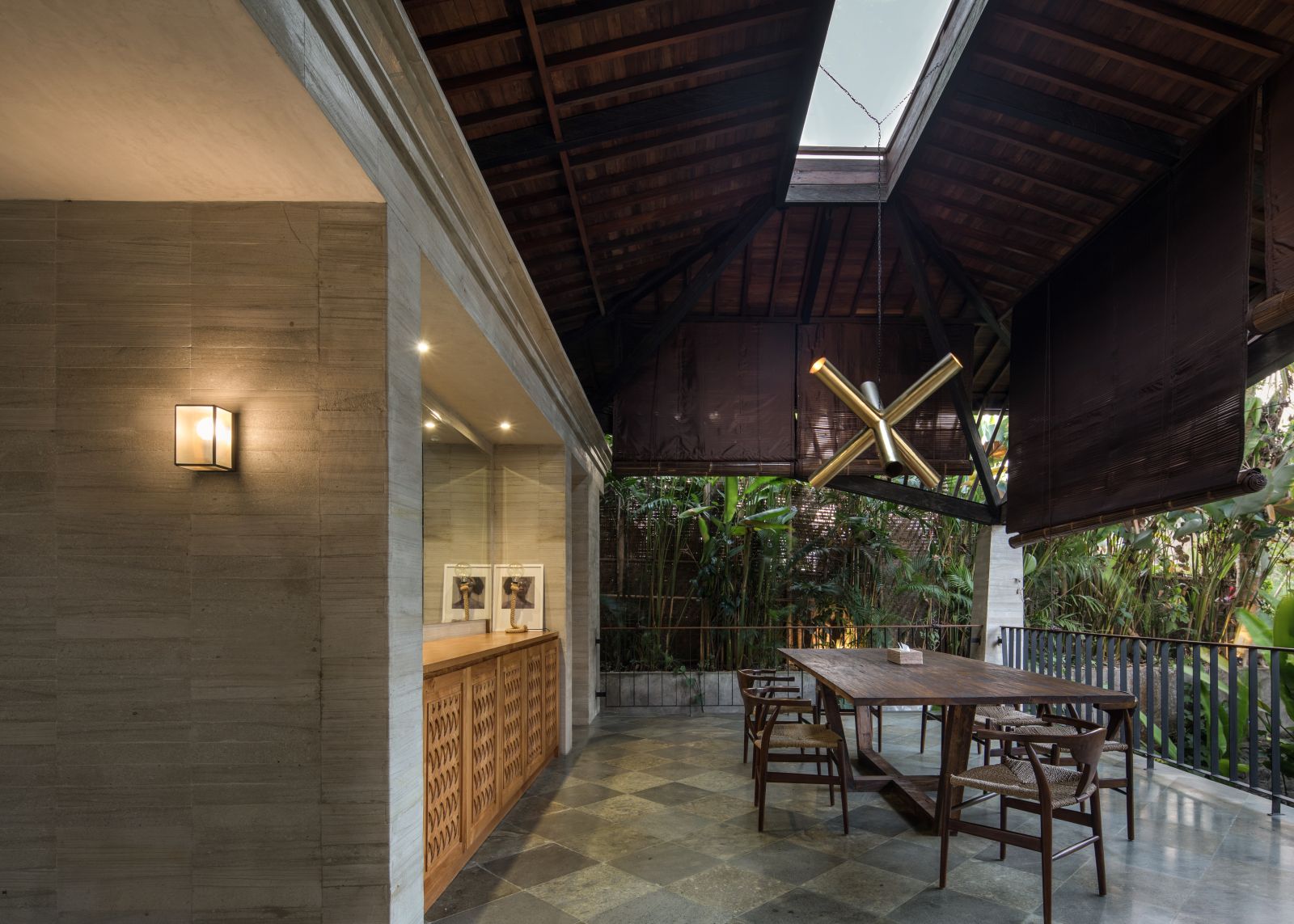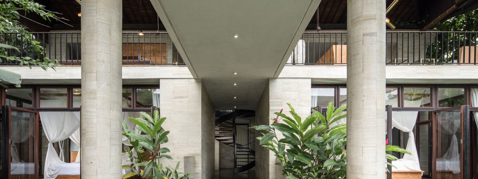 The villa unfolds with a unique arrival sequence: a park-like entry leads to a gate that conceals the lower floor, offering only a glimpse of the dramatic two-part wooden roof. A bridge then carries guests to the main communal level, an airy living space that merges architecture and landscape. The layout follows a puristic rectangular floor plan, divided into four equal zones and anchored by a central spiral staircase that links both floors. Each space, kitchen, lounge, dining, and playroom, is crowned with its own roof, inspired by the Ravenala plant (traveller’s palm), whose fan-like form naturally aligns east-west, shaping the villa’s iconic silhouette.