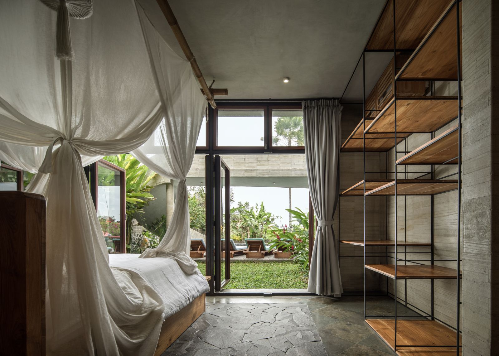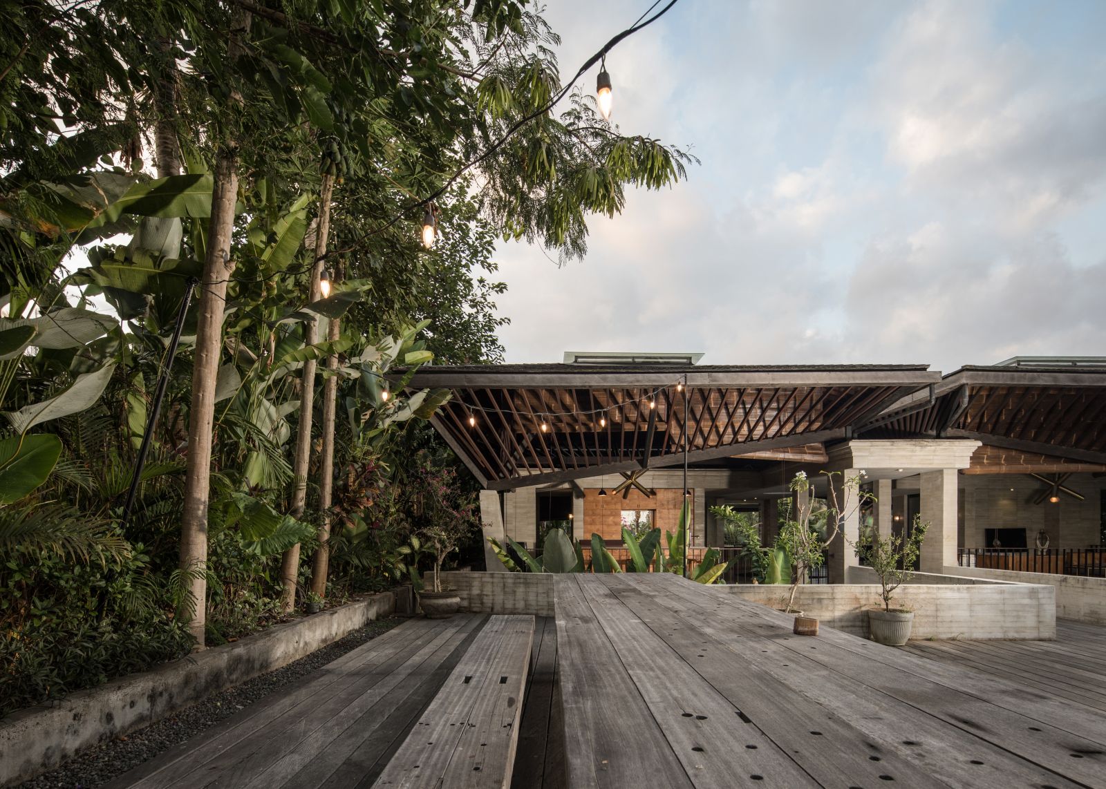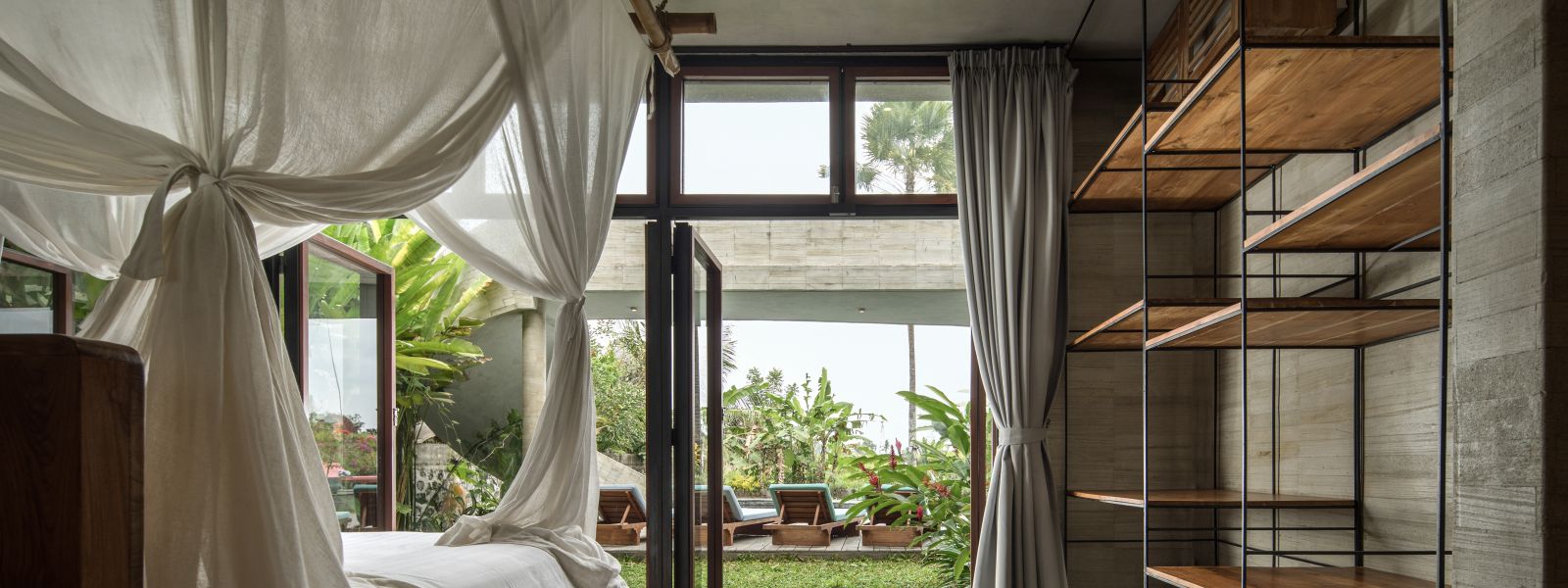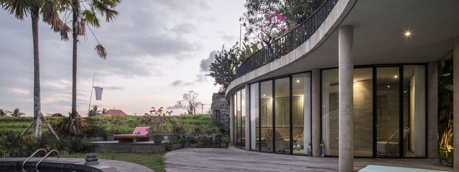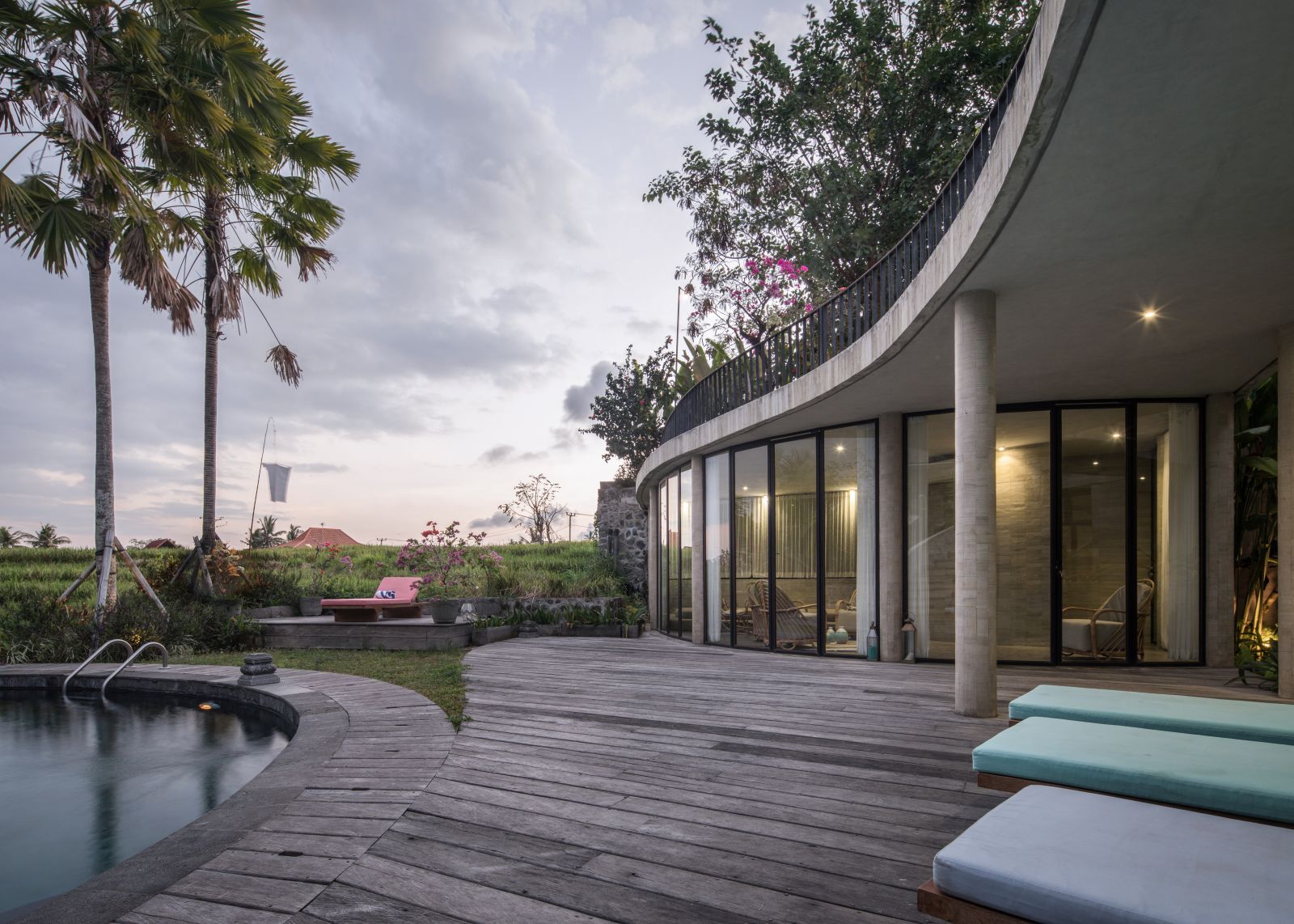 The villa unfolds with a unique arrival sequence: a park-like entry leads to a gate that conceals the lower floor, offering only a glimpse of the dramatic two-part wooden roof. A bridge then carries guests to the main communal level, an airy living space that merges architecture and landscape. The layout follows a puristic rectangular floor plan, divided into four equal zones and anchored by a central spiral staircase that links both floors. Each space, kitchen, lounge, dining, and playroom, is crowned with its own roof, inspired by the Ravenala plant (traveller’s palm), whose fan-like form naturally aligns east-west, shaping the villa’s iconic silhouette.