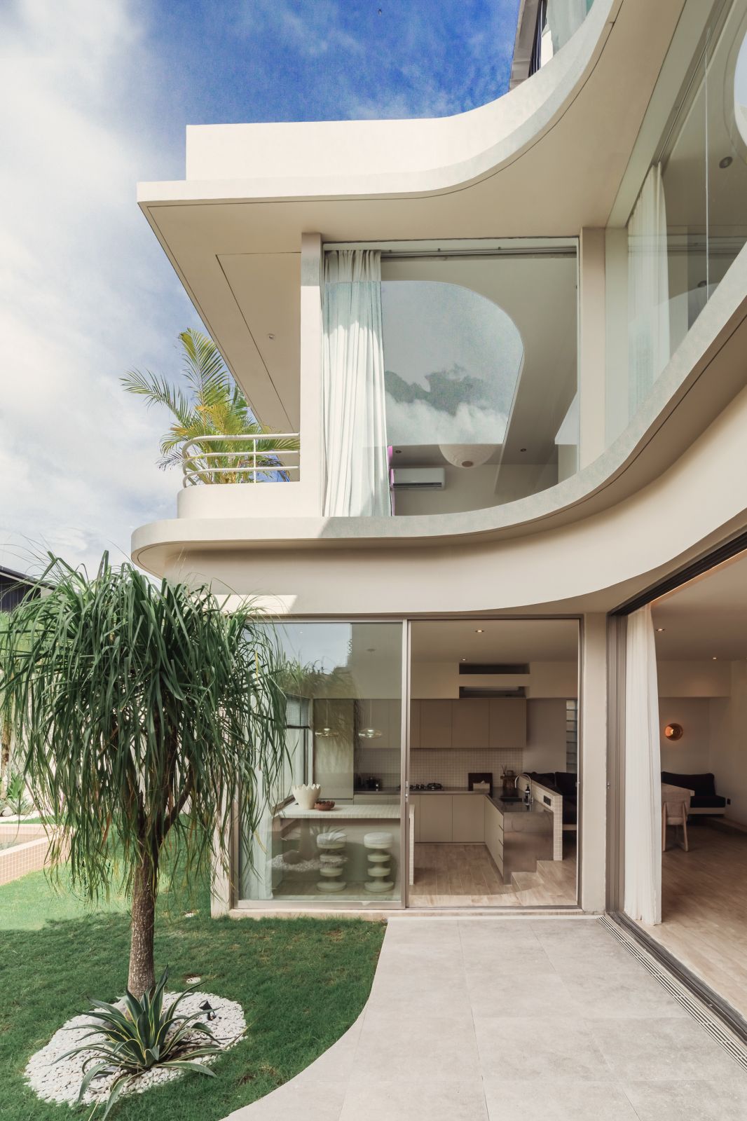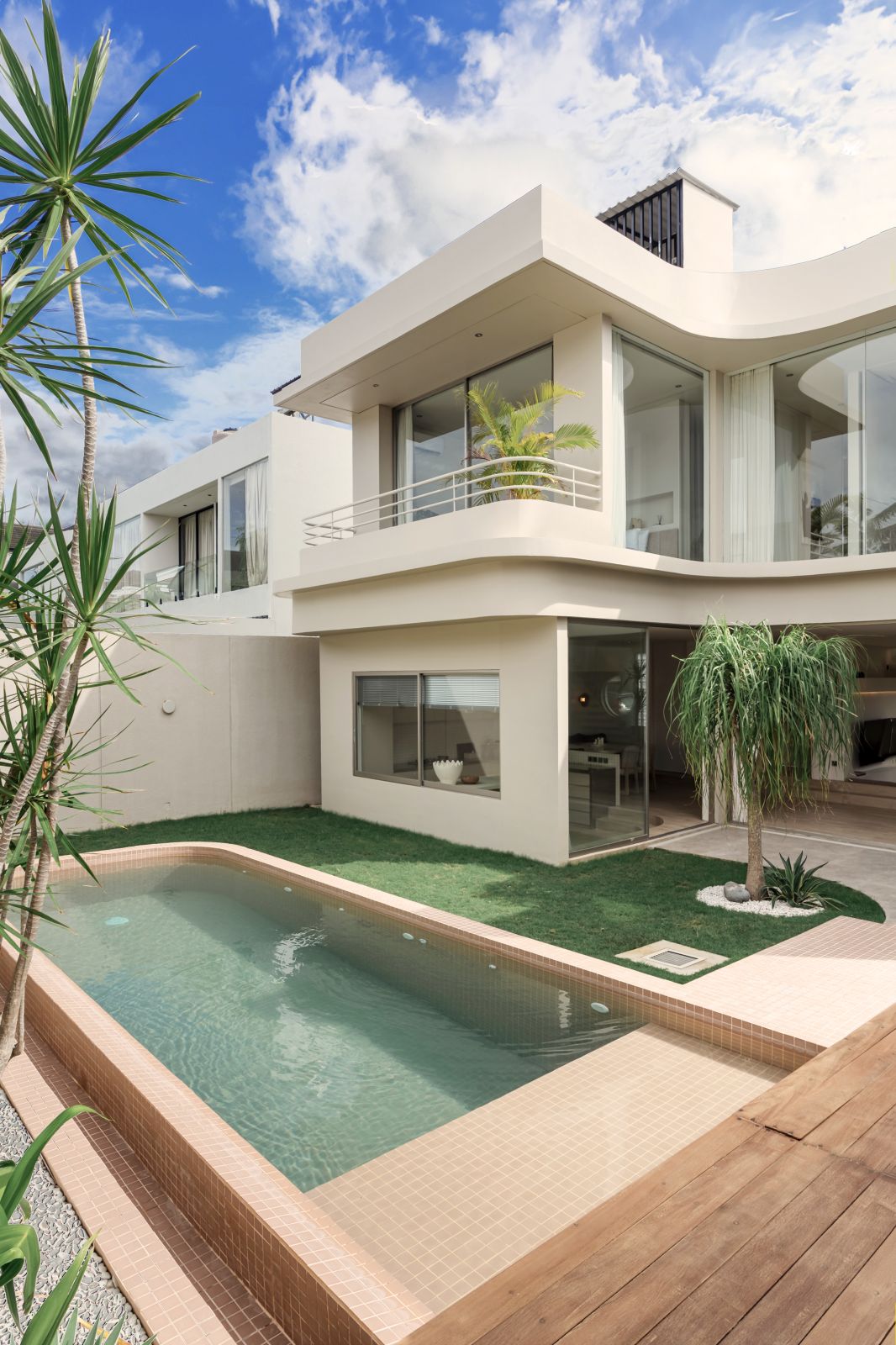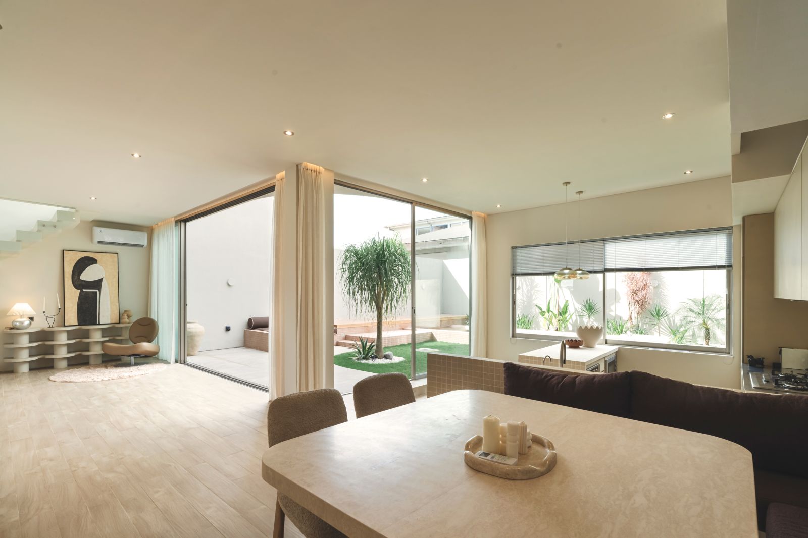 The house has two levels. On the ground floor is a dining area, a super modern kitchen with all amenities, and a pool with an outdoor lounge area. The second floor offers three bedrooms with ensuites.