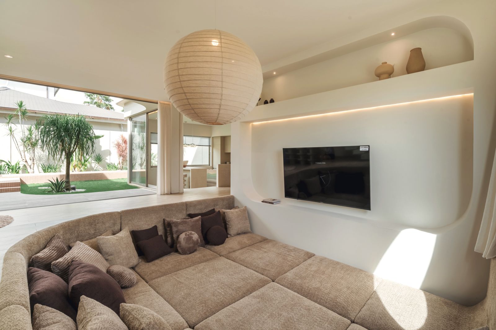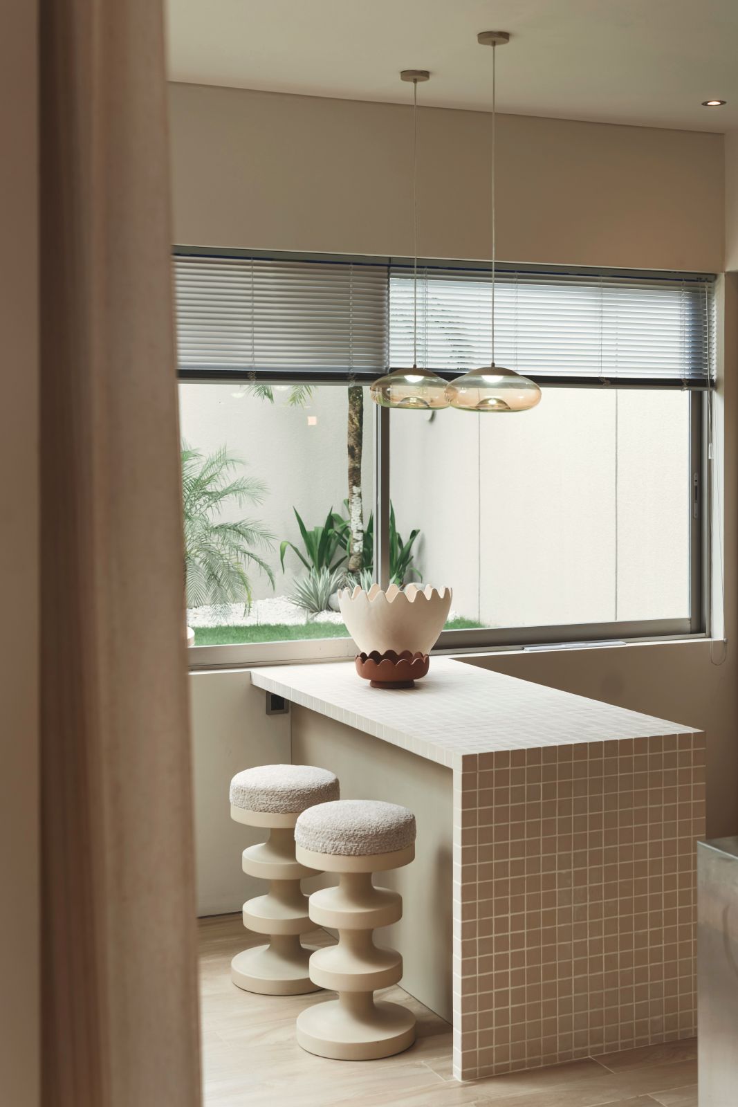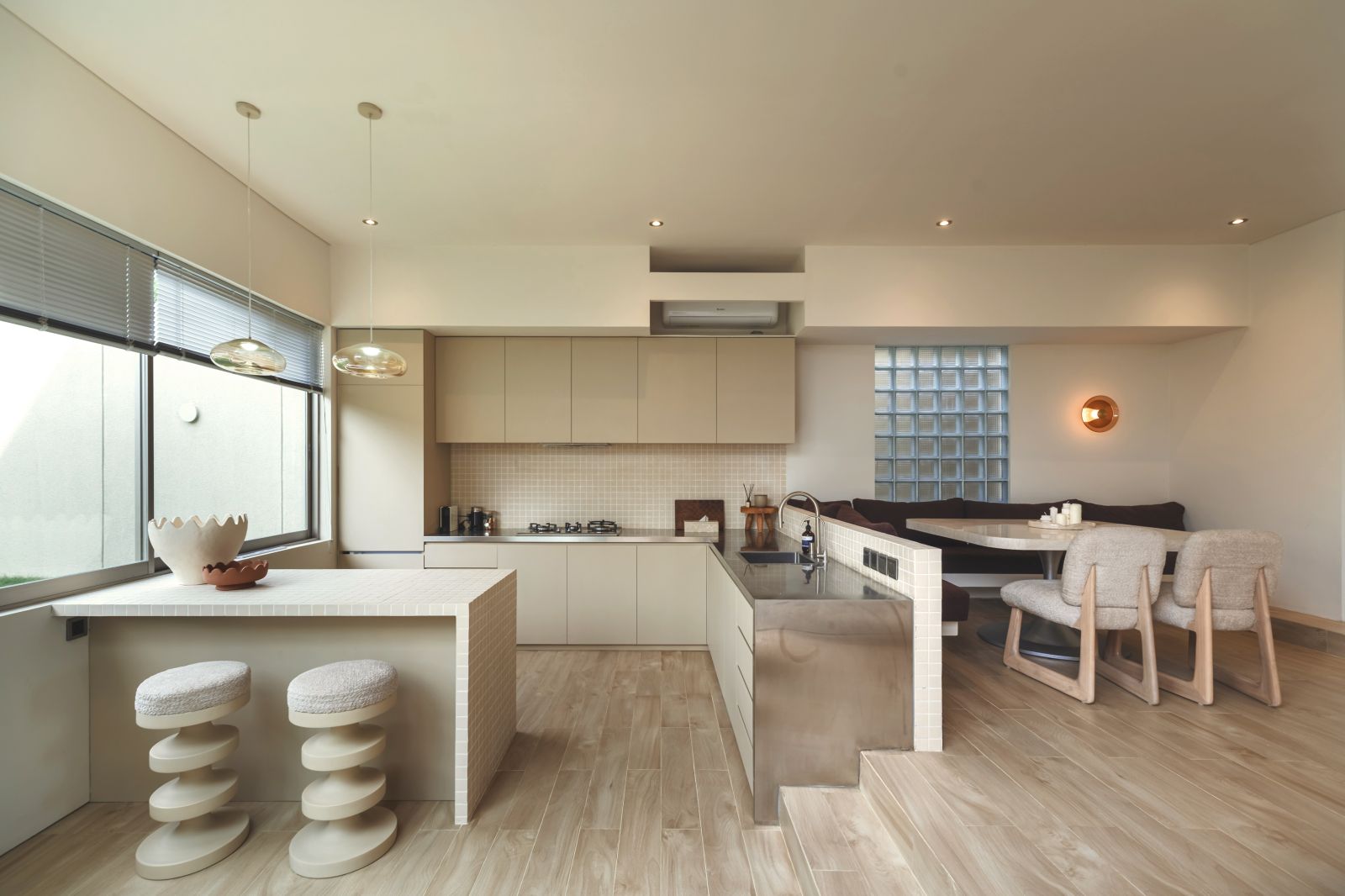 The house has two levels. On the ground floor is a dining area, a super modern kitchen with all amenities, and a pool with an outdoor lounge area. The second floor offers three bedrooms with ensuites.