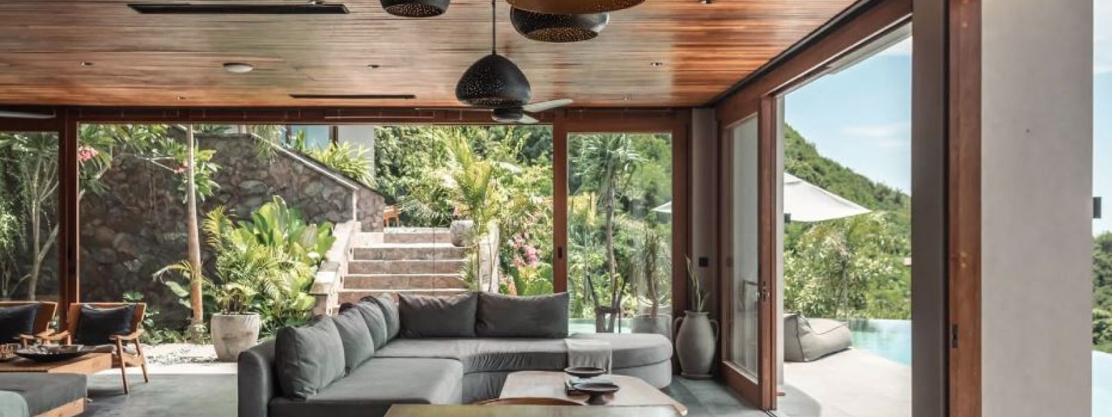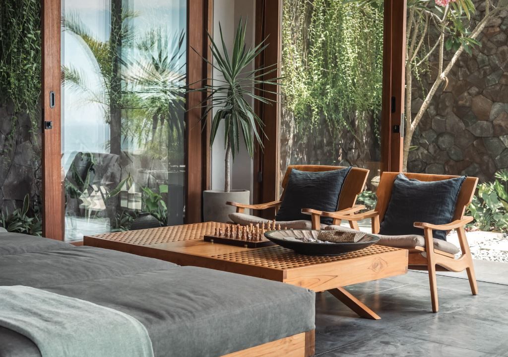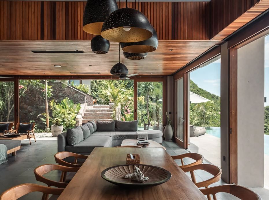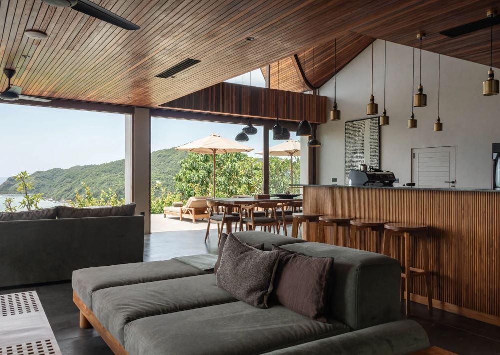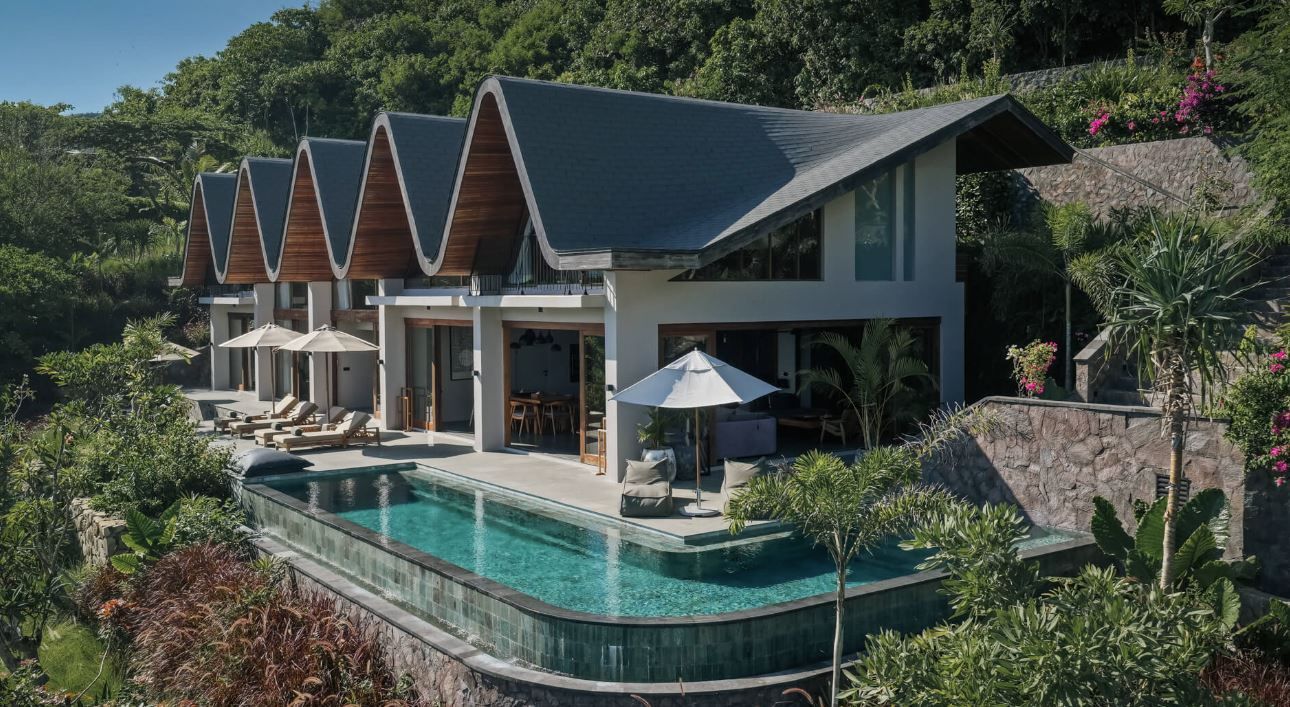 The villa includes five uniquely styled bedrooms, a private yoga facility, a spacious bar and dining area, multiple lounge areas, and a 65-sqm infinity pool. Additionally, there is a cinema room for movie viewing.