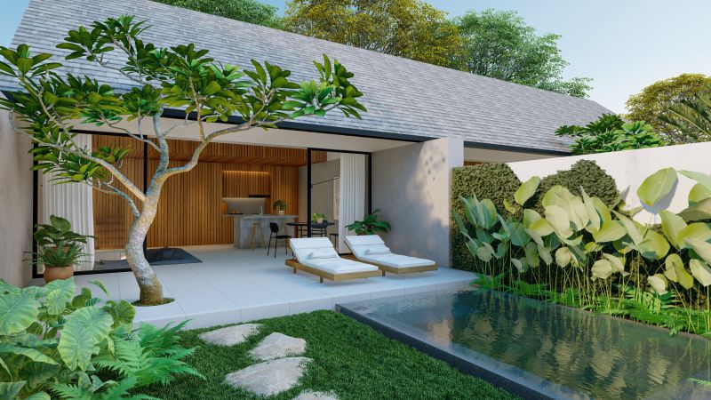 The illustration showcases a modern concrete structure with space. Access to the villa is provided through a private parking drop-off, with a pool overlooking a scenic rice field in the background. Renderings of the design exhibit expansive windows that allow ample natural light to illuminate the interiors.